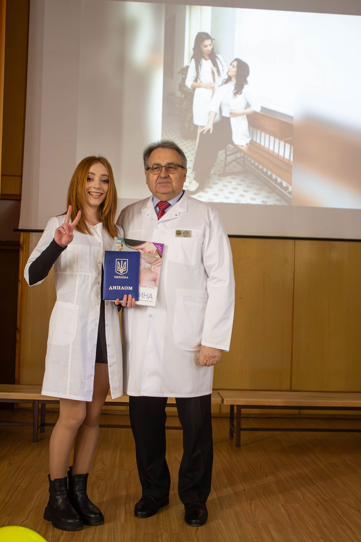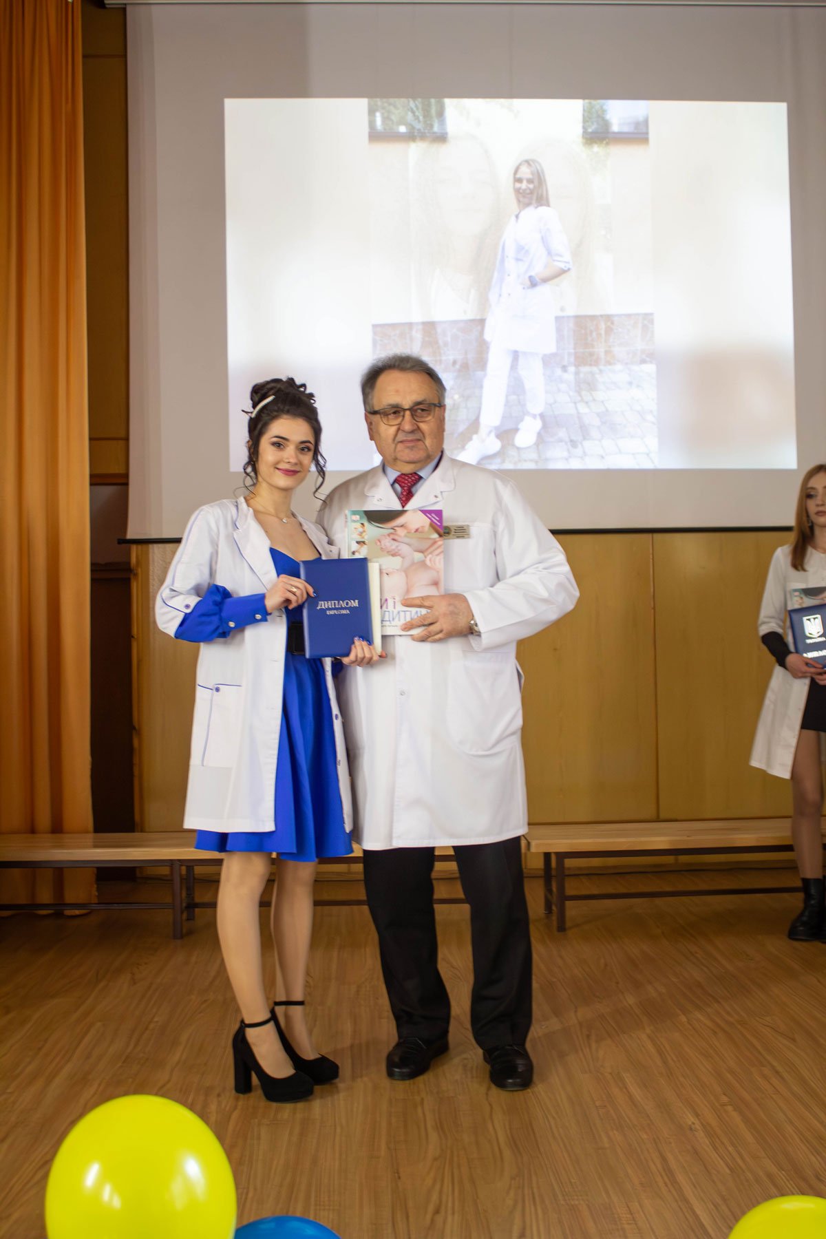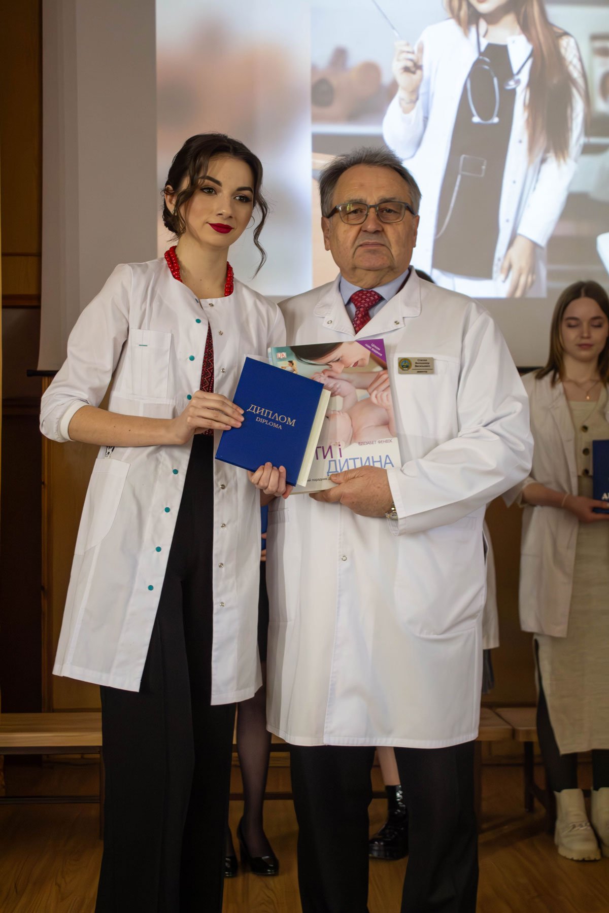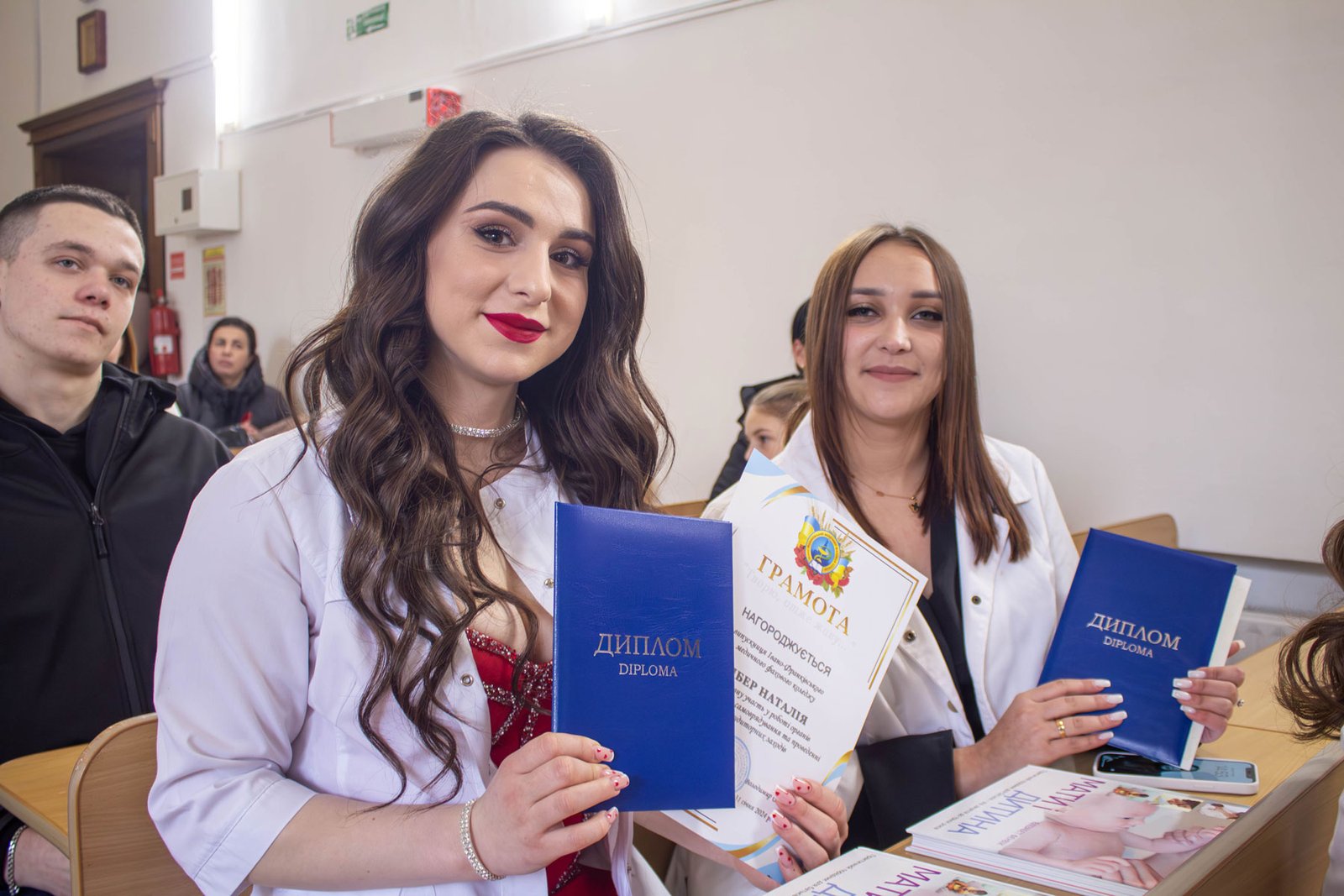 Наказ про вручення дипломів фахових молодших бакалаврів зачитувала заступниця директора з навчально-методичної роботи Ірина Іванівна Гафійчук, а дипломи вручали директор ІФМФК Володимир Васильович Стасюк і заступниця директора з виховної роботи Наталія Валеріївна Мальованчук. Дипломи отримали 23 випускники. І кожному у подарунок – книга «Мати і дитина». Для майбутніх акушерок такий подарунок символічний і корисний.