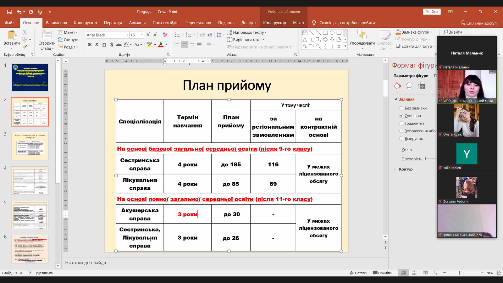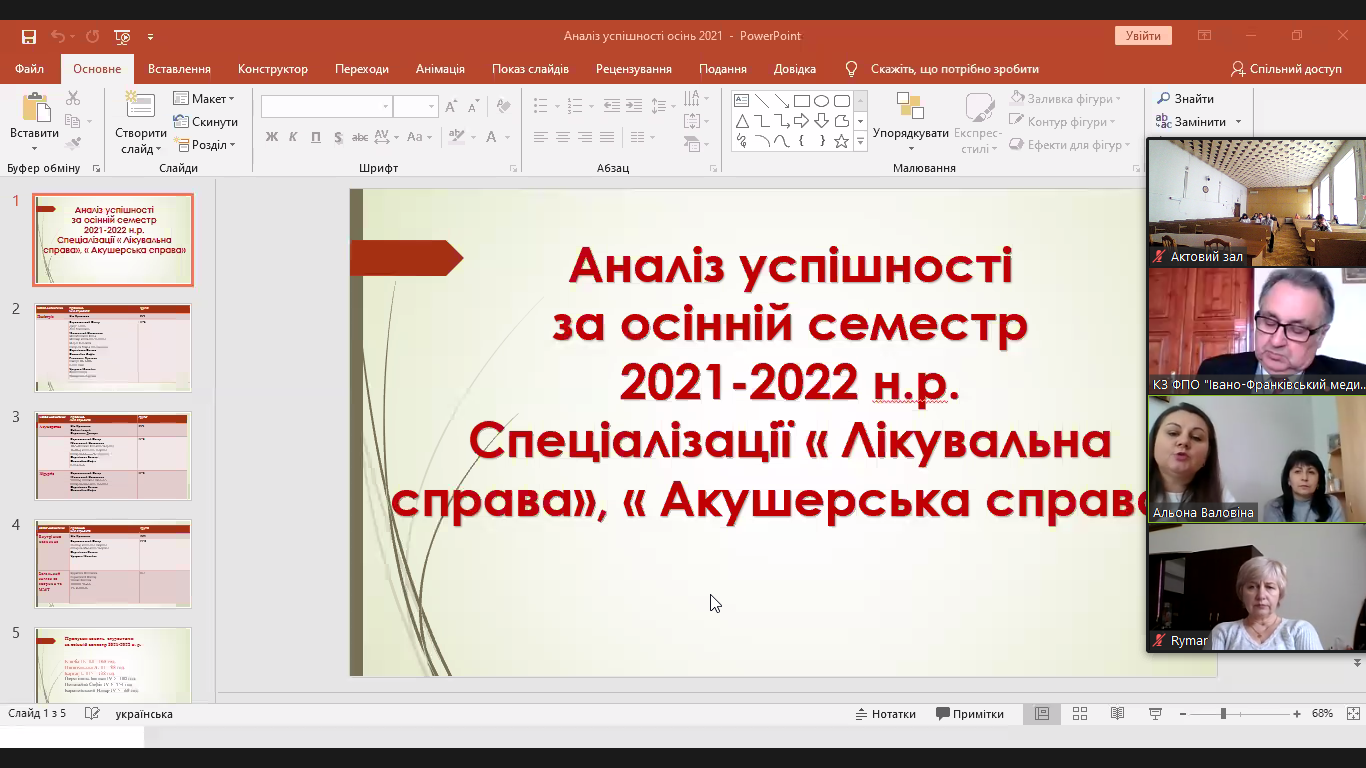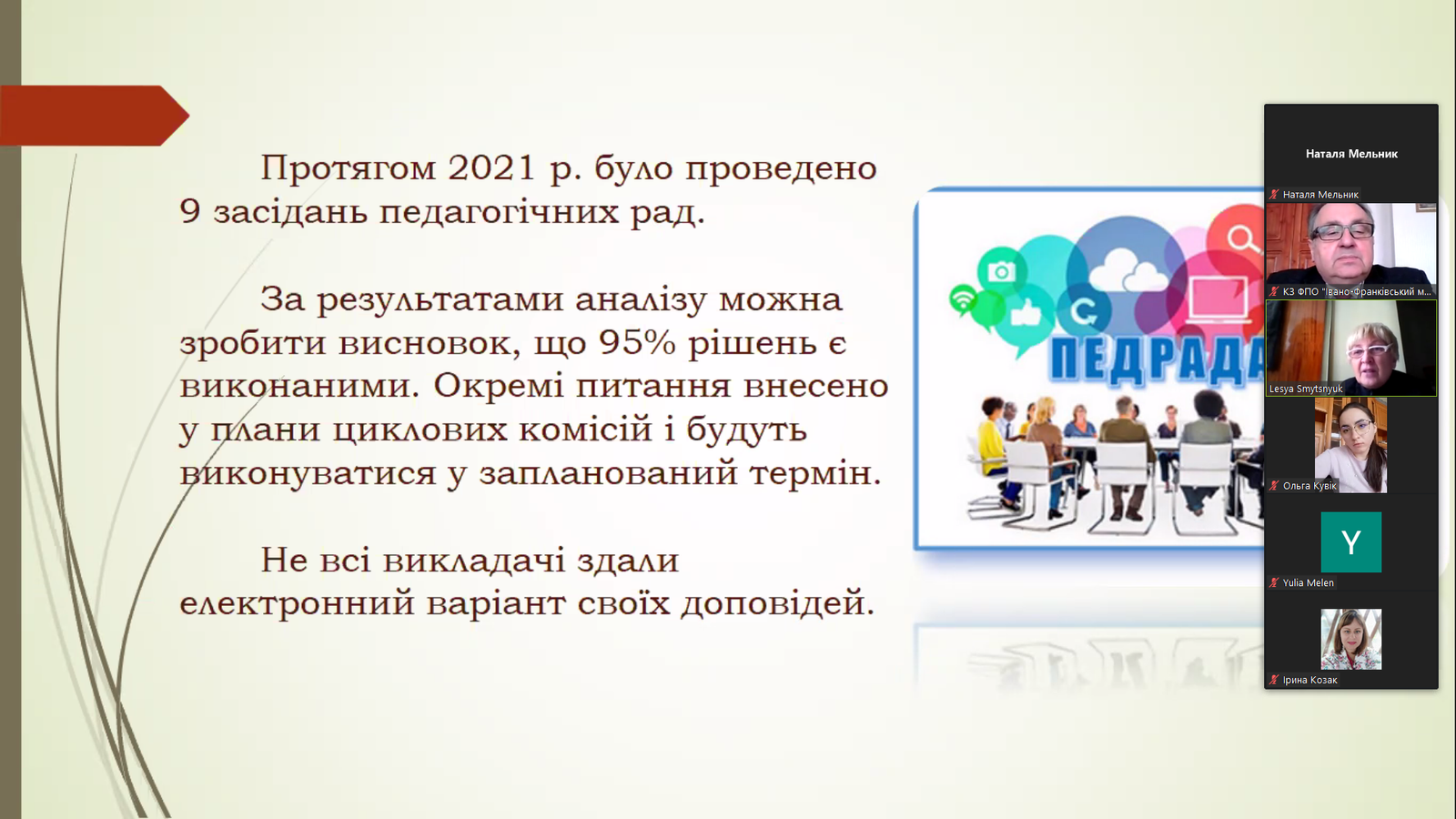 А основним питанням був аналіз успішності за осінній семестр 2021-2022. Такий аналіз окремо по всіх курсах провели завідувачки відділень Альона Миколаївна Валовіна, Мирослава Василівна Вацеба і Олеся Василівна Сухоручко.