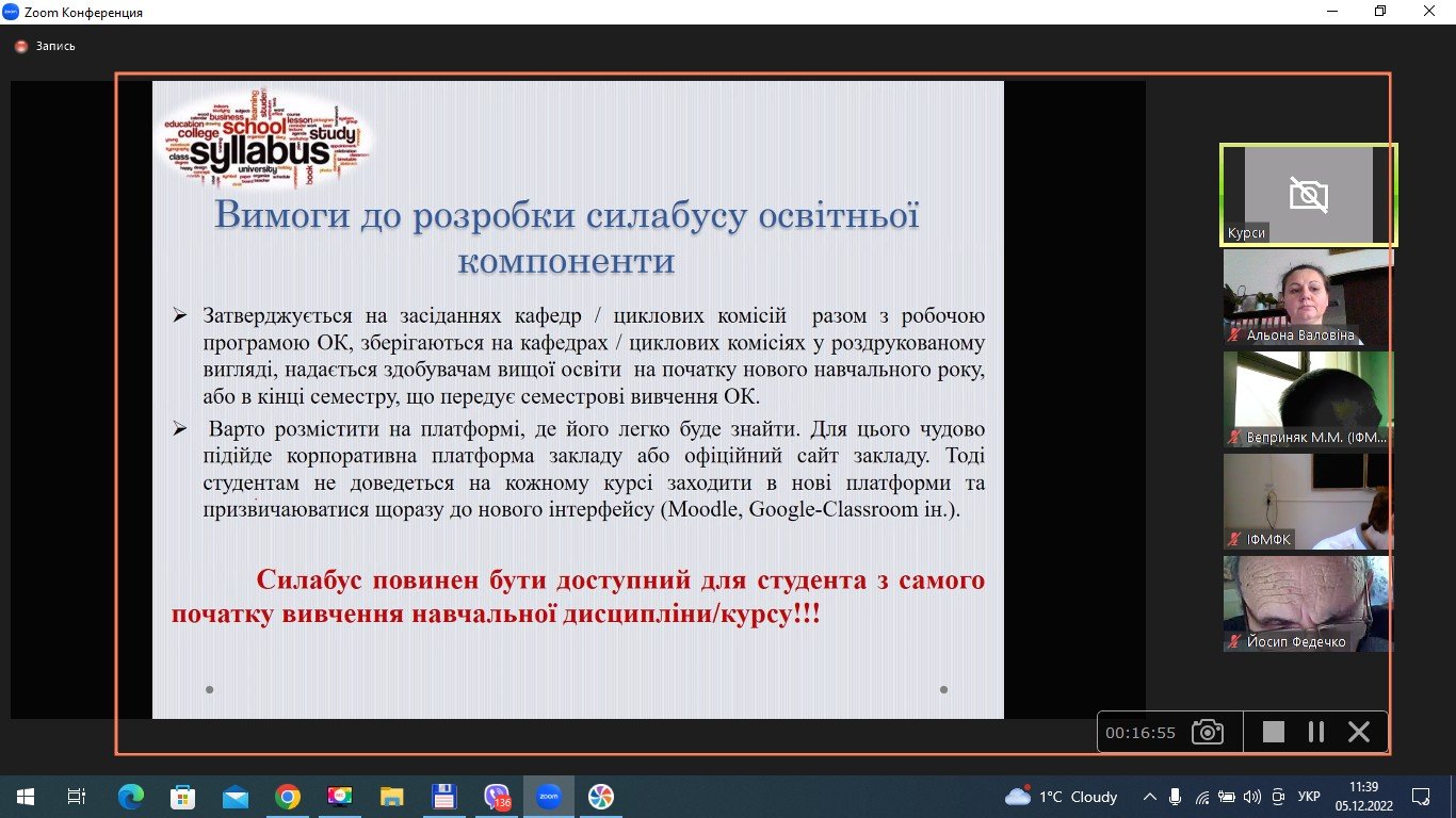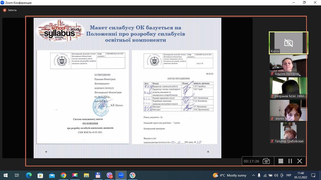 Тематичне удосконалення викладачів закладів медичної освіти «Інноваційні технології у вищій медичній освіті з формування професійної майстерності через компетентнісну складову. Теорія і методика викладання освітніх дисциплін» відбувається за 30-годинною програмою (1 кредит ЄКТС). Навчання проходить у дистанційному форматі на платформі Zoom.