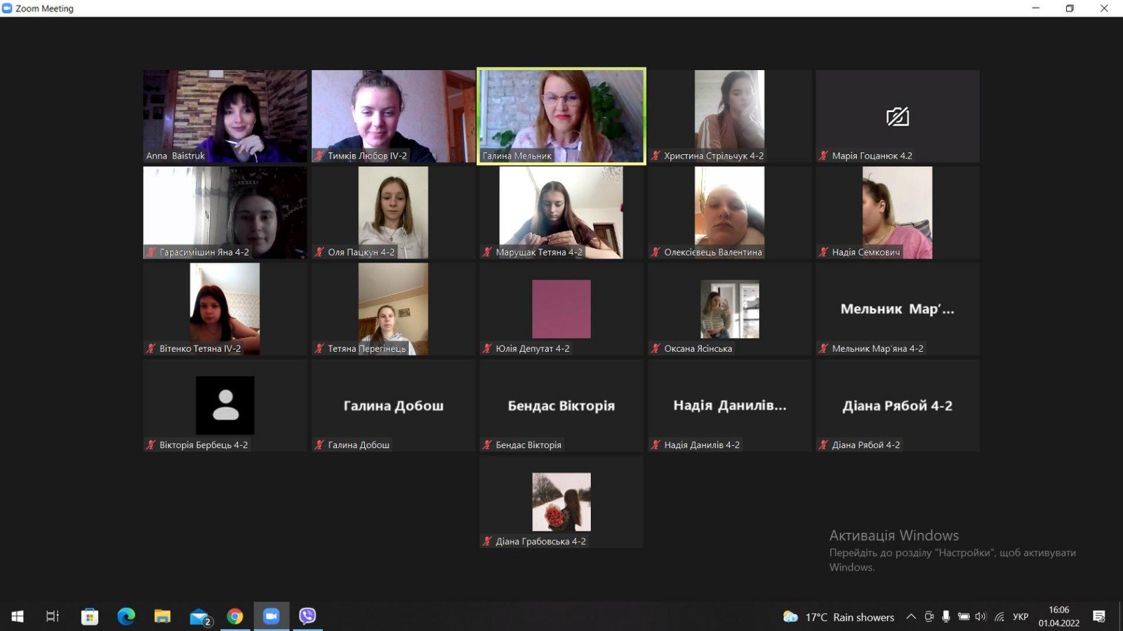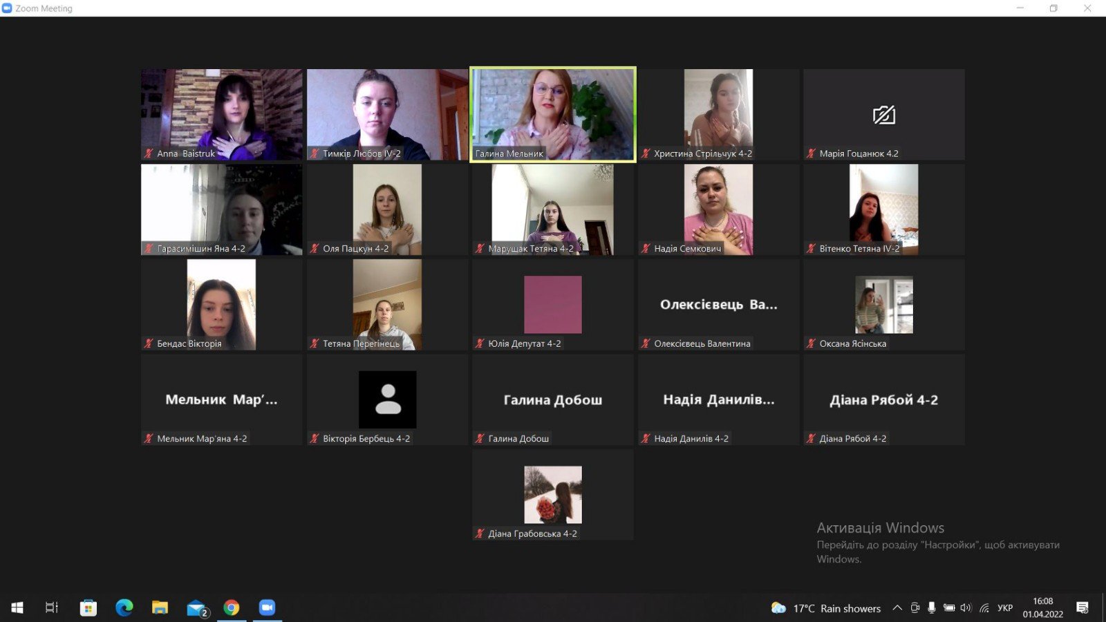 У групі IV-2 спеціалізації «Сестринська справа» Івано-Франківського медичного фахового коледжу вдруге відбулося онлайн-спілкування з психологинею Галиною Мельник. Основна увага була зосереджена на практиках і вправах для виходу зі стресу.