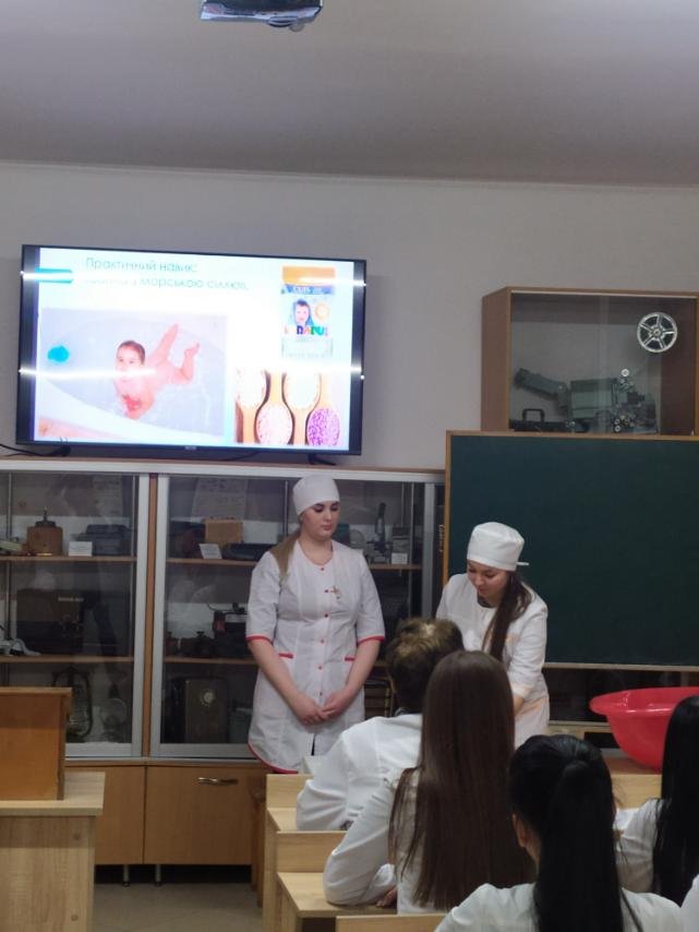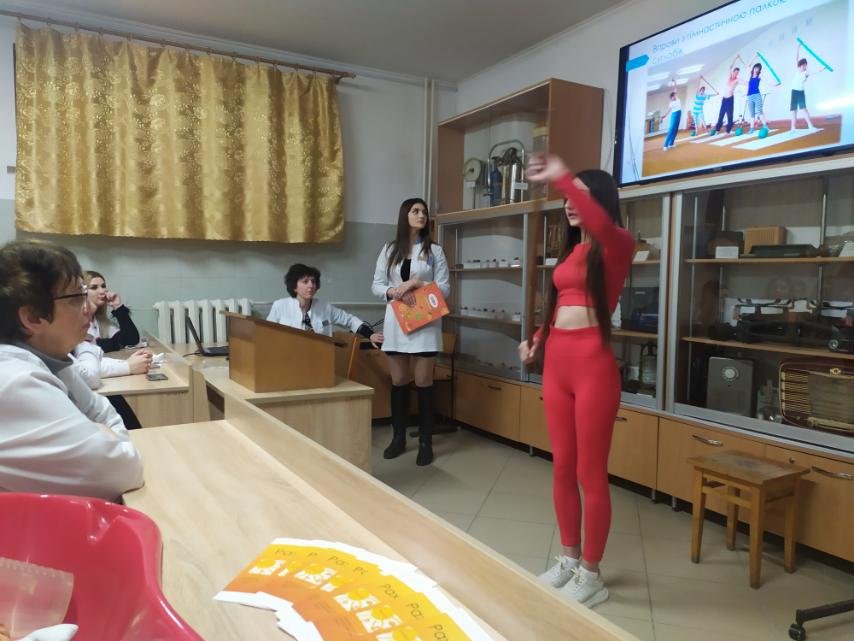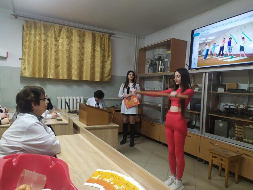 Студенти ІV к. 2 Б групи спеціалізації "Сестринська справа" (викладач Шибак М.І.) ознайомили присутніх з методикою проведення ЛФК та масажу дітей, хворих на рахіт, у різні періоди захворювання, а також продемонстрували комплекси вправ для реабілітації дітей з аномаліями постави.