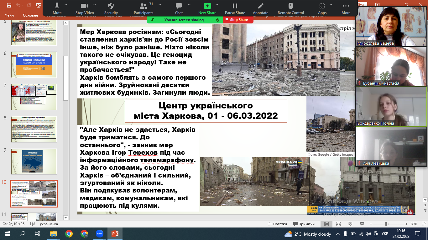 Сьогодні заняття у коледжі, незалежно від навчальної дисципліни, викладачі розпочинали зі слів «рік тому…», згадуючи 24 лютого 2022-го і розповідаючи про незламність України, героїзм її захисників. А студенти підготували фотовиставку «Моя нескорена Україна», яка розгорнута на першому поверсі адміністративного приміщення ІФМФК.