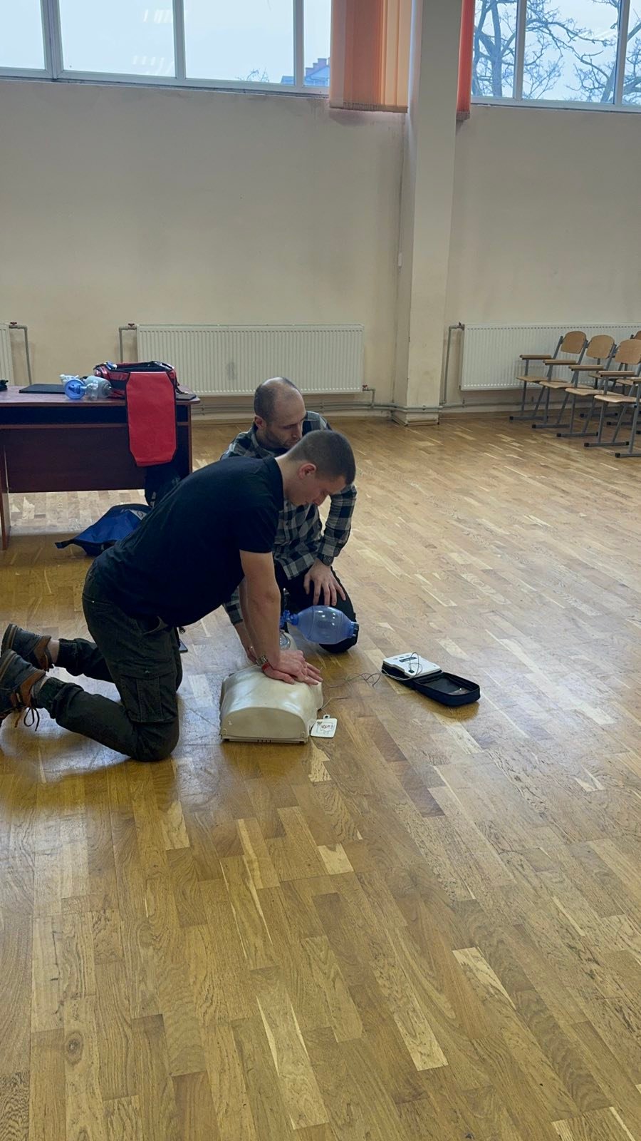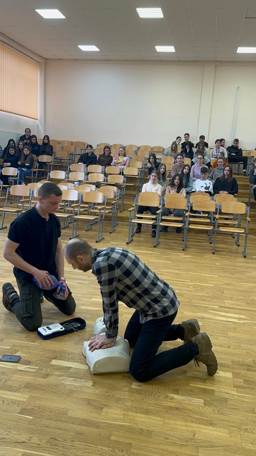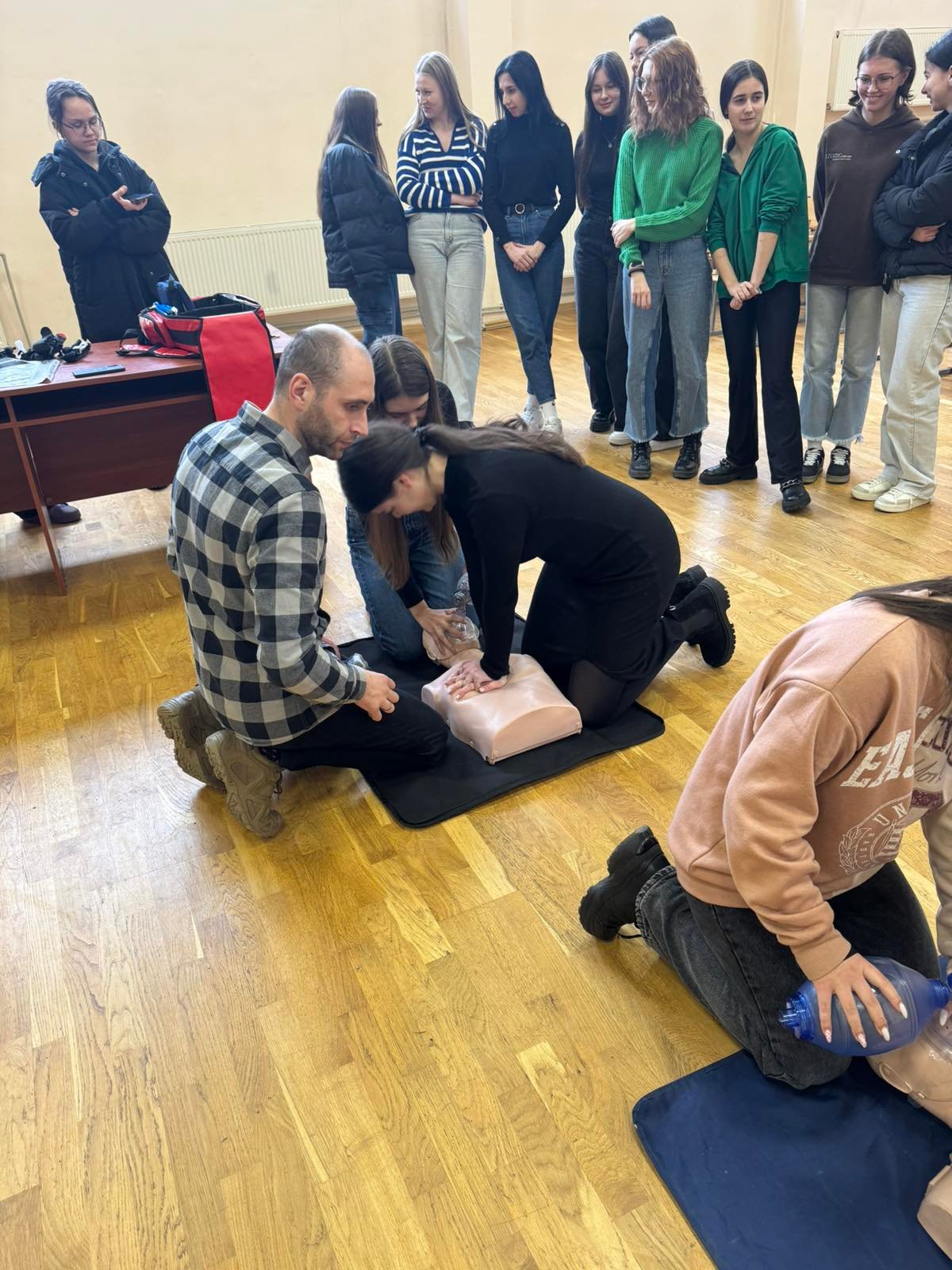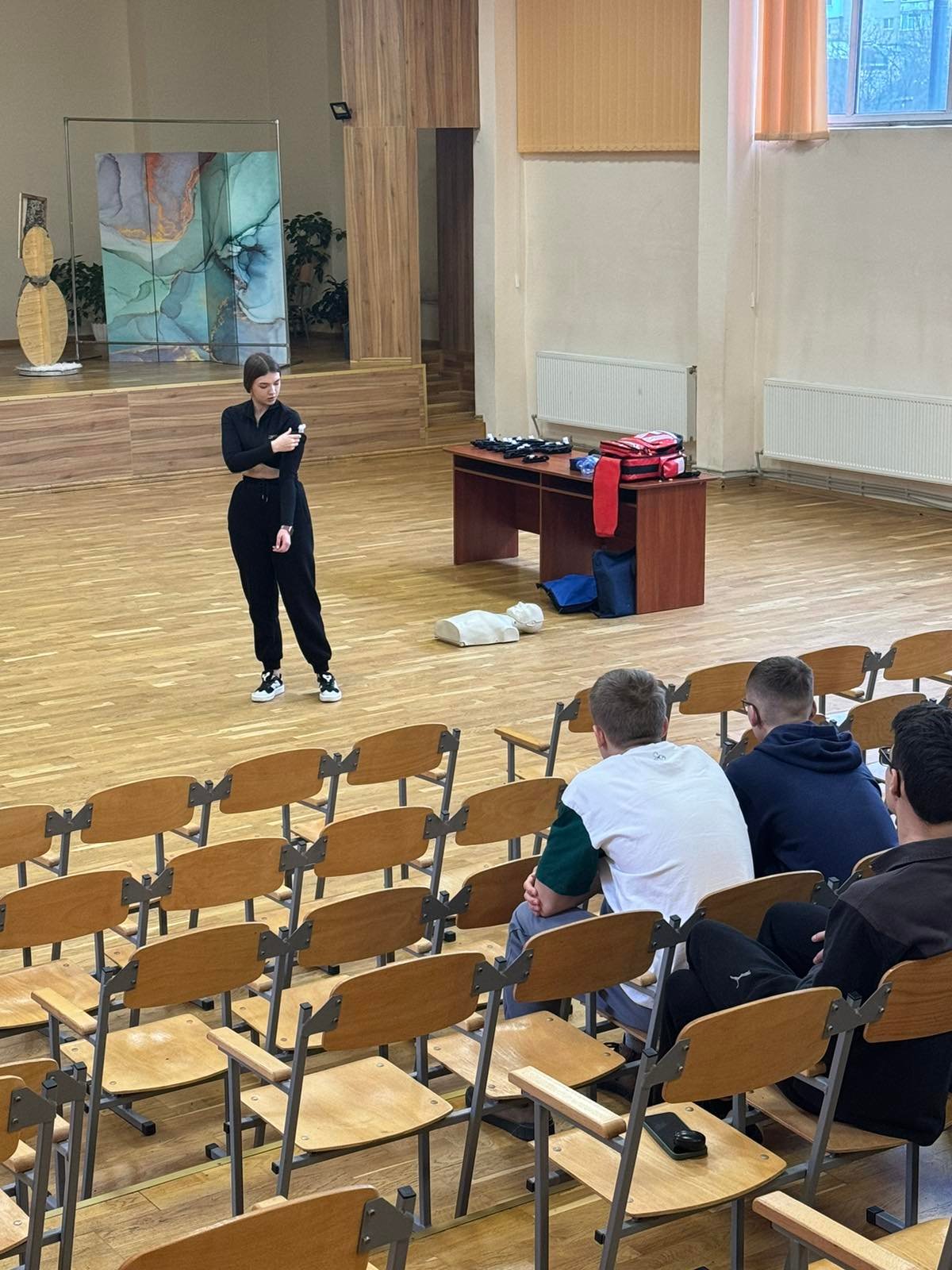 Перше заняття в ліцеї № 18 провів викладач хірургічних дисциплін, інструктор військово-медичної допомоги формату TCCC Володимир Миколайович Яцків, а допомагали йому студенти ІФМФК. Під час тренінгу успішно відпрацювали навички зупинки критичних кровотеч, а також ефективної допомоги потерпілому без ознак життя. Ліцеїстам розказали і показали непрямий масаж серця, дихальну реанімацію, мішком Амбу, роботу з АЗД.