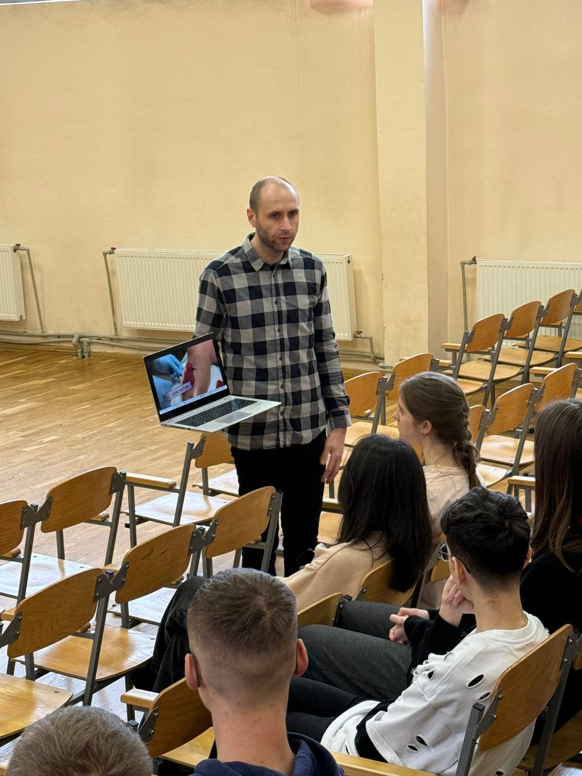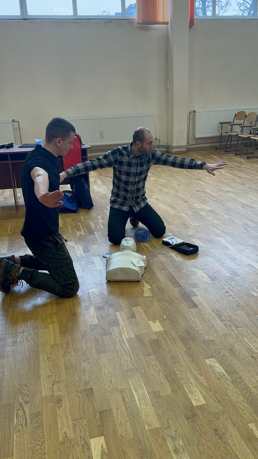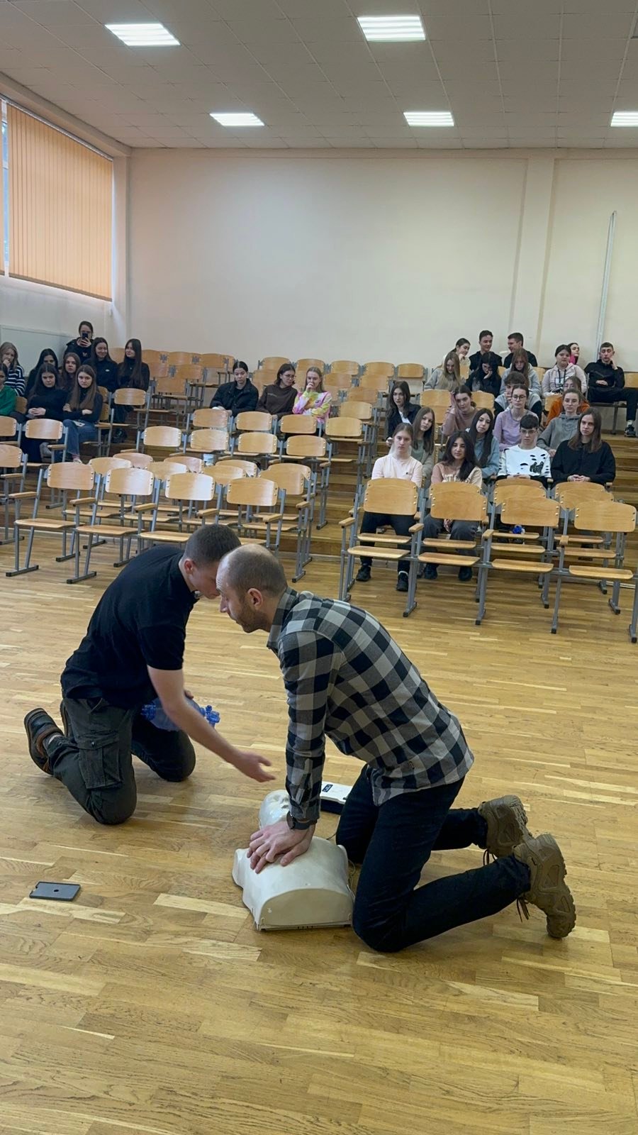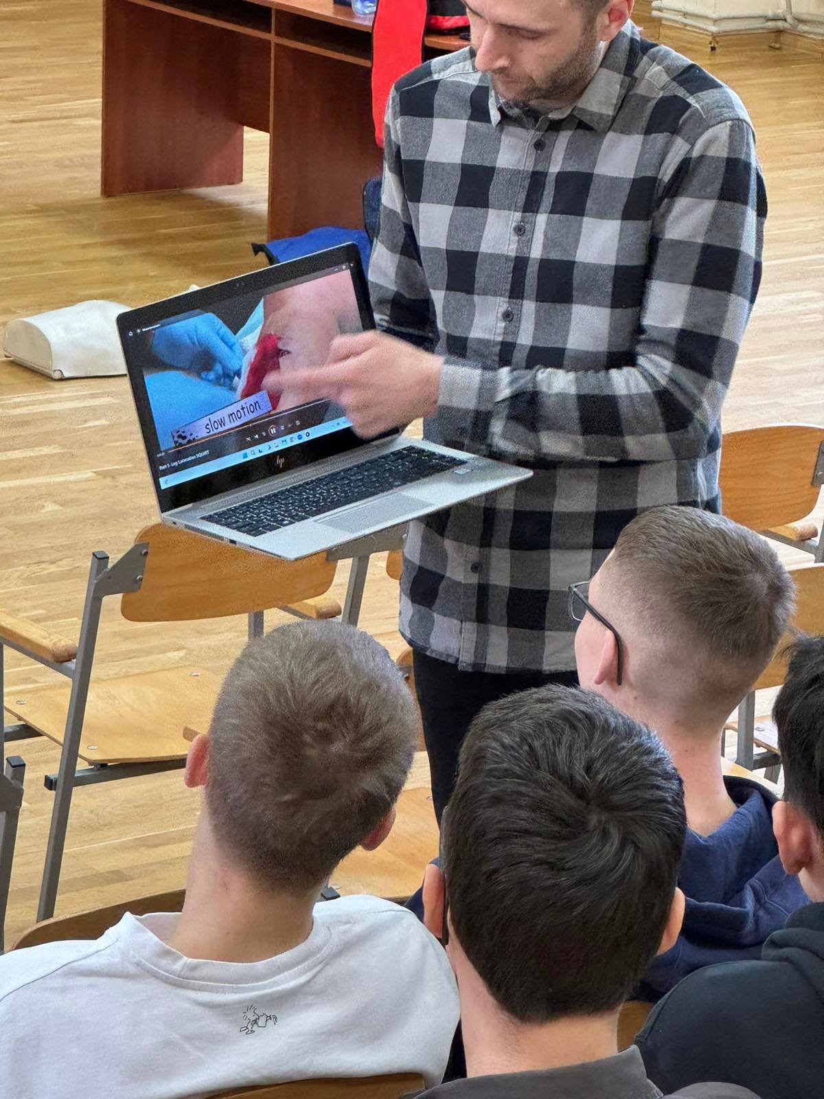 Перше заняття в ліцеї № 18 провів викладач хірургічних дисциплін, інструктор військово-медичної допомоги формату TCCC Володимир Миколайович Яцків, а допомагали йому студенти ІФМФК. Під час тренінгу успішно відпрацювали навички зупинки критичних кровотеч, а також ефективної допомоги потерпілому без ознак життя. Ліцеїстам розказали і показали непрямий масаж серця, дихальну реанімацію, мішком Амбу, роботу з АЗД.