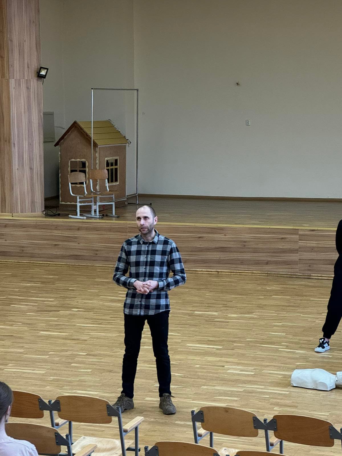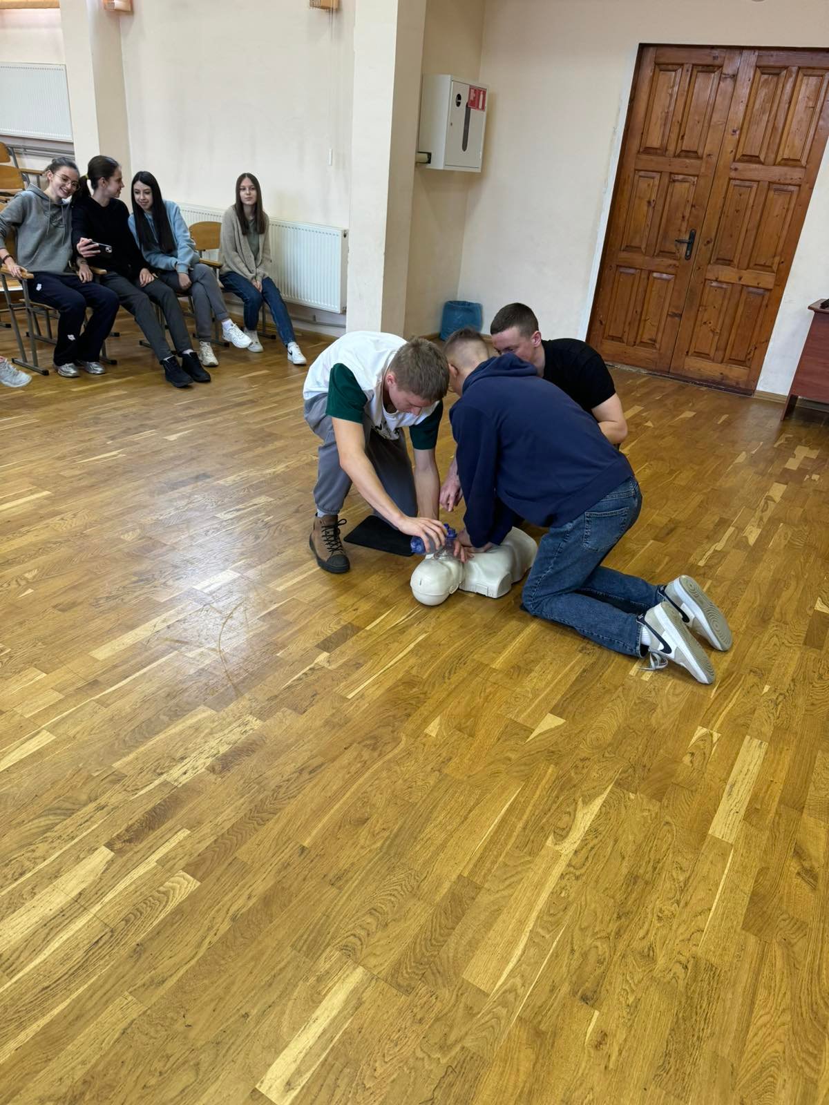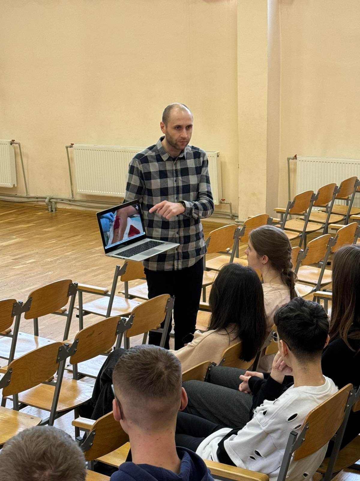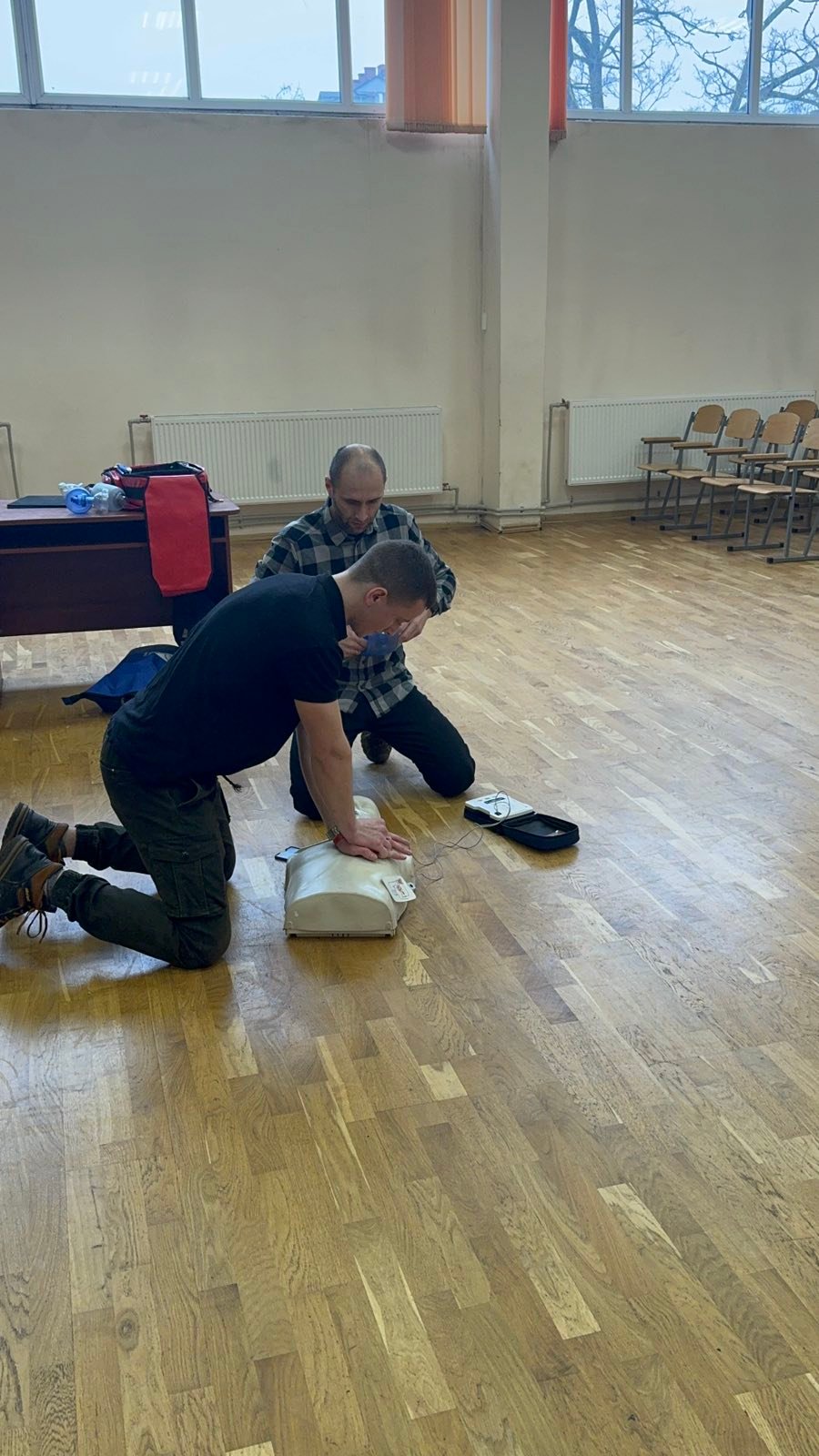 Перше заняття в ліцеї № 18 провів викладач хірургічних дисциплін, інструктор військово-медичної допомоги формату TCCC Володимир Миколайович Яцків, а допомагали йому студенти ІФМФК. Під час тренінгу успішно відпрацювали навички зупинки критичних кровотеч, а також ефективної допомоги потерпілому без ознак життя. Ліцеїстам розказали і показали непрямий масаж серця, дихальну реанімацію, мішком Амбу, роботу з АЗД.