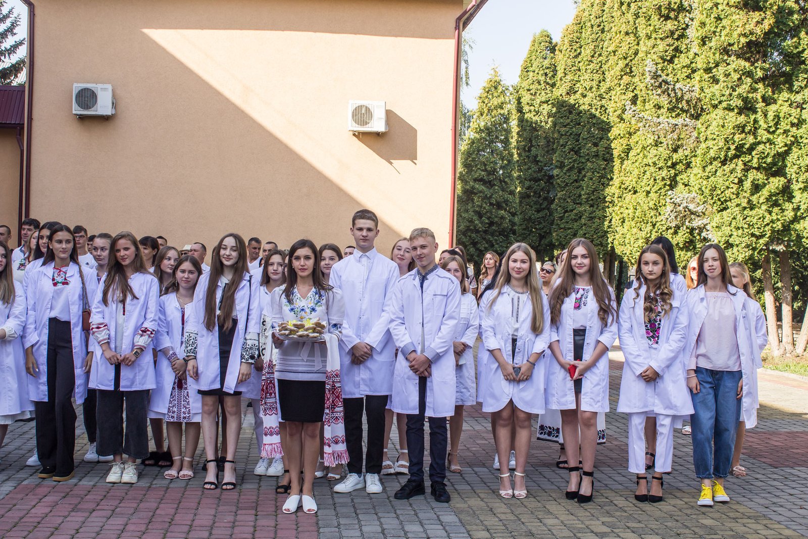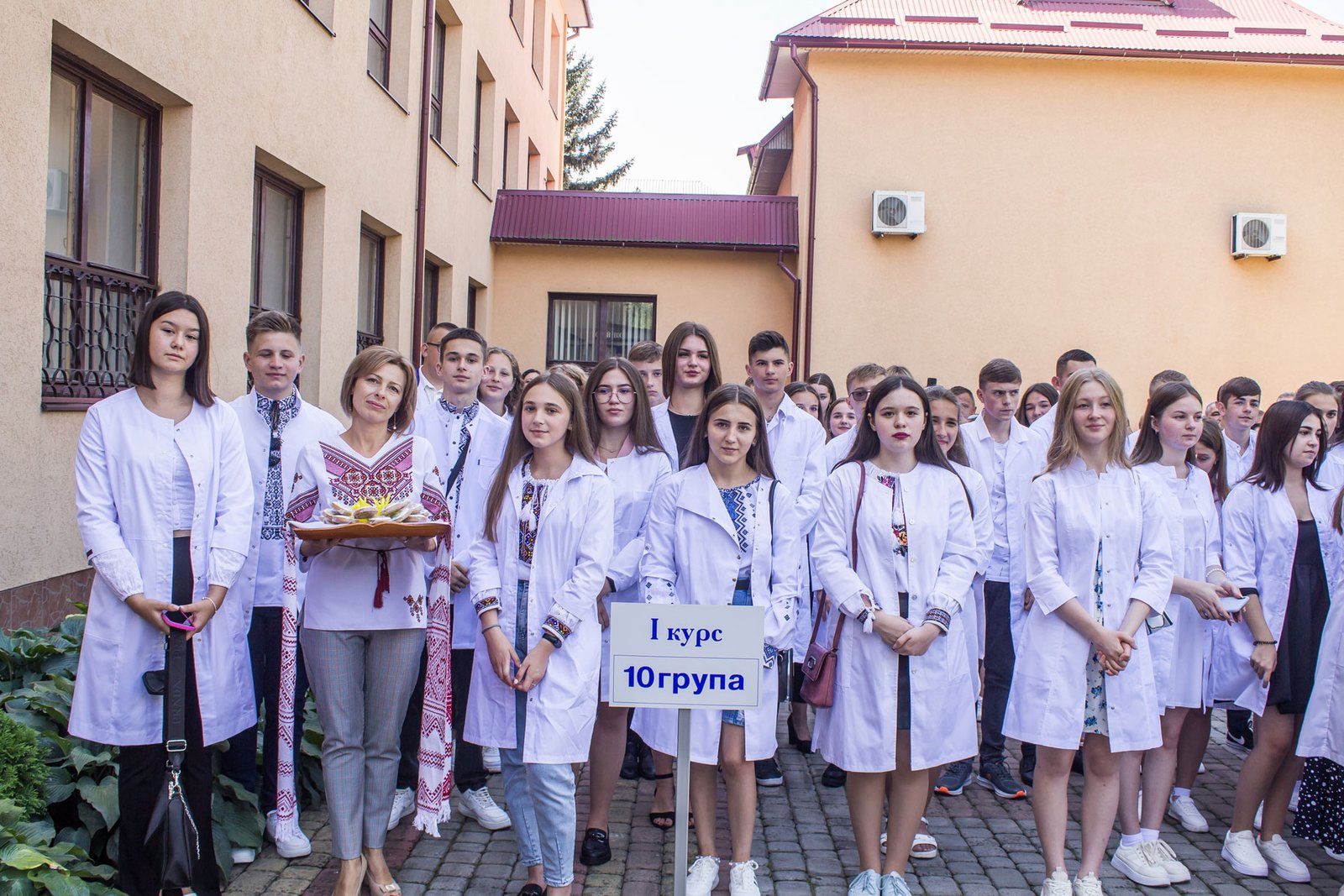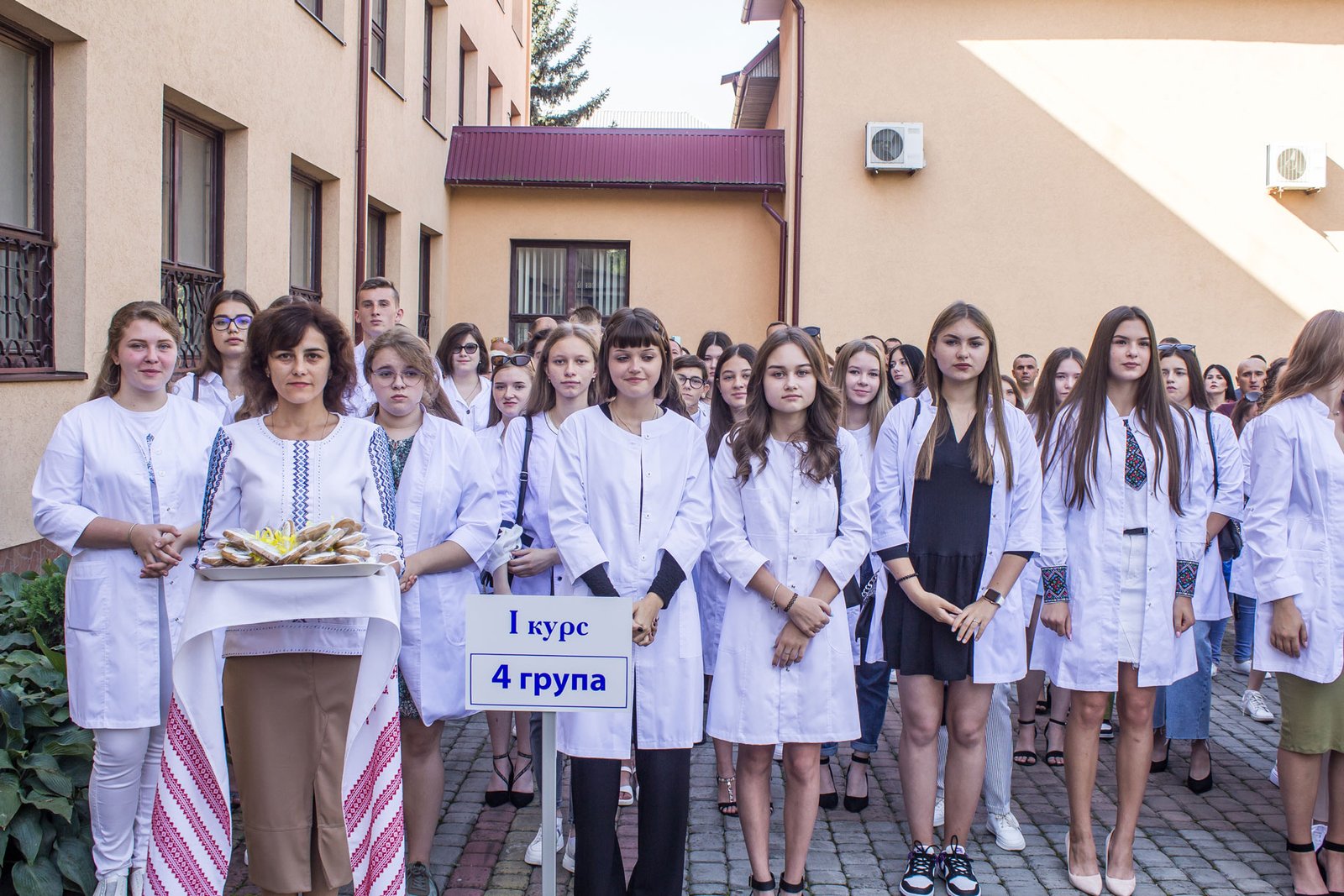 Через військовий стан посвяту в першокурсники довелося проводити у три етапи: 2, 3, 4 групи спеціалізації «Сестринська справа» зранку, потім 1, 5, 10 група спеціалізації «Лікувальна справа», і на завершення – 6, 8 групи спеціалізації «Сестринська справа». Виходили з того, щоб на випадок повітряної тривоги студентів і батьків змогли розмістити в укритті на нульовому поверсі. На щастя, в усіх трьох потоках обійшлося без сирен. Тож змогли провести захід на території коледжу перед входом в навчальний корпус.