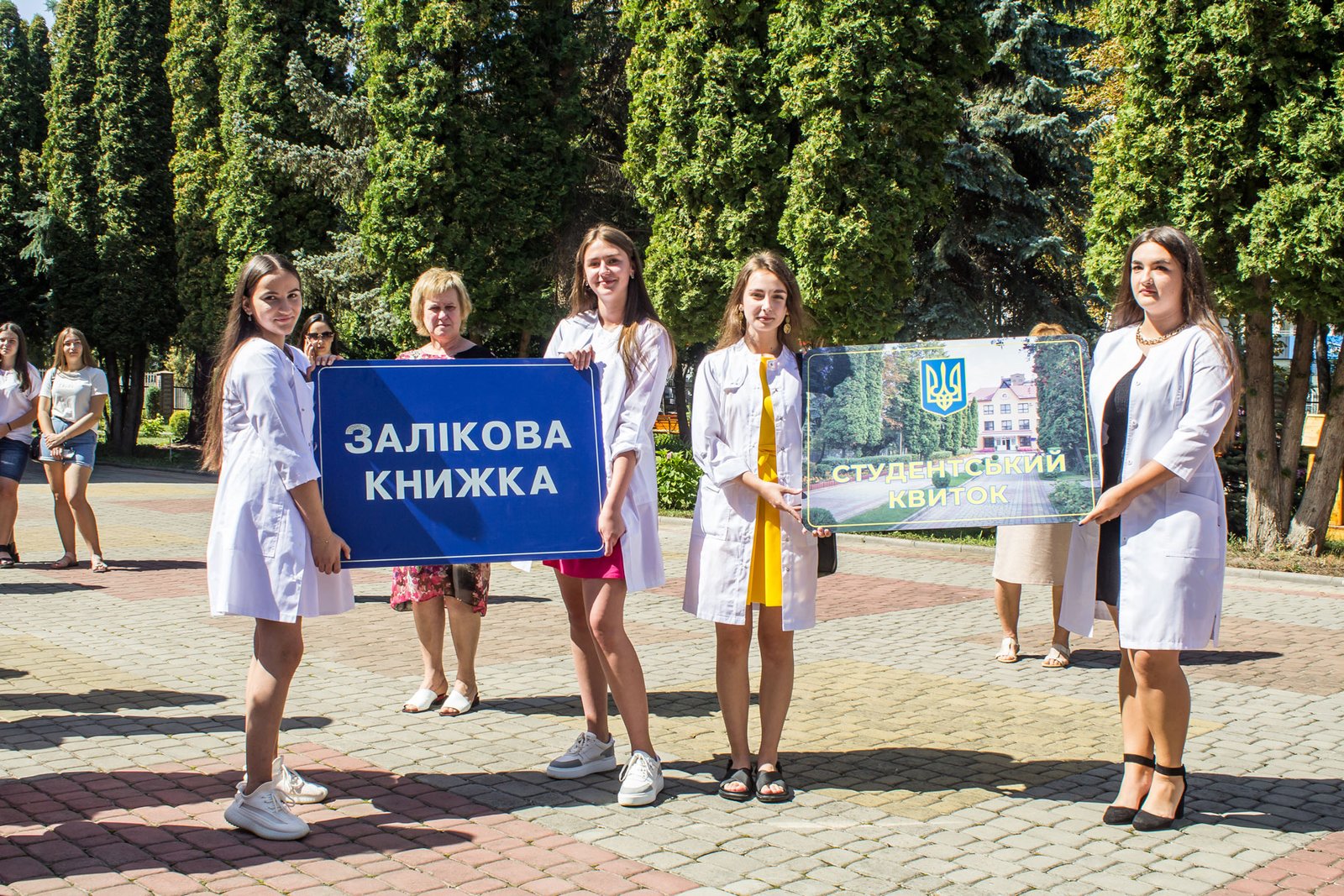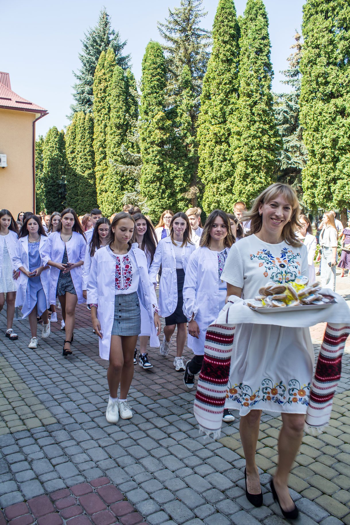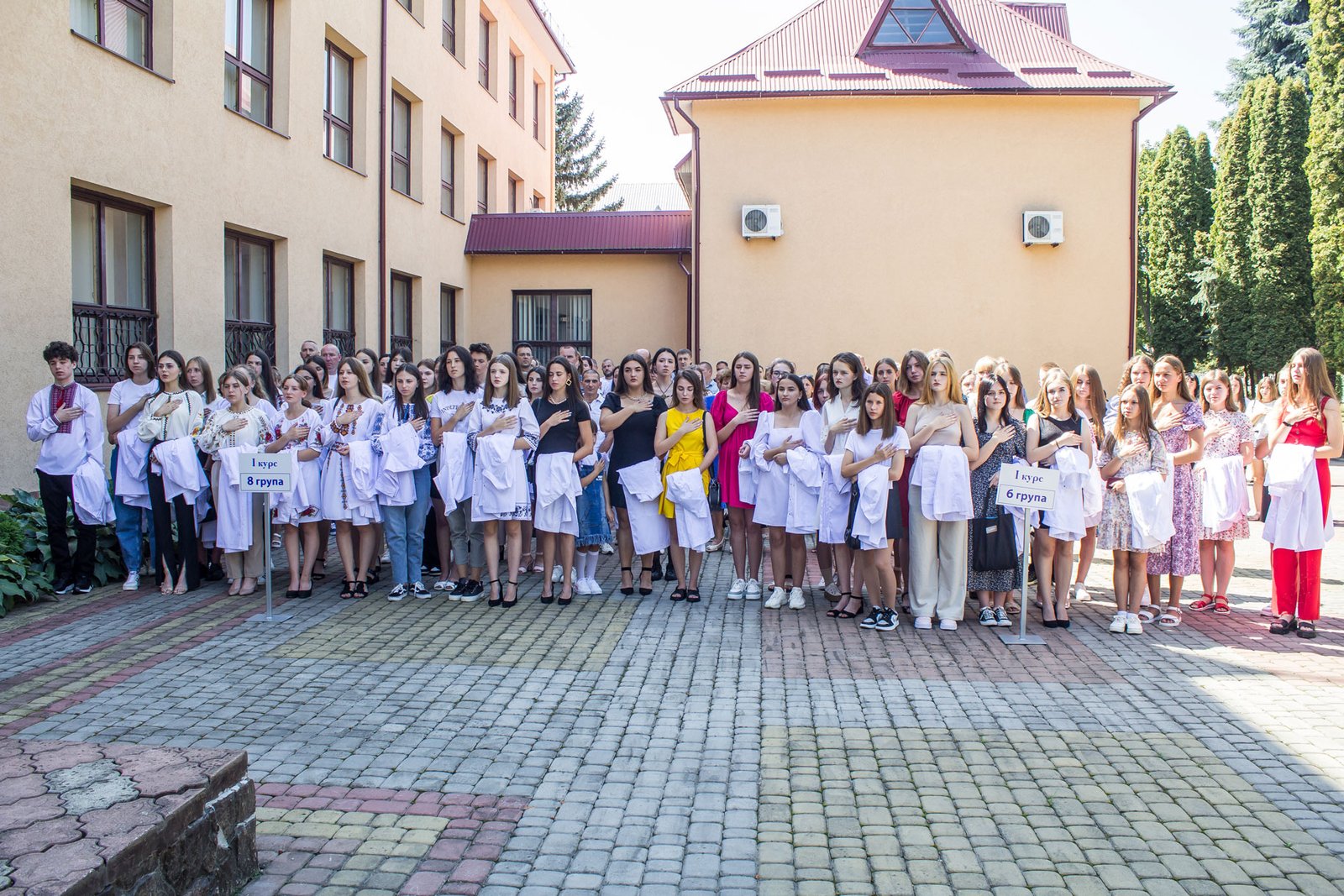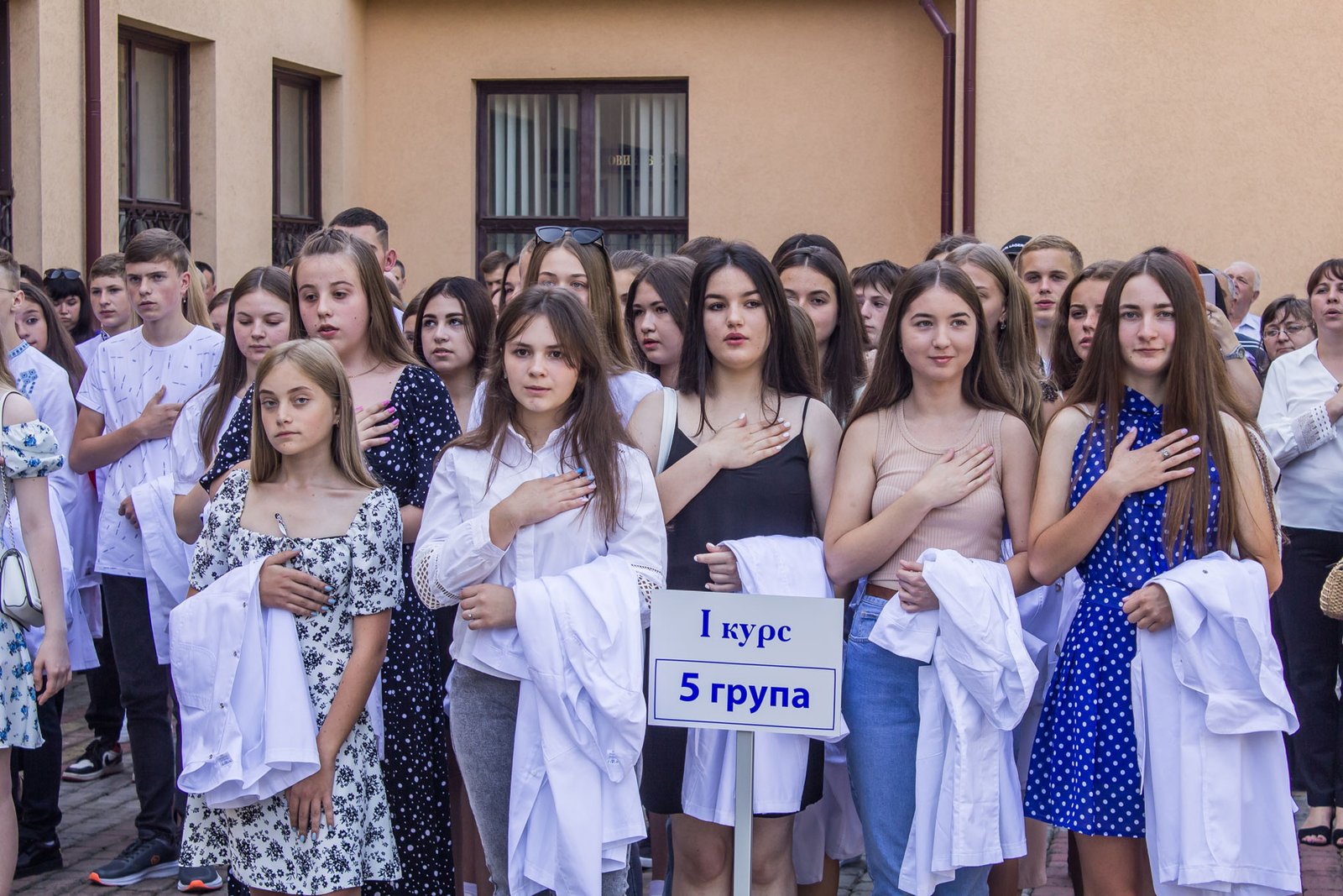 Через військовий стан посвяту в першокурсники довелося проводити у три етапи: 2, 3, 4 групи спеціалізації «Сестринська справа» зранку, потім 1, 5, 10 група спеціалізації «Лікувальна справа», і на завершення – 6, 8 групи спеціалізації «Сестринська справа». Виходили з того, щоб на випадок повітряної тривоги студентів і батьків змогли розмістити в укритті на нульовому поверсі. На щастя, в усіх трьох потоках обійшлося без сирен. Тож змогли провести захід на території коледжу перед входом в навчальний корпус.