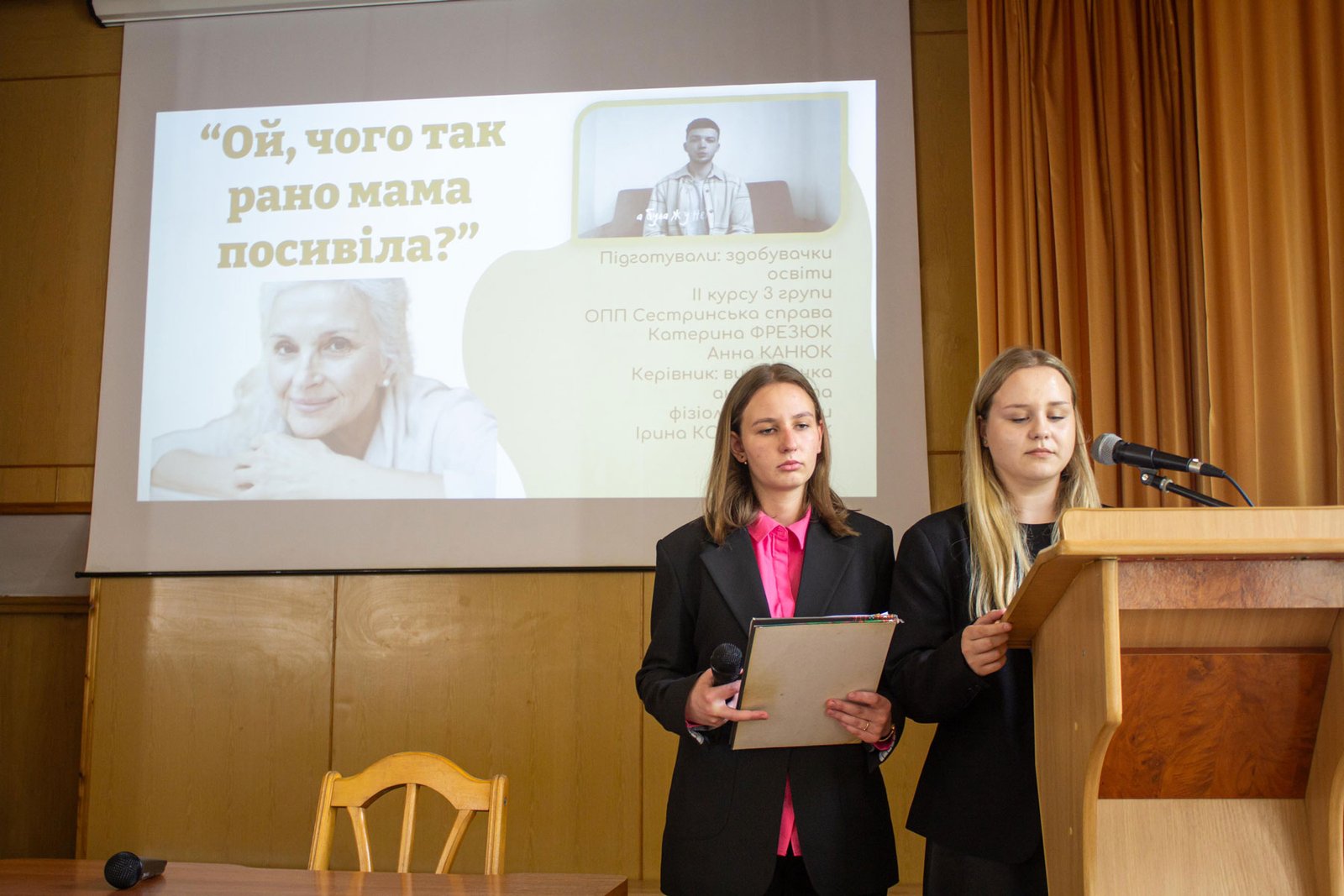 Оригінальною, навіть інтригуючою була тема роботи, яку виконали студентки групи ІІ-3 Катерина Фрезюк і Анна Канюк під керівництвом Ірини Константюк, “Ой чого так рано мама посивіла”. А йшлося в ній про причини появи сивини, особливо ранньої, про вплив на це стресів.
