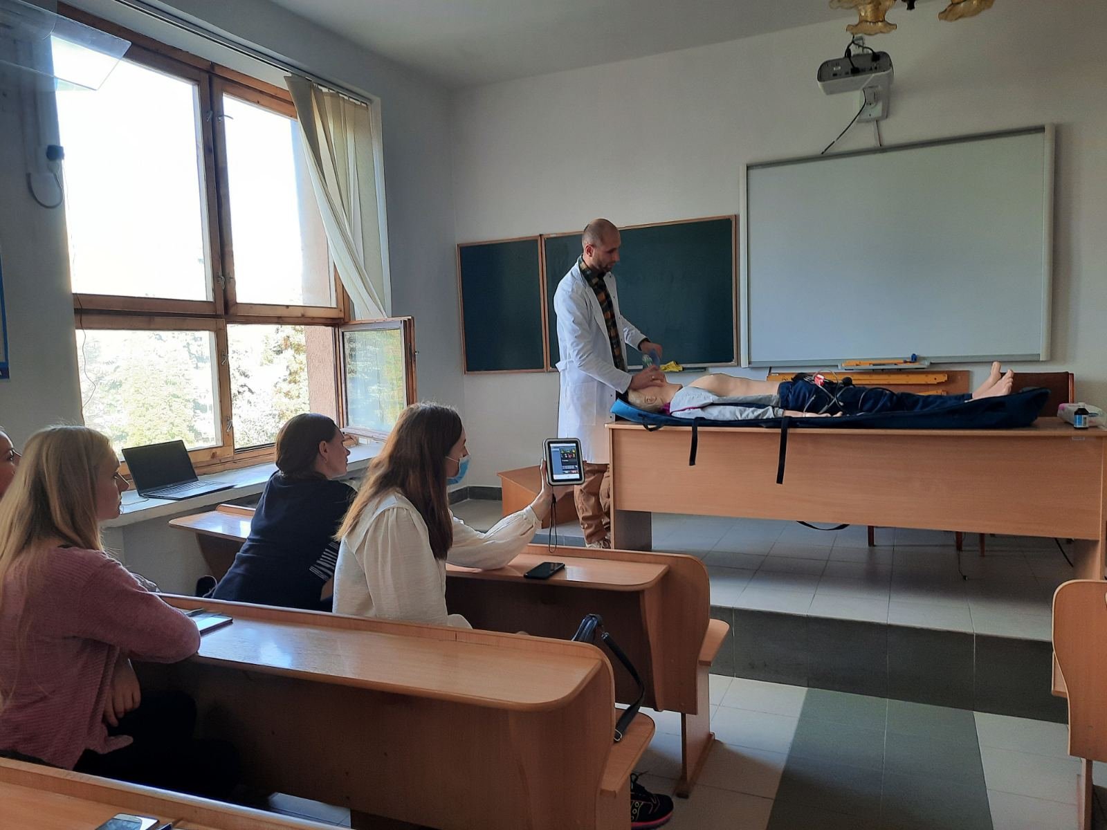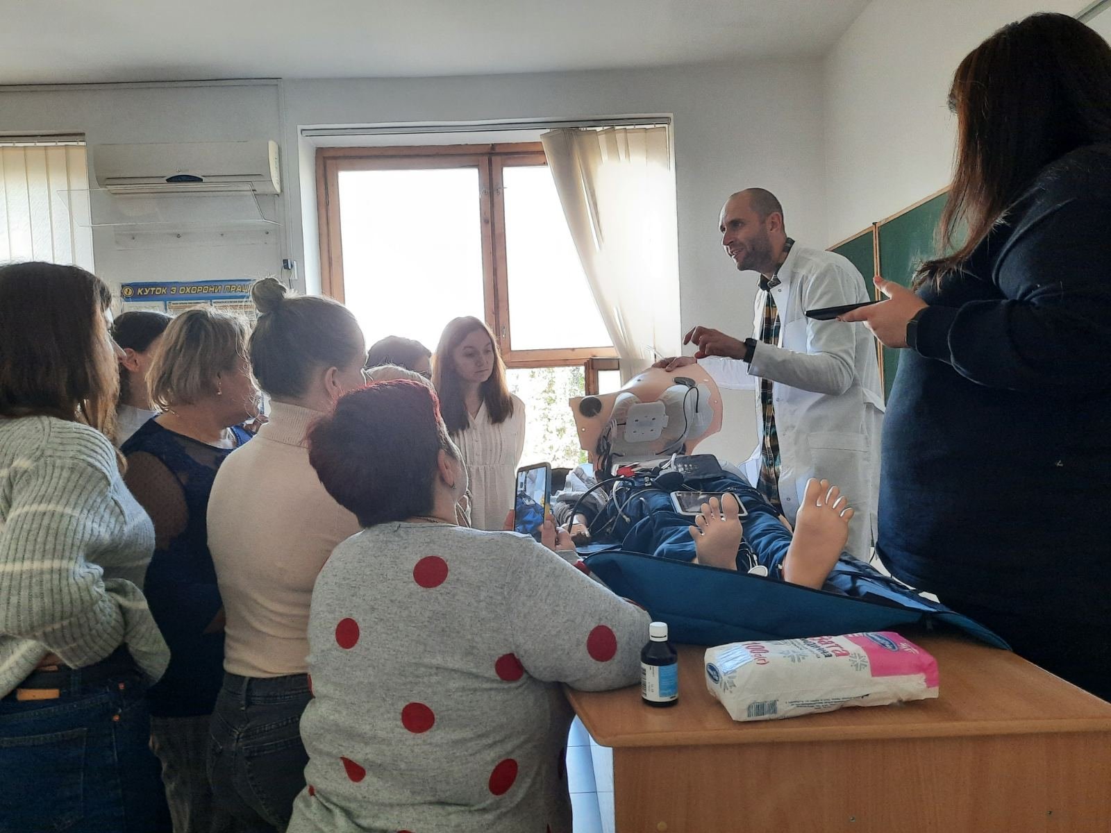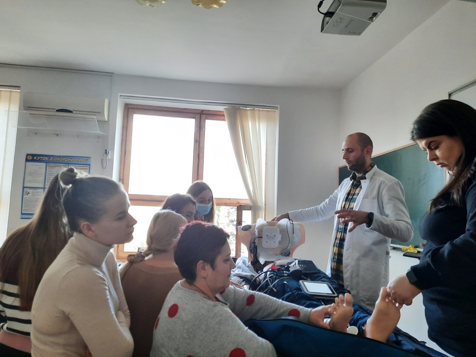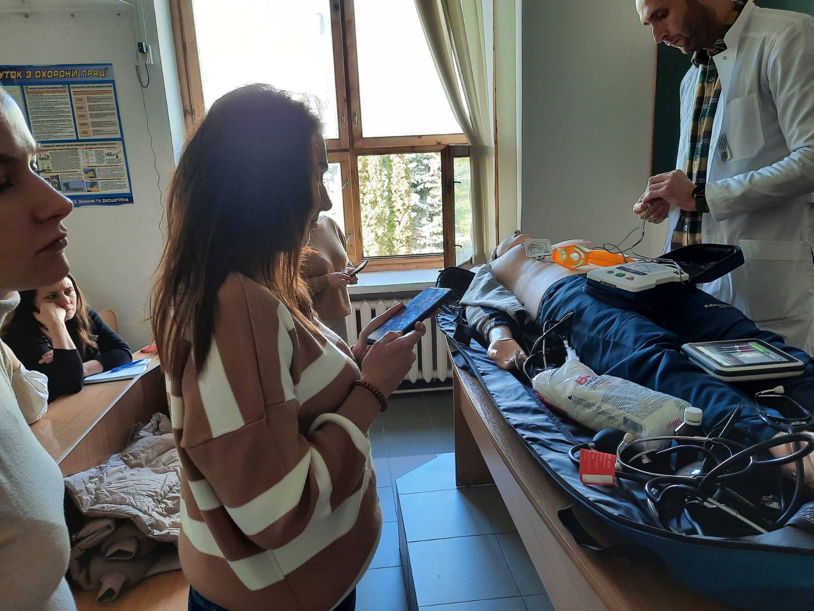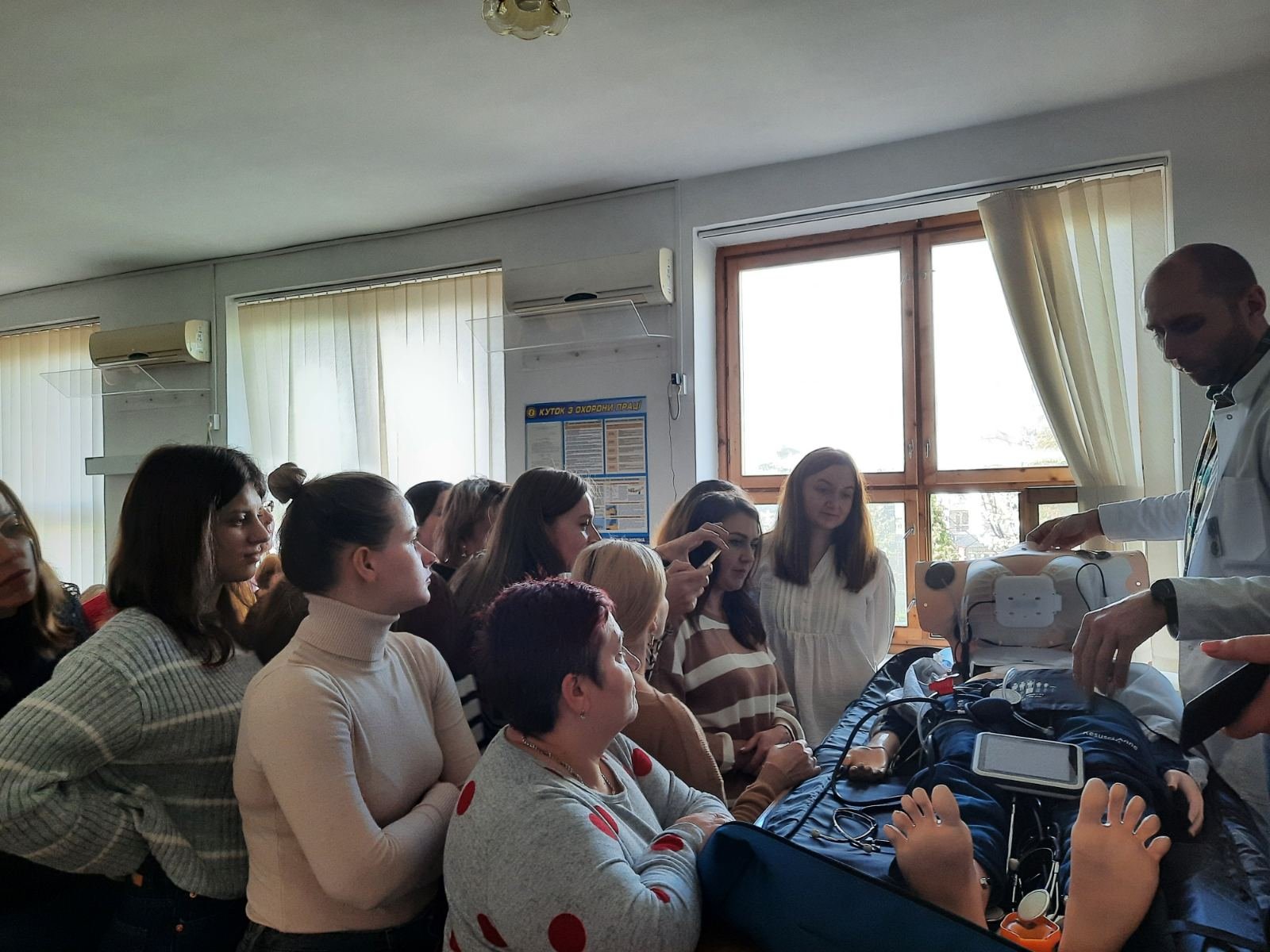 Голова циклової комісії хірургічних дисциплін Володимир Миколайович Яцків під час навчального тренінгу відпрацював із слухачами практичні навички на реанімаційному тренажері-симуляторі, який коледж отримав у подарунок від Klinikum Ernst von Bergmann gGmbH (Потсдам, Німеччина). Слухачі оцінювали параметри роботи дихальної системи, серцево-судинної системи, вчилися користуватись автоматичним зовнішнім дефібрилятором (АЗД), проводити внутрішньокісткову канюляцію.
