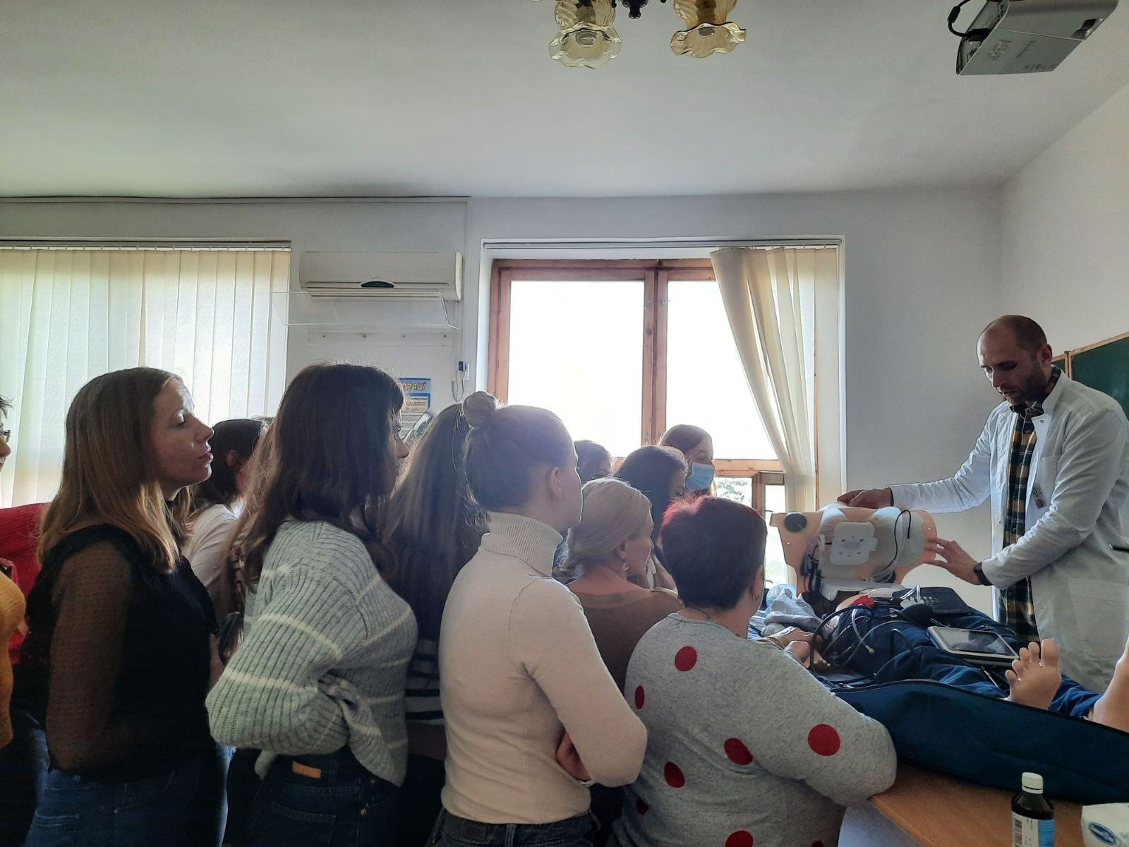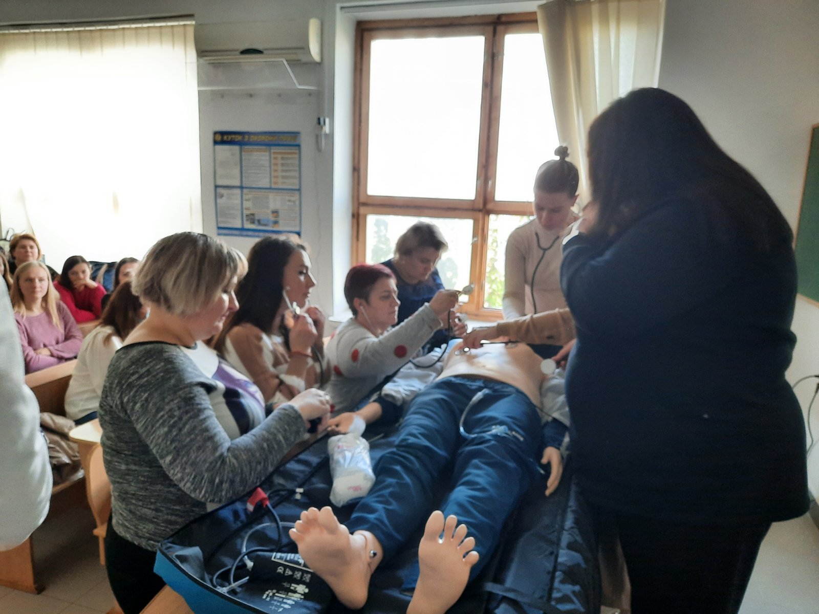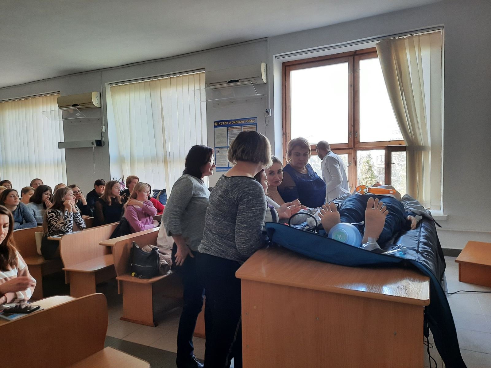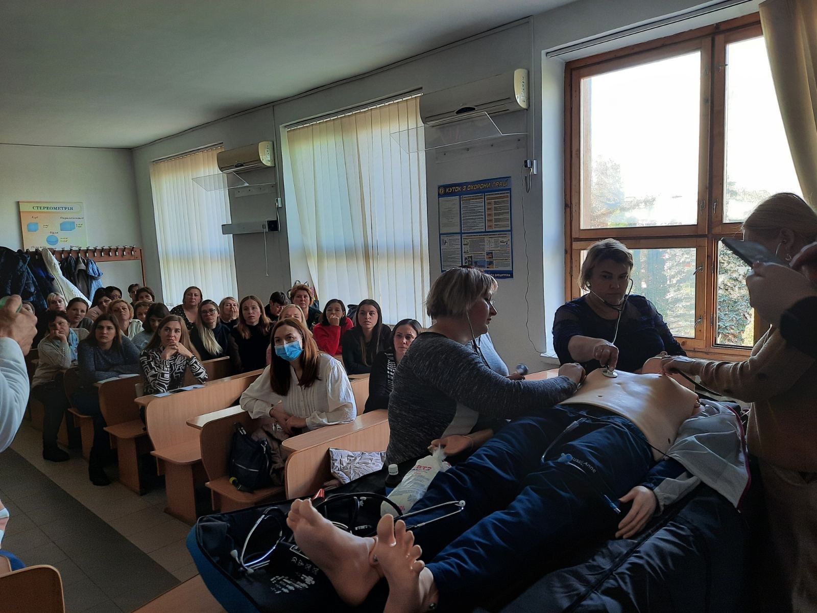 Голова циклової комісії хірургічних дисциплін Володимир Миколайович Яцків під час навчального тренінгу відпрацював із слухачами практичні навички на реанімаційному тренажері-симуляторі, який коледж отримав у подарунок від Klinikum Ernst von Bergmann gGmbH (Потсдам, Німеччина). Слухачі оцінювали параметри роботи дихальної системи, серцево-судинної системи, вчилися користуватись автоматичним зовнішнім дефібрилятором (АЗД), проводити внутрішньокісткову канюляцію.