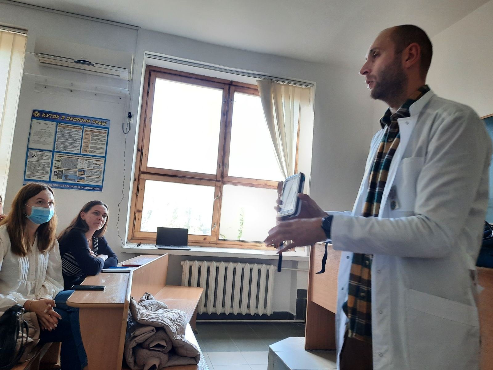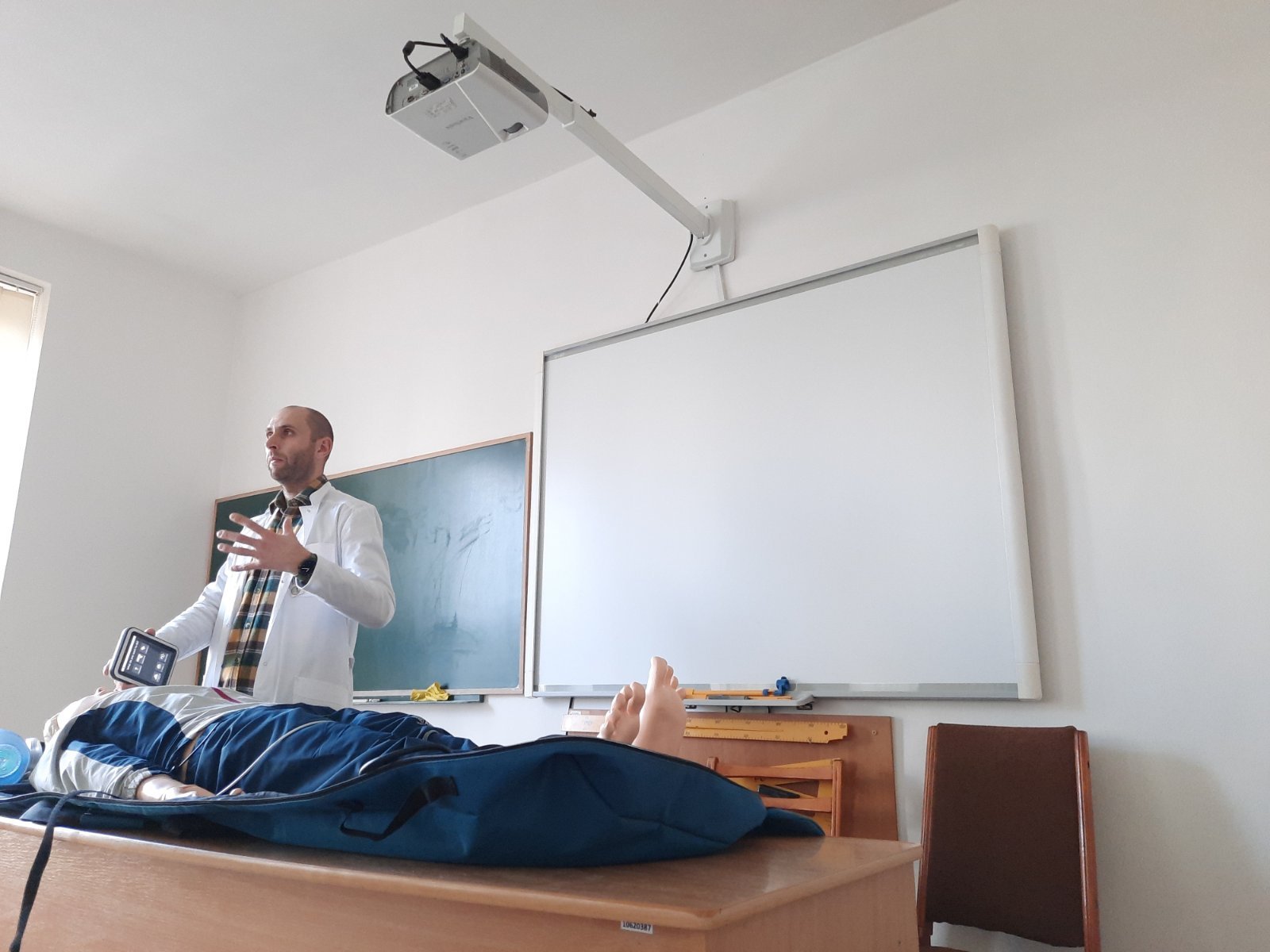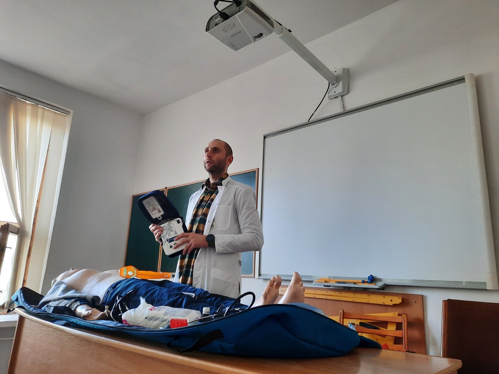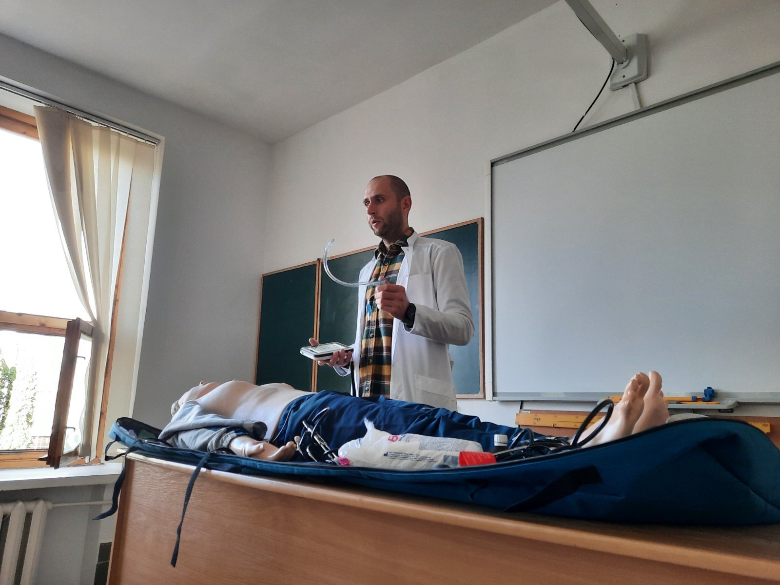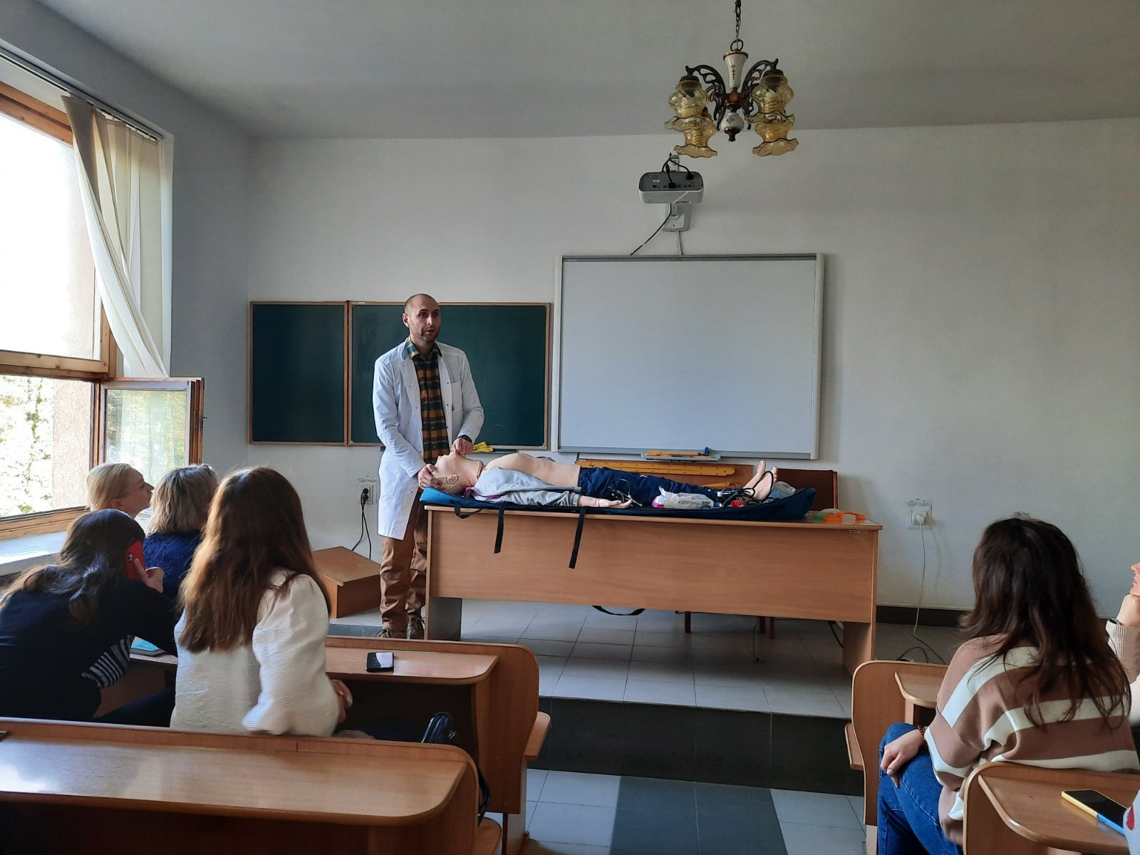 Голова циклової комісії хірургічних дисциплін Володимир Миколайович Яцків під час навчального тренінгу відпрацював із слухачами практичні навички на реанімаційному тренажері-симуляторі, який коледж отримав у подарунок від Klinikum Ernst von Bergmann gGmbH (Потсдам, Німеччина). Слухачі оцінювали параметри роботи дихальної системи, серцево-судинної системи, вчилися користуватись автоматичним зовнішнім дефібрилятором (АЗД), проводити внутрішньокісткову канюляцію.