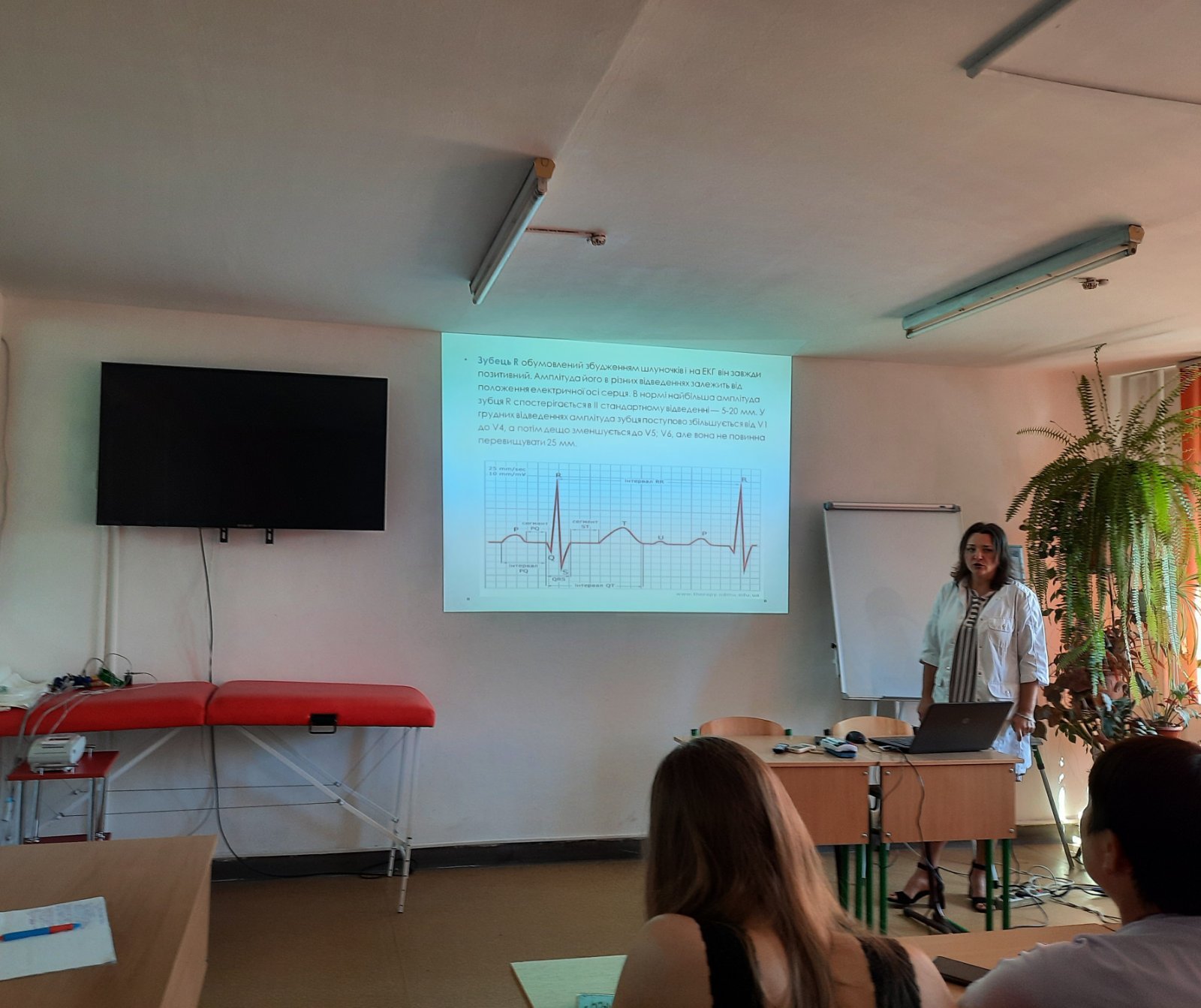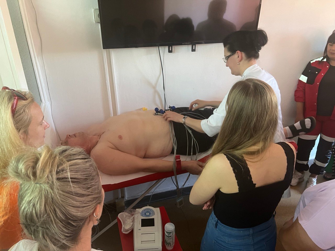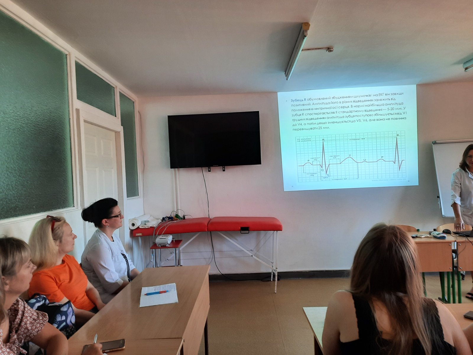 Лікар відділення функціональної і ультразвукової діагностики КНП «Обласна клінічна лікарня» ІФОР Гричинюк Ольга Миколаївна акцентувала увагу слухачів на можливих помилках при зніманні ЕКГ, провела характеристику змін на ЕКГ при захворюваннях серця. А старший фельдшер Тисменицького відділення КНП «Обласний клінічний центр ЕМД та МК Івано-Франківської обласної ради» Гербуд Ірина Миронівна та фельдшер Паливода Руслана Василівна відпрацювали з учасниками тренінгу навички знімання електрокардіограми в умовах «швидкої», тактику дій медиків у разі діагностування у пацієнта гострого коронарного синдрому, у т.ч. проведення СЛР.