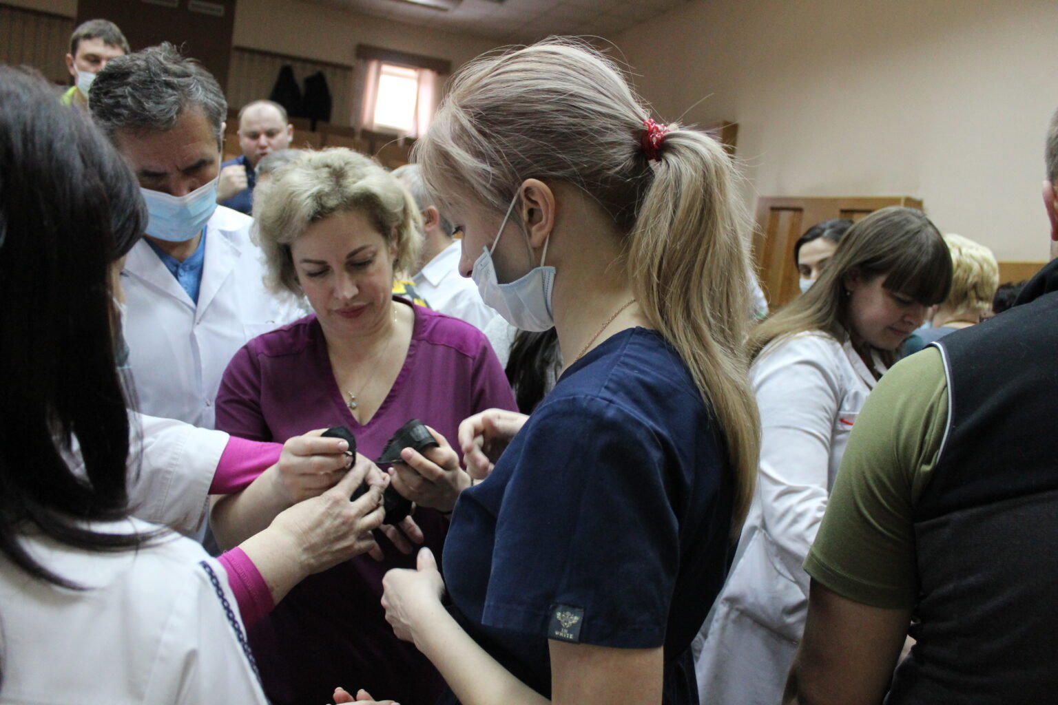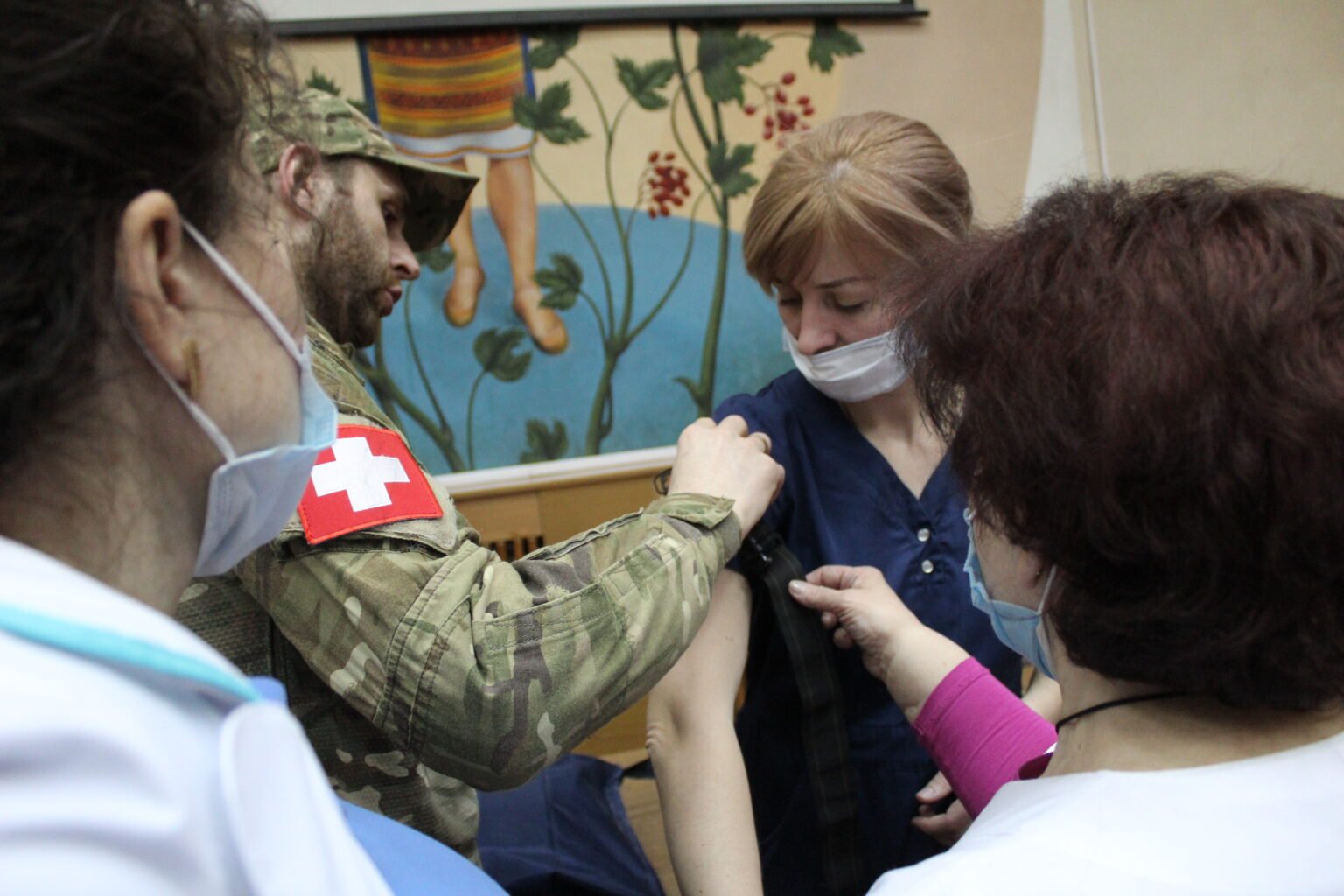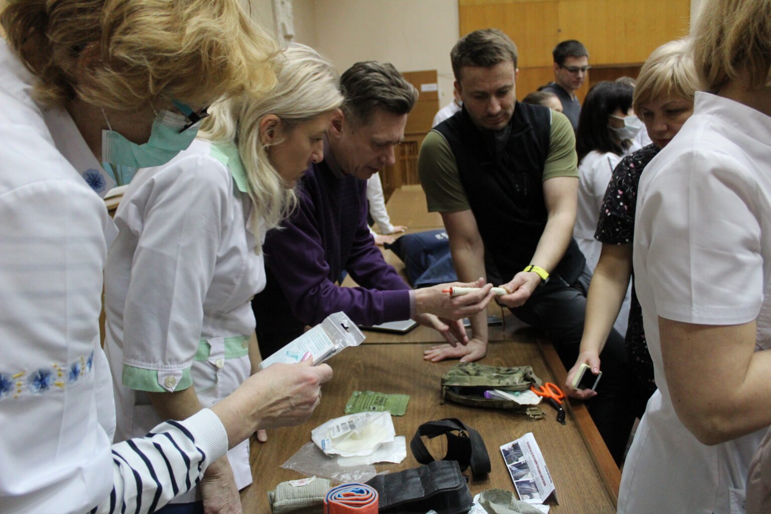 Медикам перинатального центру розповіли та показали, як надати першу допомогу при пошкодженні кровоносних магістральних судин, як правильно затягувати турнікет та джгут Есмарха, як зупиняти кров бинтом Celox та гідрогелевими пов’язками, як користуватись Ізраїльським бандажем та інше.