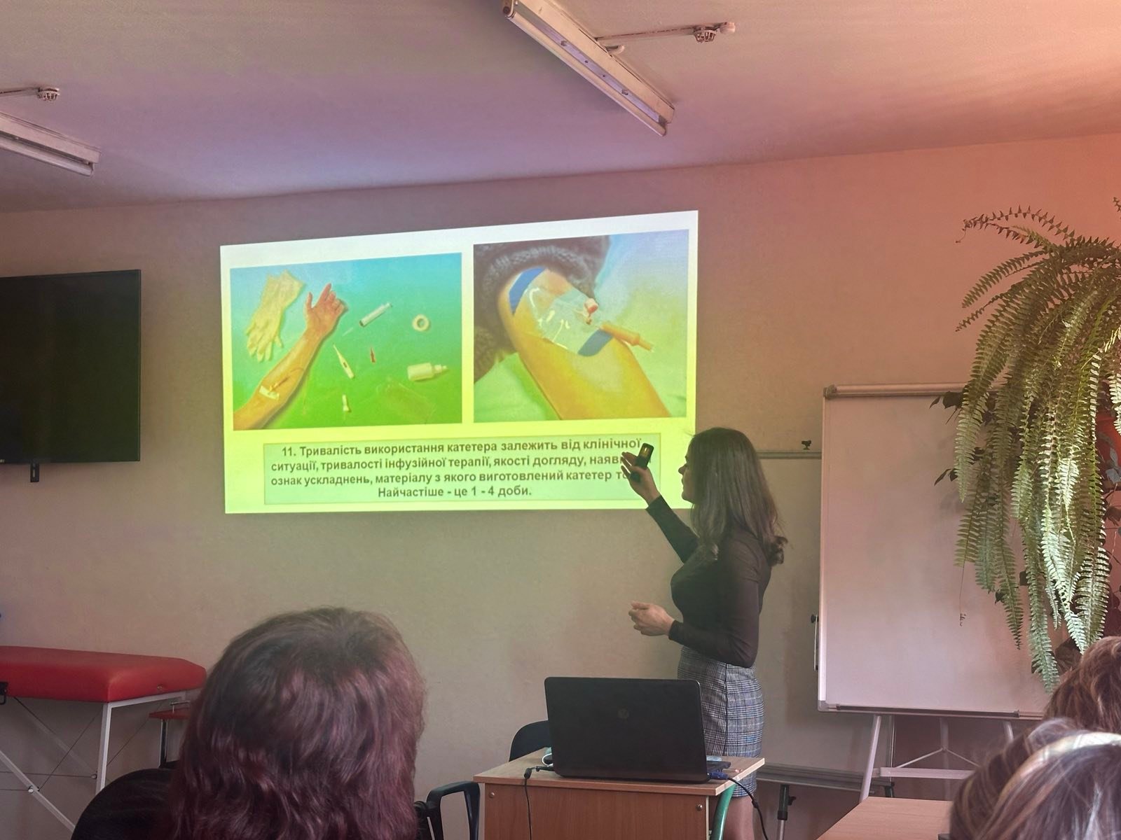 Слухачі відпрацювали навички безпечного догляду за центральним венозним та периферичним катетерами, заповнення форм збору даних КАІК, пов’язаних з центральним судинним та з периферичним судинним катетерами; догляду за сечовим катетером; догляду за трахеостомічною трубкою і проведення санації дихальних шляхів пацієнта; догляду за післяопераційною раною та забору біологічного матеріалу для мікробіологічного дослідження.