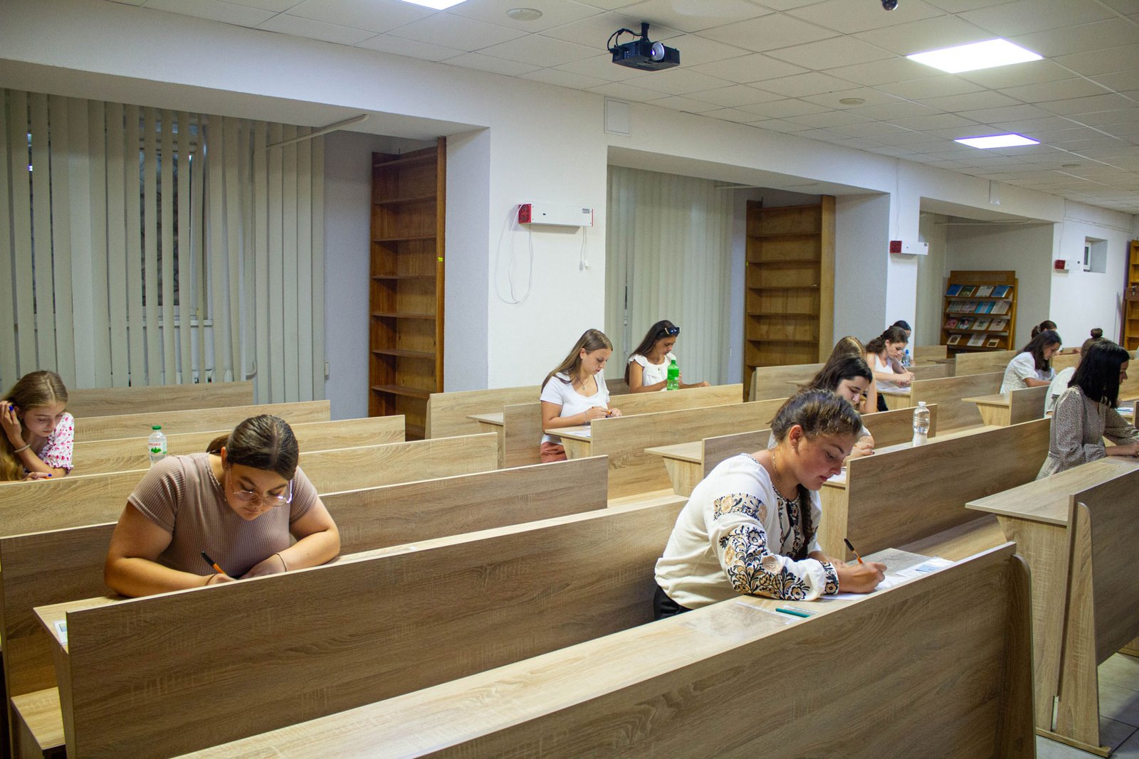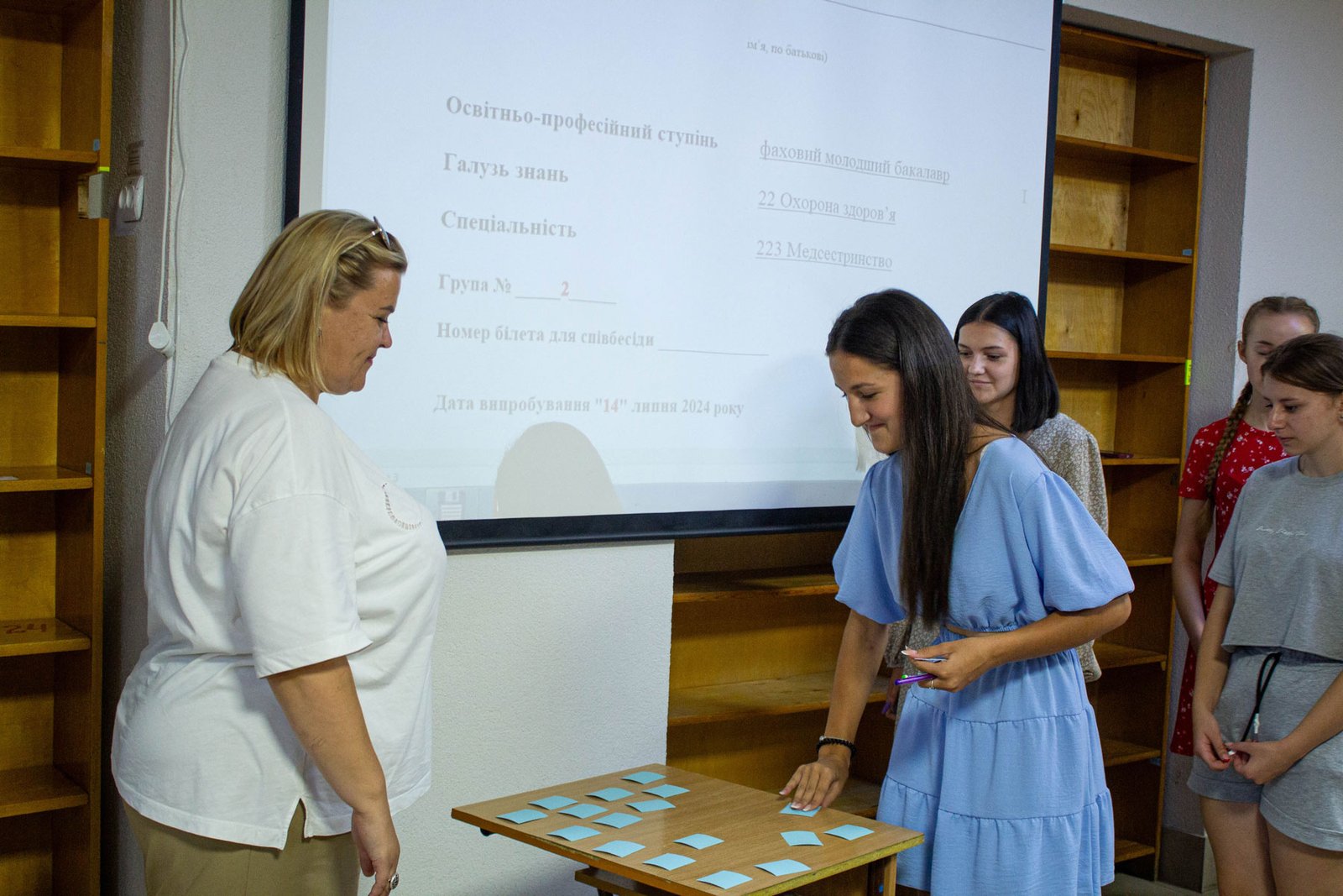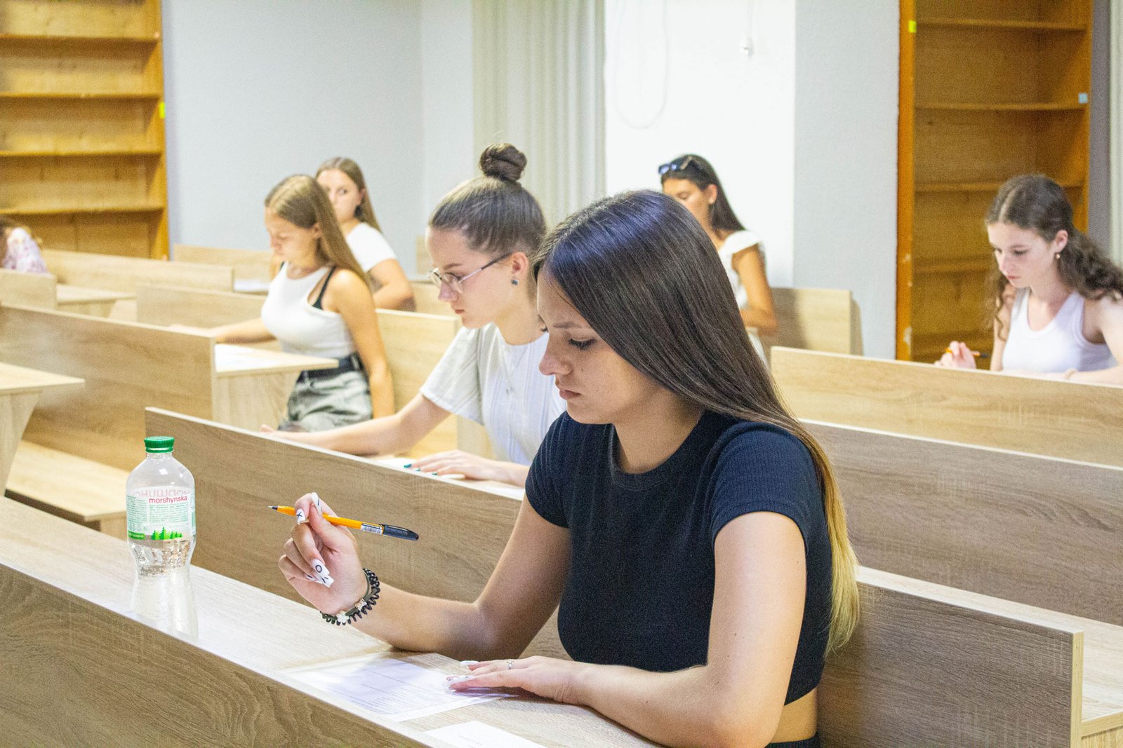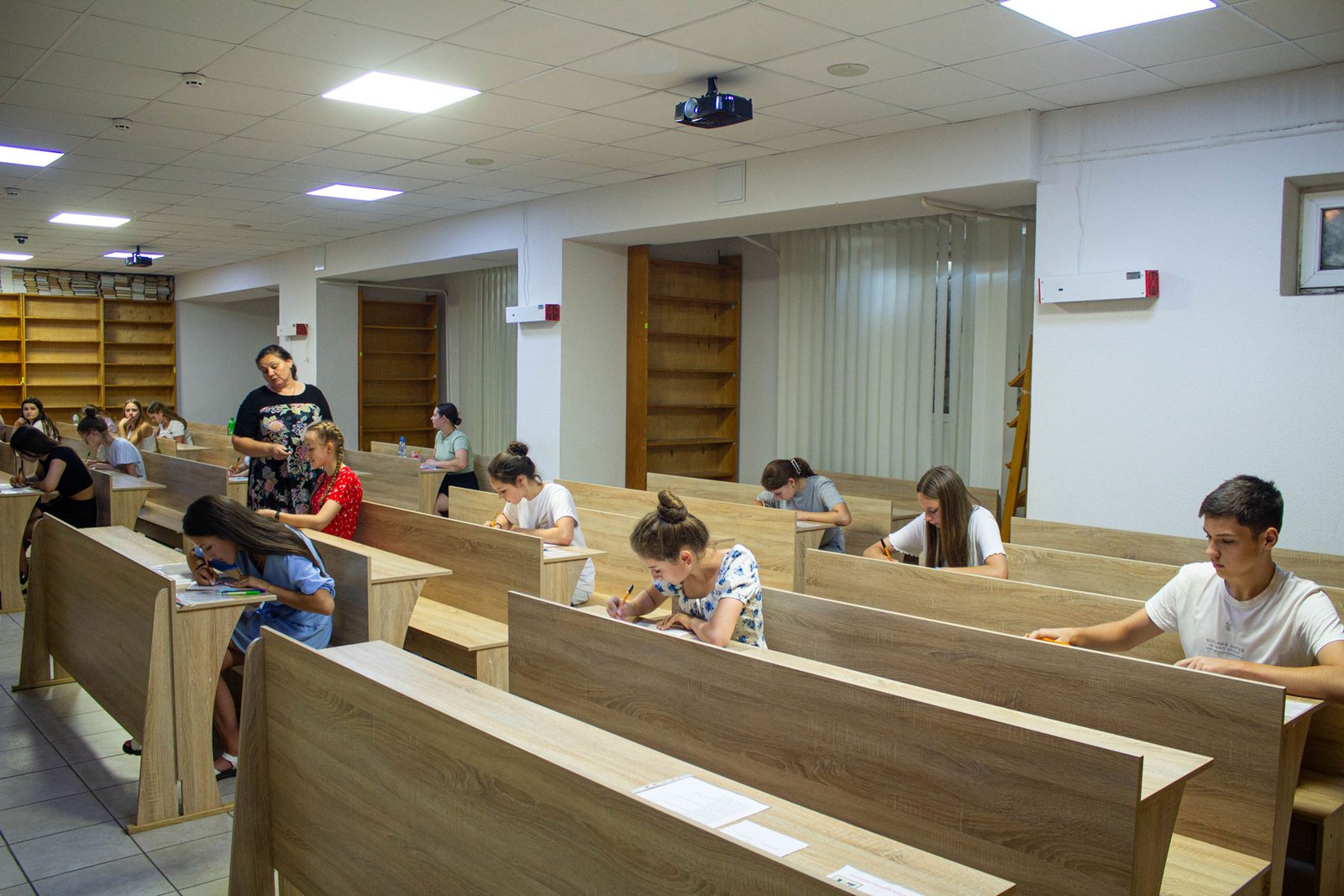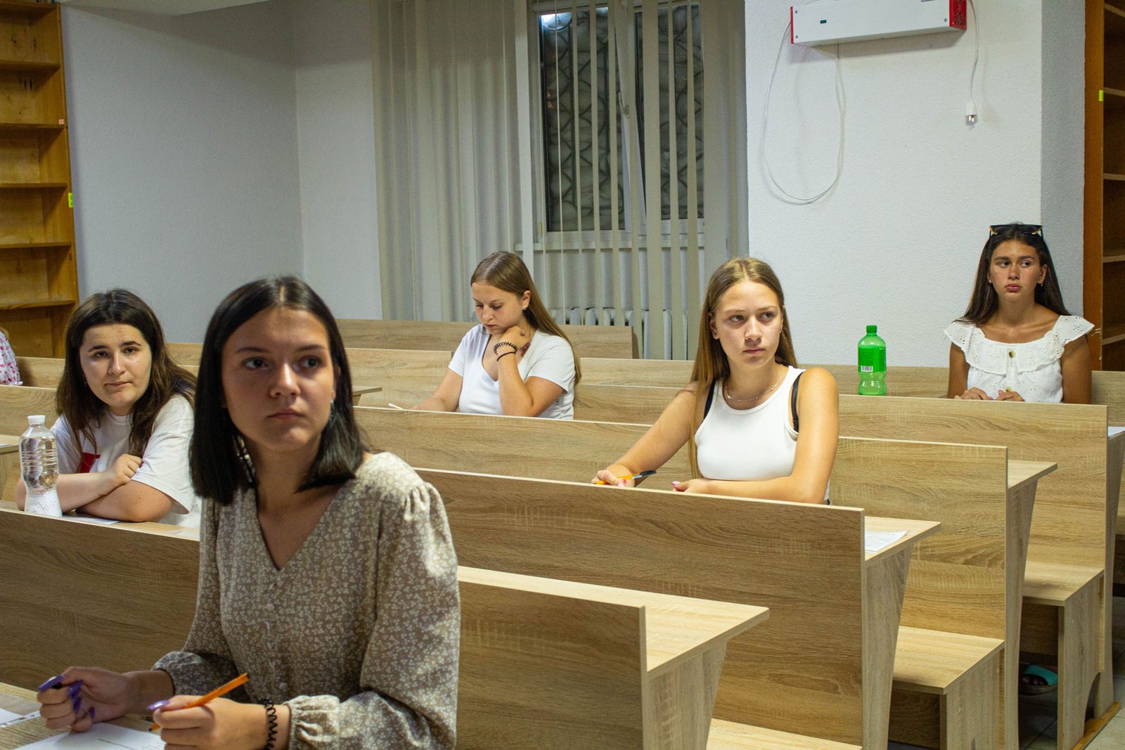 У день на співбесіду з української мови приходять по дві групи вступників. Задля безпеки абітурієнтів вона проводиться в укритті на нульовому поверсі. Тут є санвузол, кулер з водою, аптечка. І не відчувається спека, яка накрила місто у ці дні.
