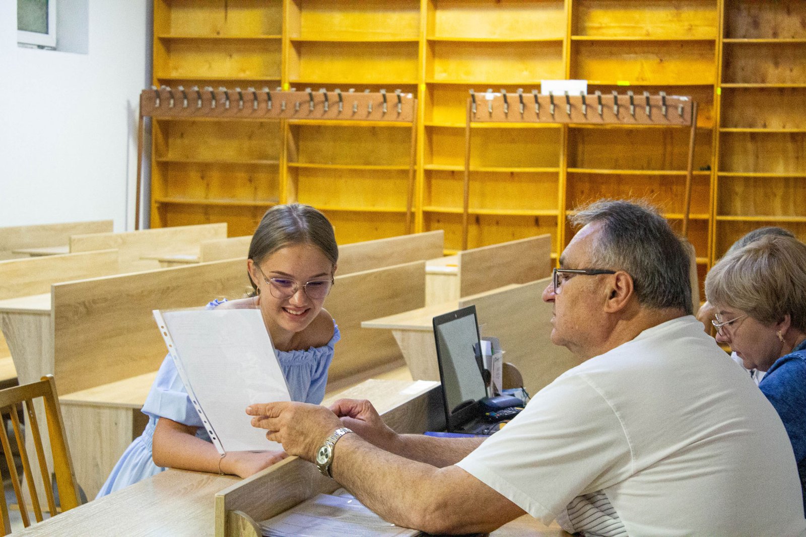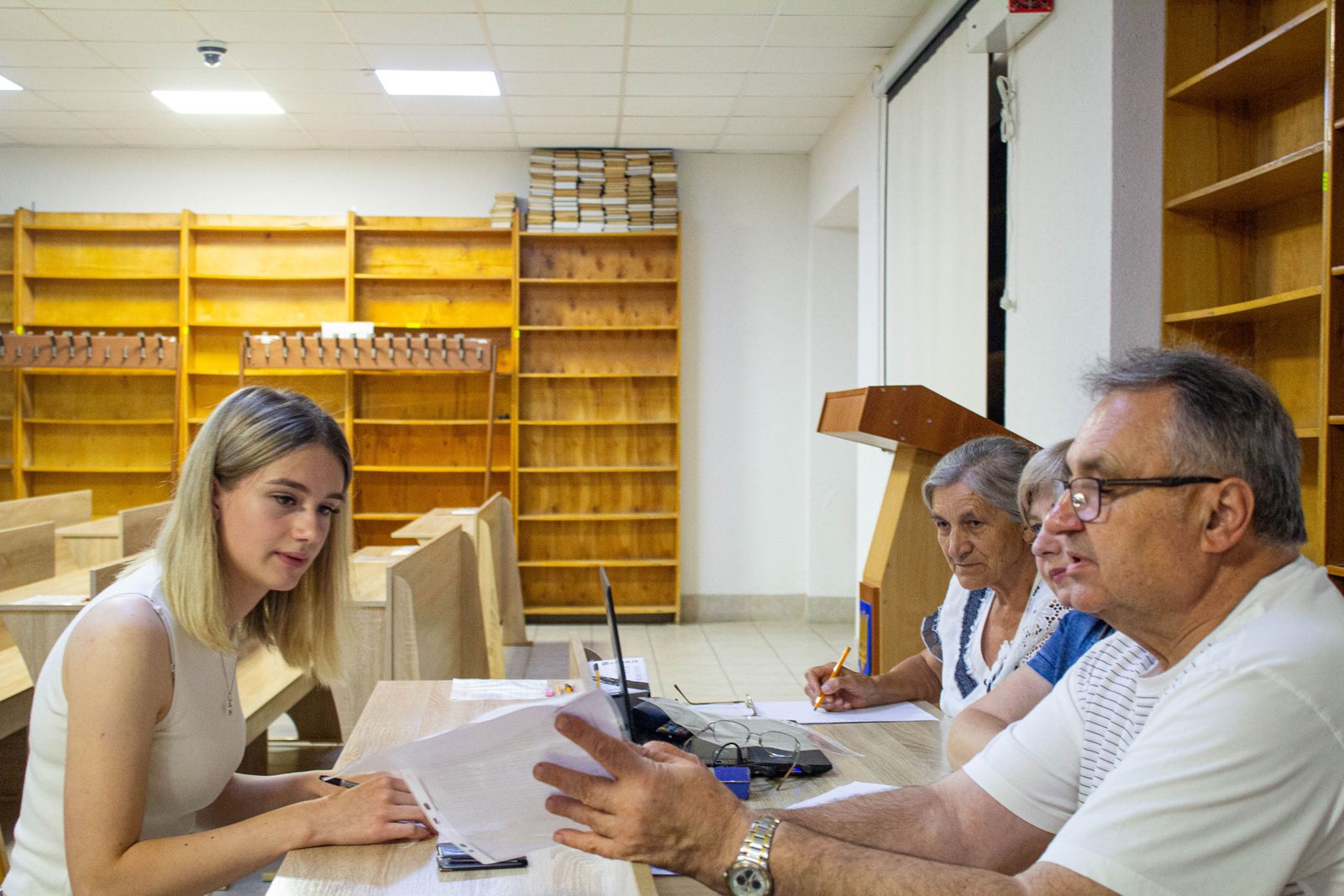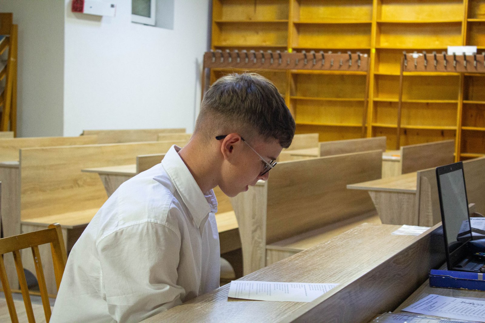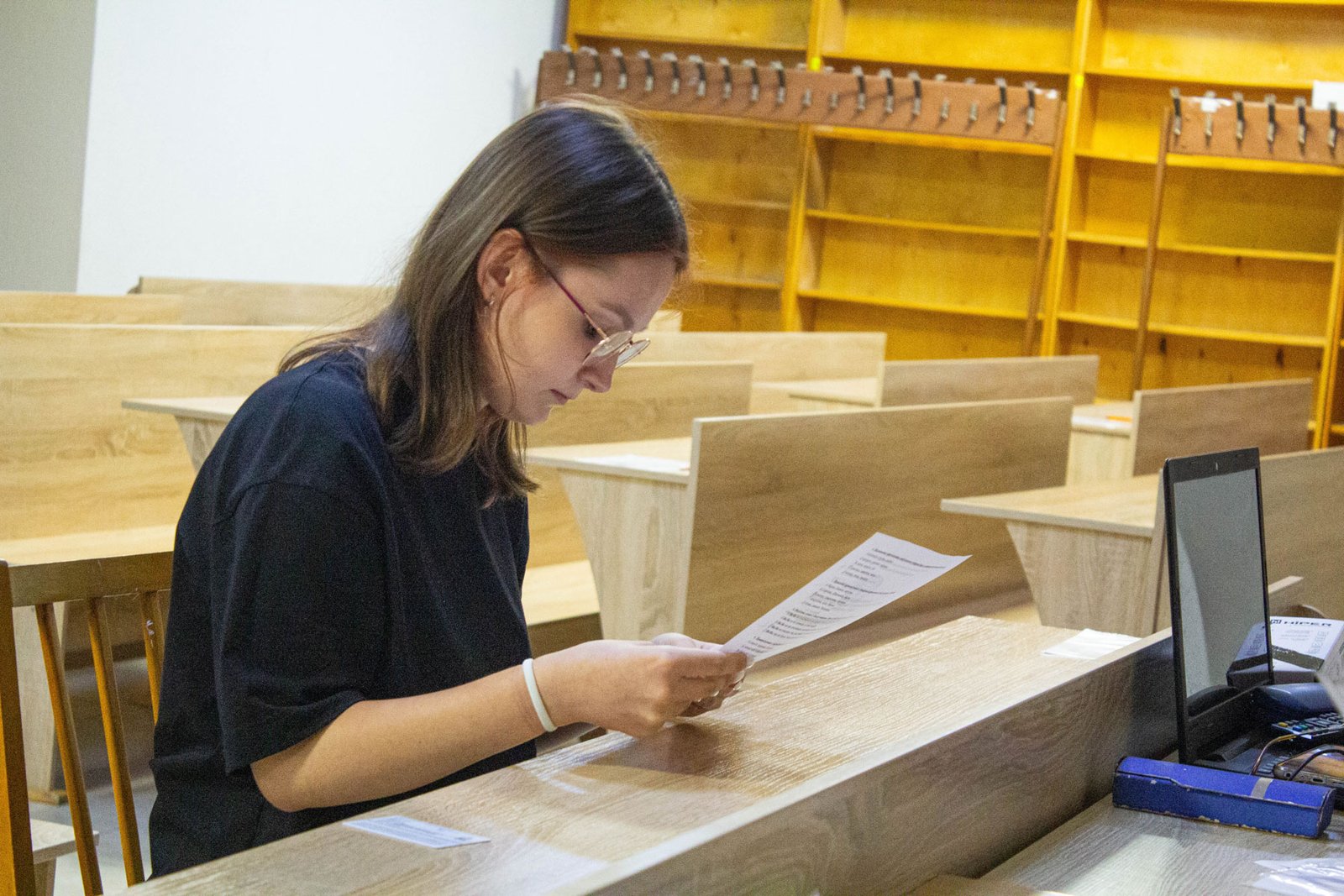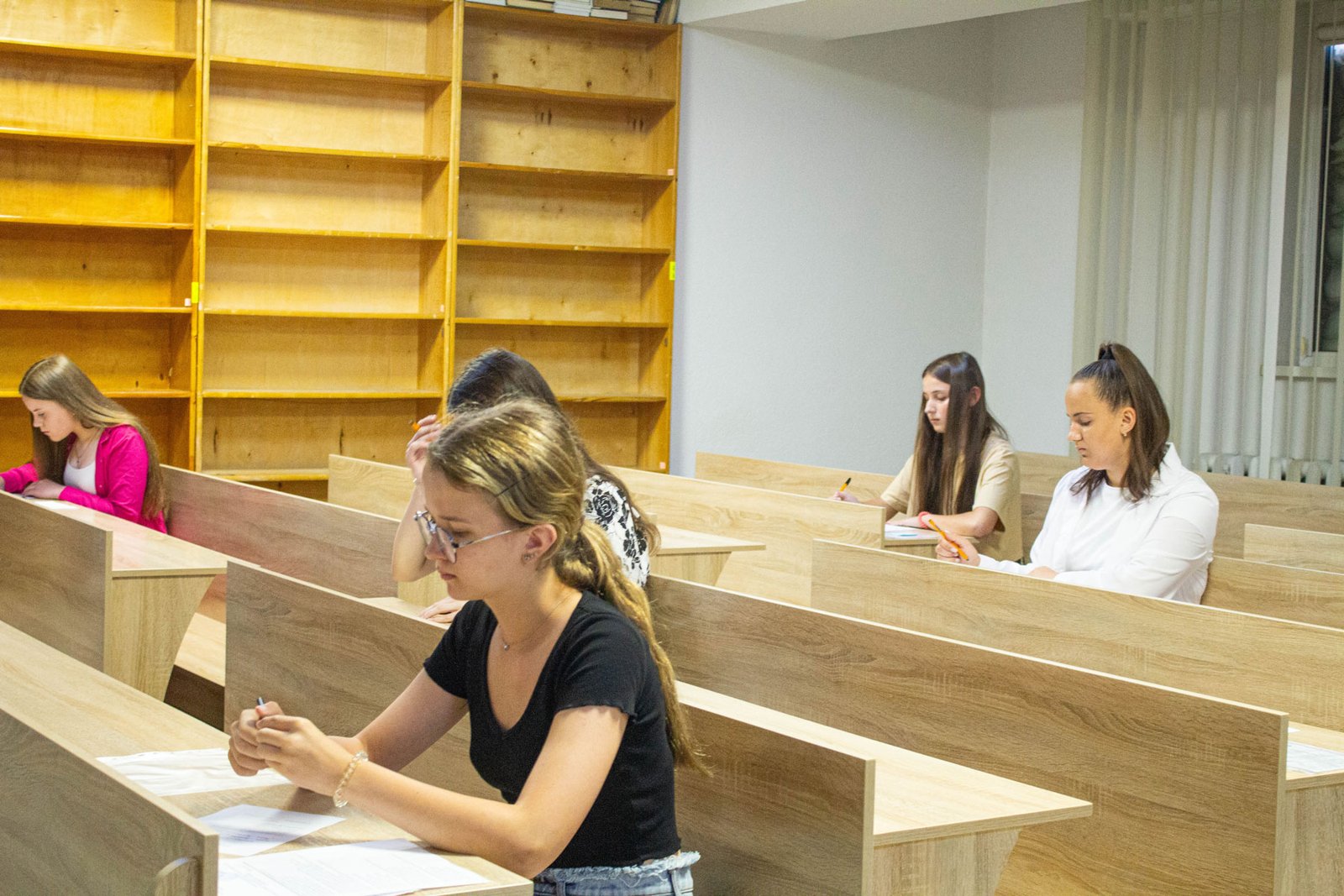 У день на співбесіду з української мови приходять по дві групи вступників. Задля безпеки абітурієнтів вона проводиться в укритті на нульовому поверсі. Тут є санвузол, кулер з водою, аптечка. І не відчувається спека, яка накрила місто у ці дні.