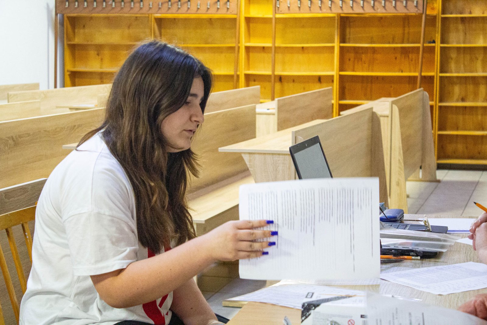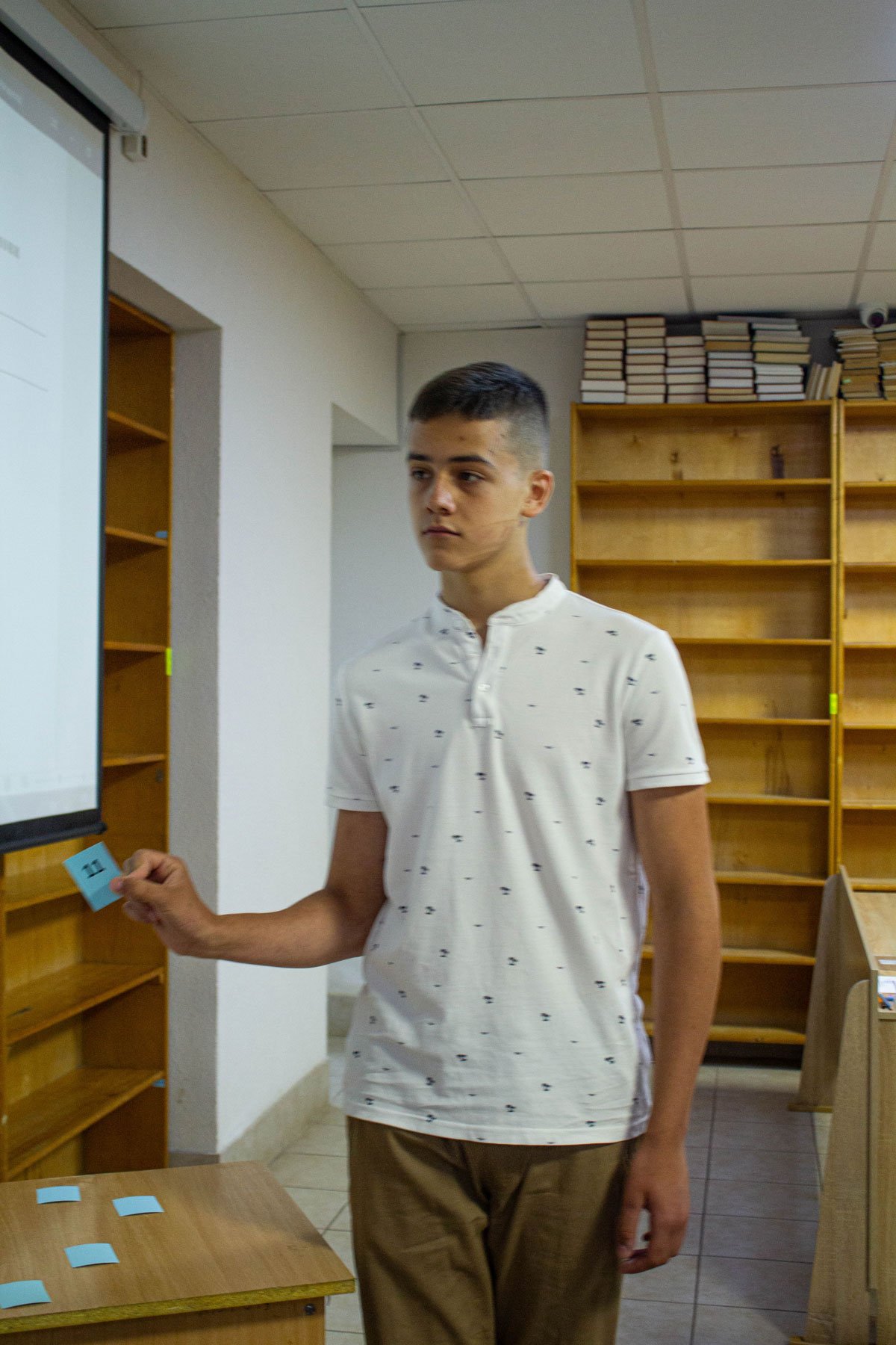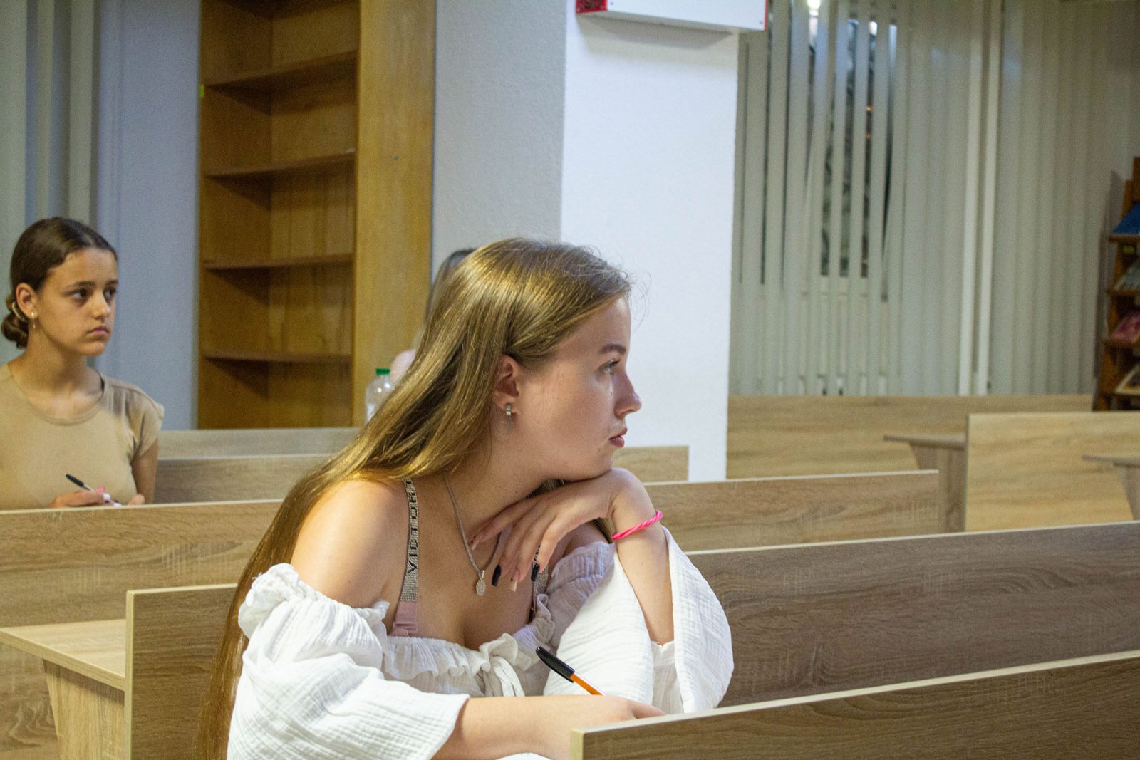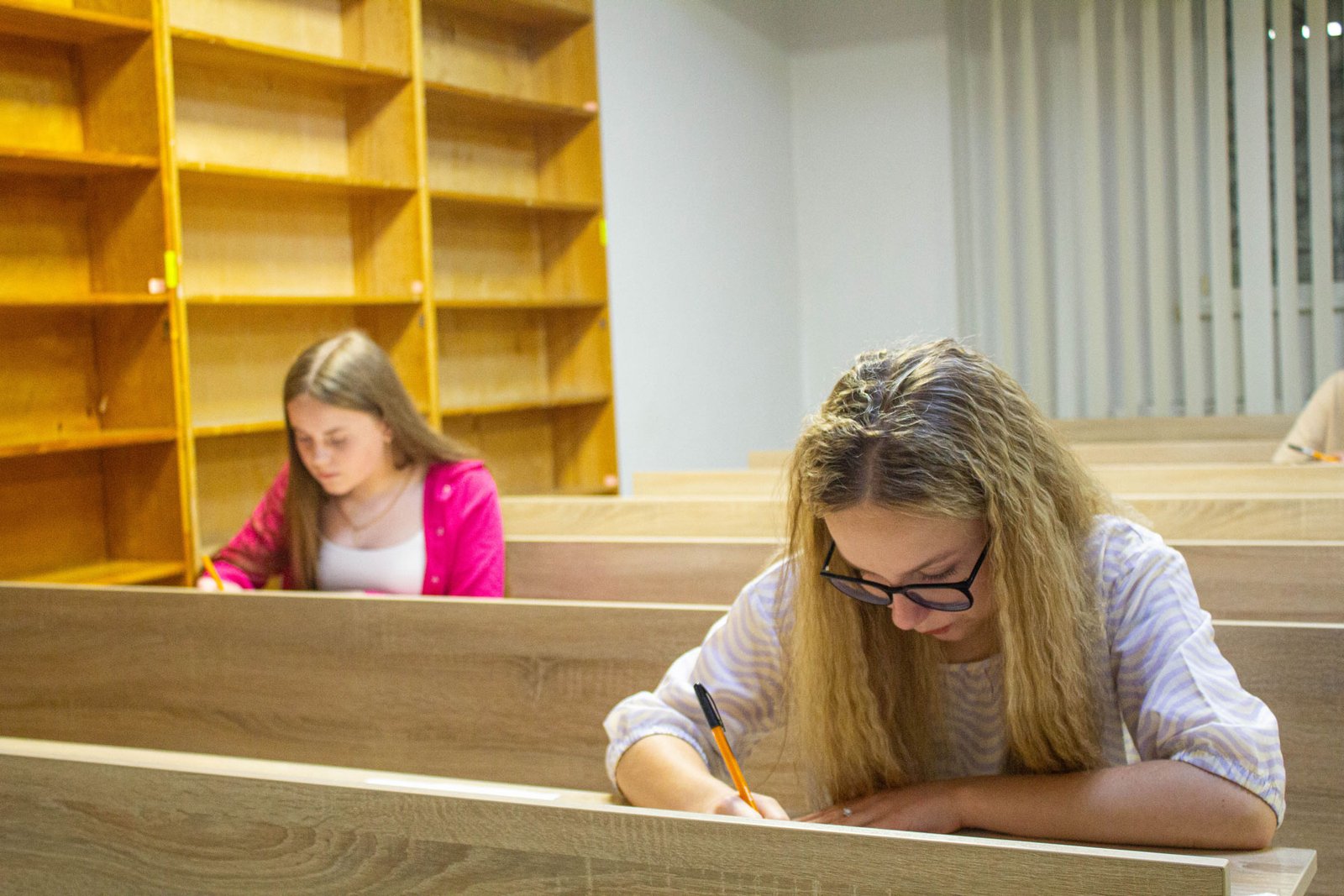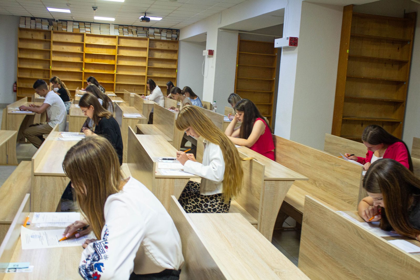 У день на співбесіду з української мови приходять по дві групи вступників. Задля безпеки абітурієнтів вона проводиться в укритті на нульовому поверсі. Тут є санвузол, кулер з водою, аптечка. І не відчувається спека, яка накрила місто у ці дні.
