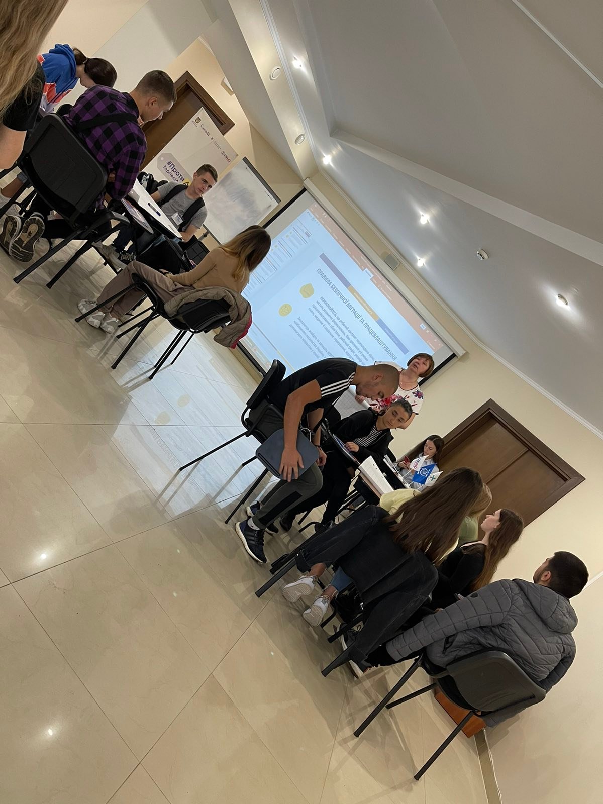 Під час роботи в малих групах відбувалася презентація напрацювань за темою «Правила безпечної міграції та працевлаштування». Учасники тренінгу пройшли онлайн-квест з безпечного працевлаштування, навчились відрізняти міфи від фактів, здійснили керований перегляд анімаційного фільму «Що таке торгівля людьми?» та анімаційних відеоісторій постраждалих «Навіть ти».