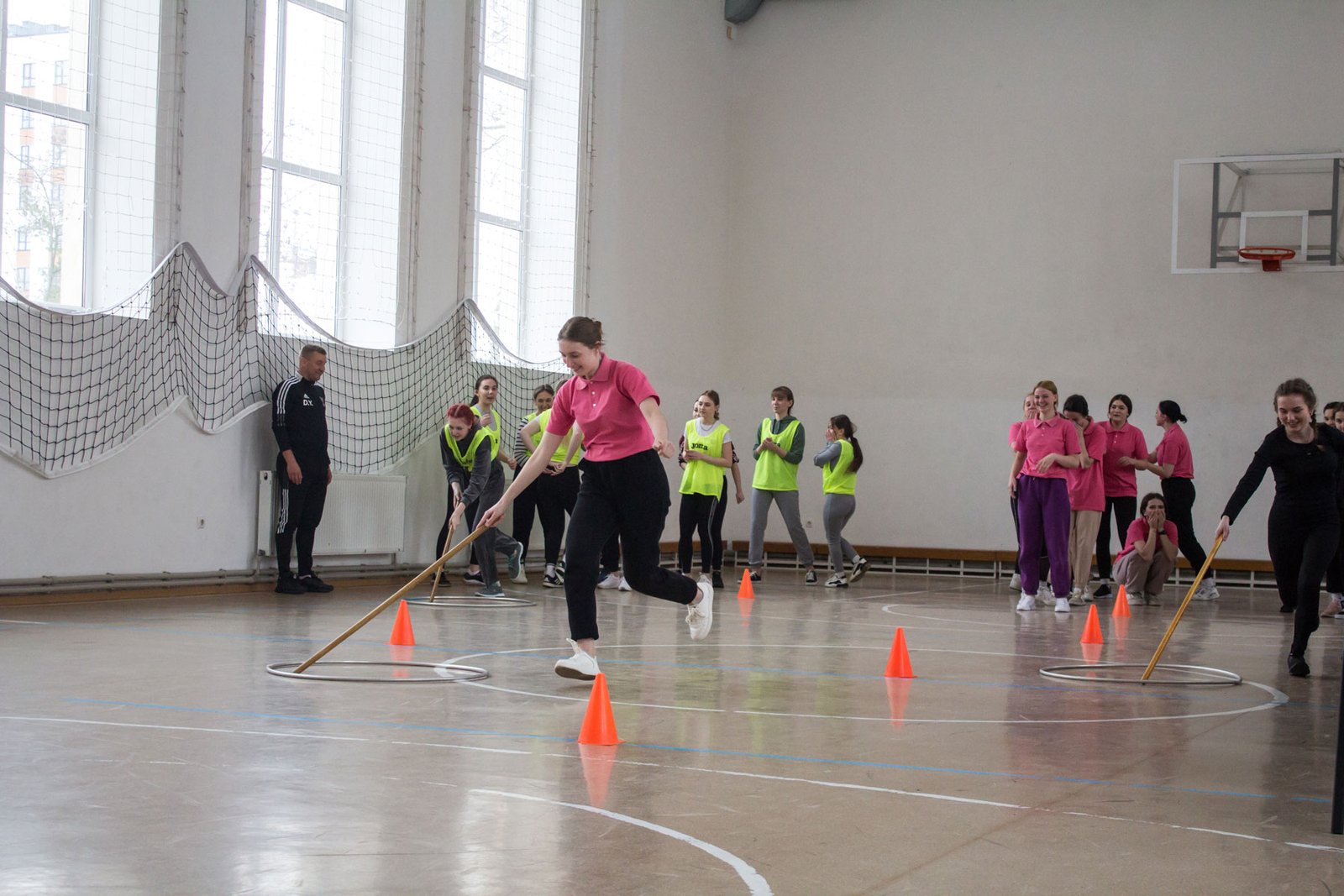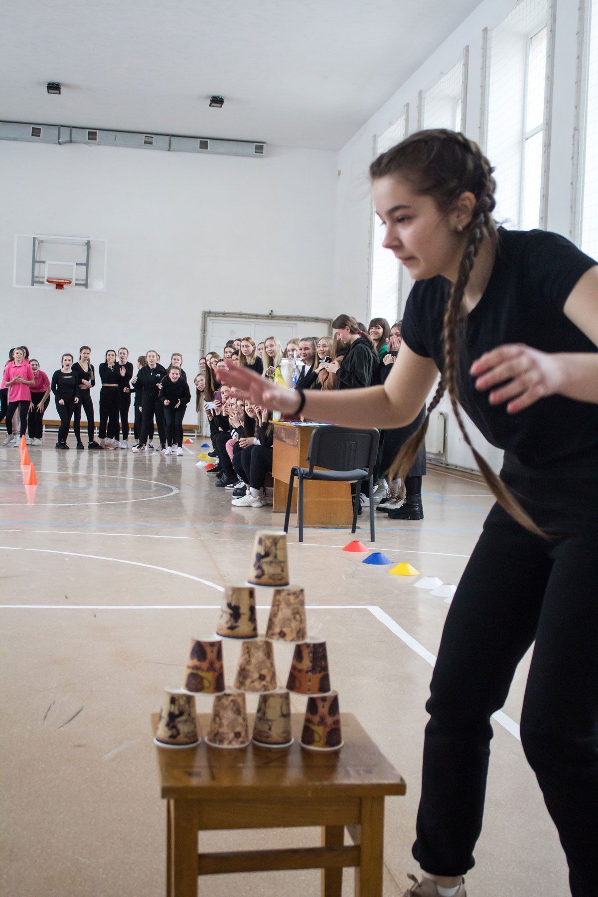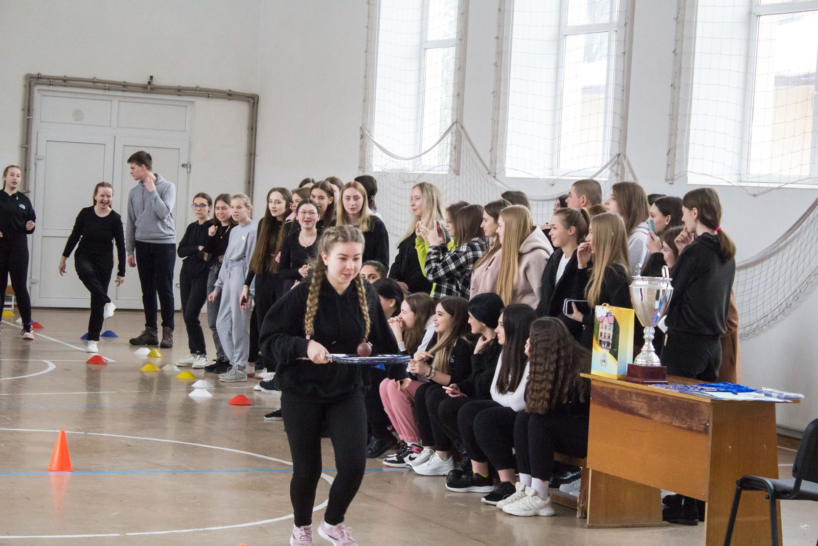 А потім студенти змагалися у п’яти спортивних естафетах. У першій вправлялися із кільцем та гімнастичною палицею, у другій переносили малий м’ячик на тенісній ракетці, у третій будували піраміду з паперових скляночок, четверта естафета – стрибунів і п’ята – естафета з елементами баскетболу. Треба було і спритність проявити, і спортивні здібності. Ще й при цьому всі отримали заряд позитивних емоцій, гарного настрою і спортивного азарту.