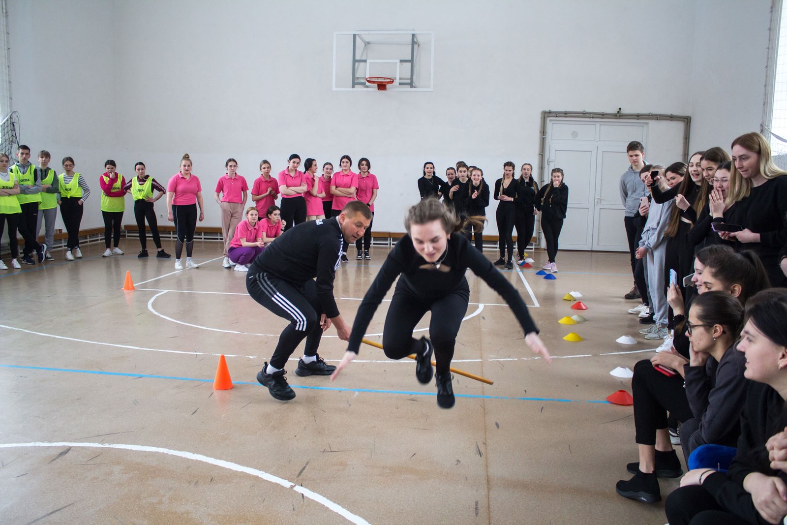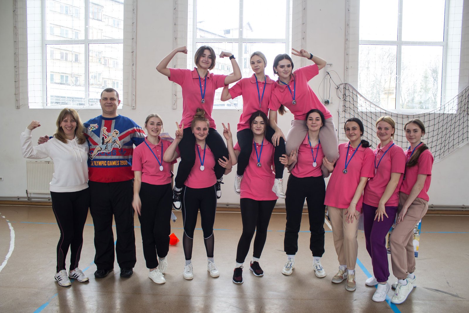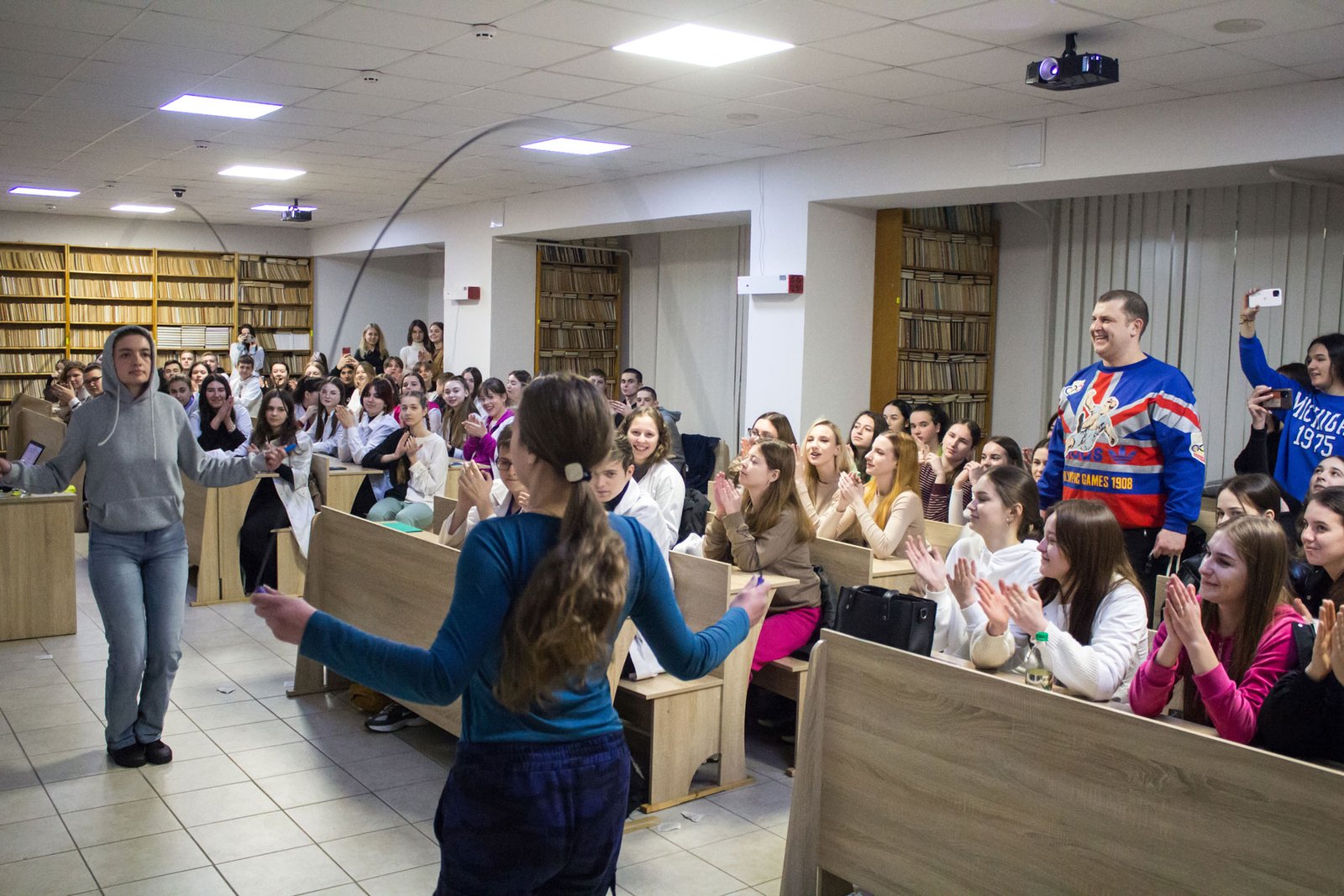 А потім студенти змагалися у п’яти спортивних естафетах. У першій вправлялися із кільцем та гімнастичною палицею, у другій переносили малий м’ячик на тенісній ракетці, у третій будували піраміду з паперових скляночок, четверта естафета – стрибунів і п’ята – естафета з елементами баскетболу. Треба було і спритність проявити, і спортивні здібності. Ще й при цьому всі отримали заряд позитивних емоцій, гарного настрою і спортивного азарту.