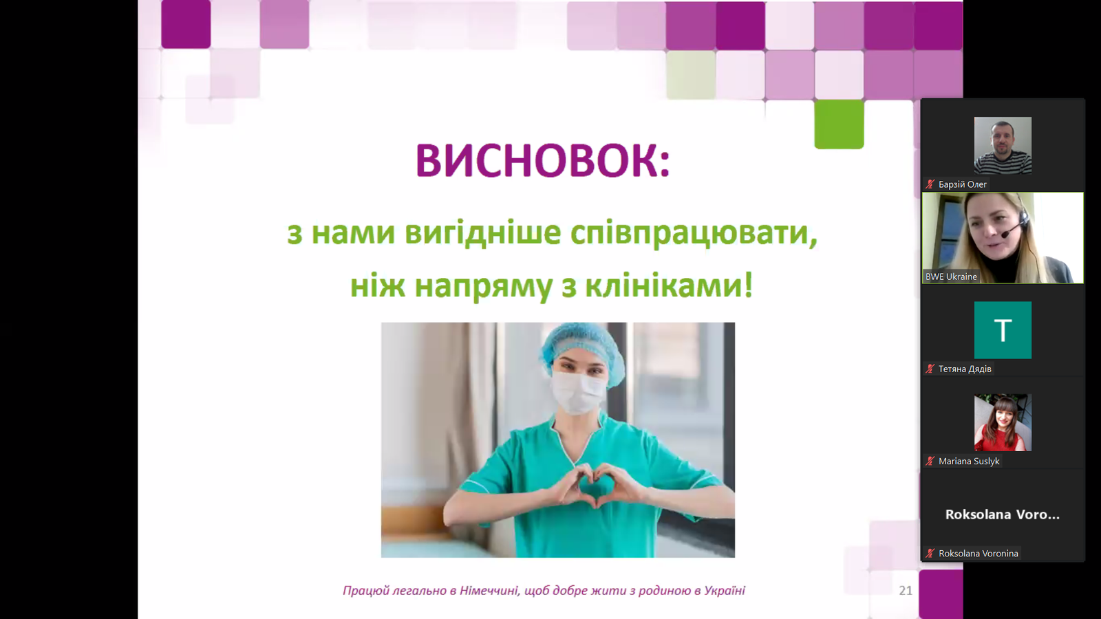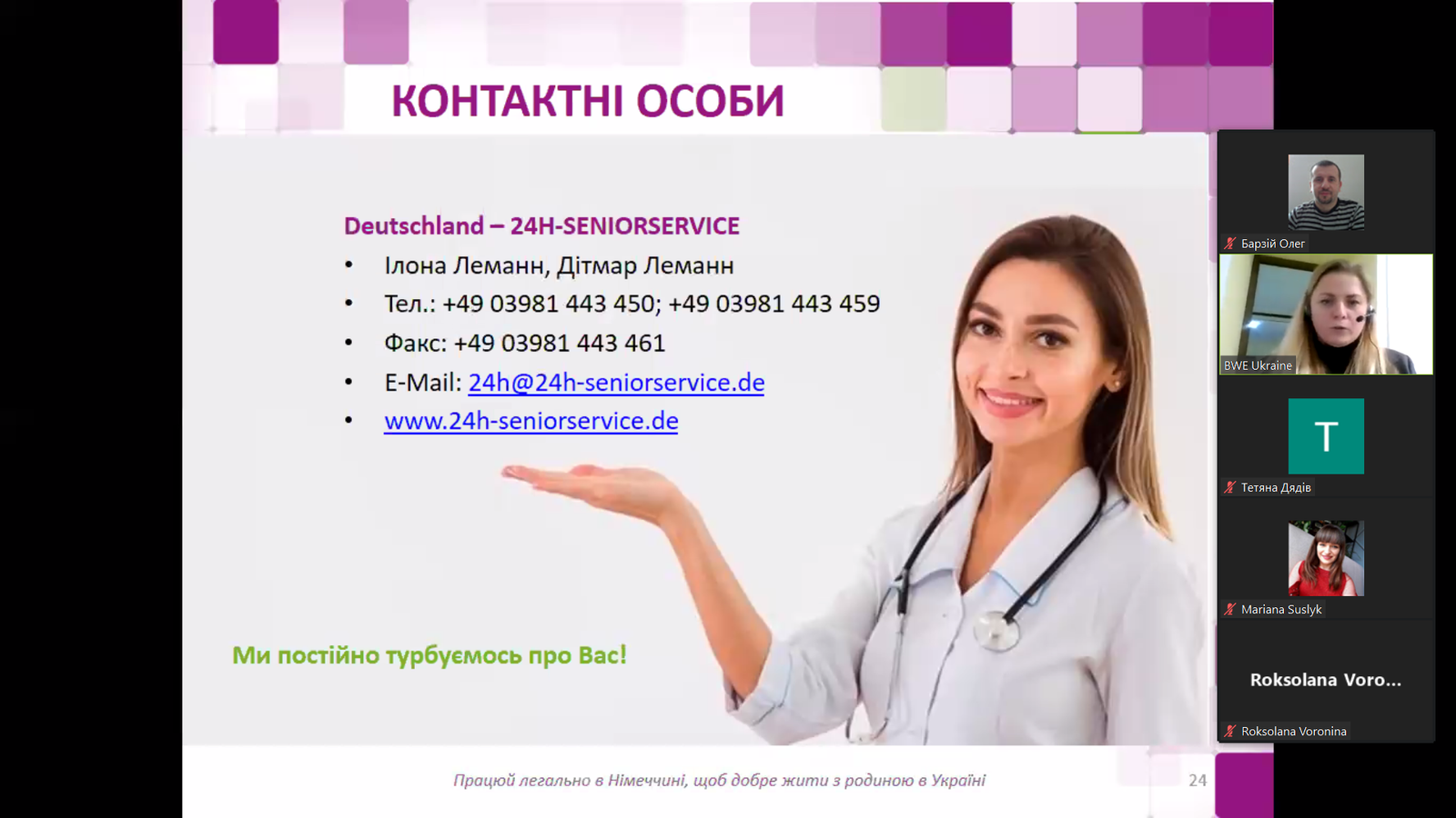 Під час відеопрезентації детально йшлося власне про цю допомогу: вивчення німецької мови до рівня В2, завірення документів, іспит в Німеччині, щоб стати екзаменованими медсестрами, документальне оформлення визнання українських медсестер (підтвердження диплому), офіційне працевлаштування на роботу.