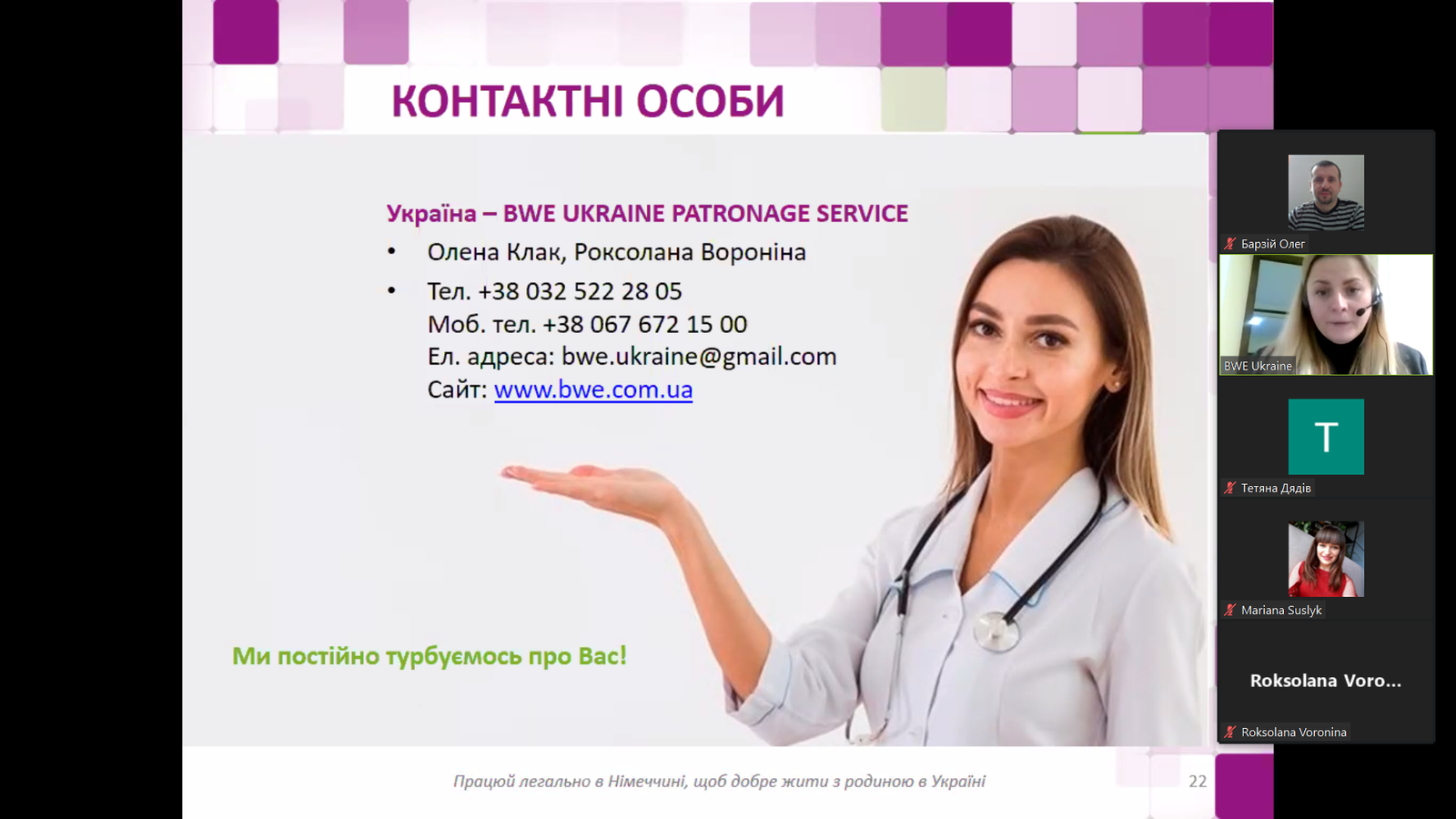 Івано-Франківський медичний фаховий коледж як один з авторитетних закладів такого типу в Україні отримує чимало пропозицій про співпрацю з-за кордону: на проходження практики в лікувальних закладах, працю медсестрами у клініках. Пропозиція співпраці надійшла і від Програми Ausbildungsakademie BWE Ukraine. 2 грудня директорка української філії Програми Олена Клак провела для працівників та студентів ІФМФК відеопрезентацію на платформі Zoom.