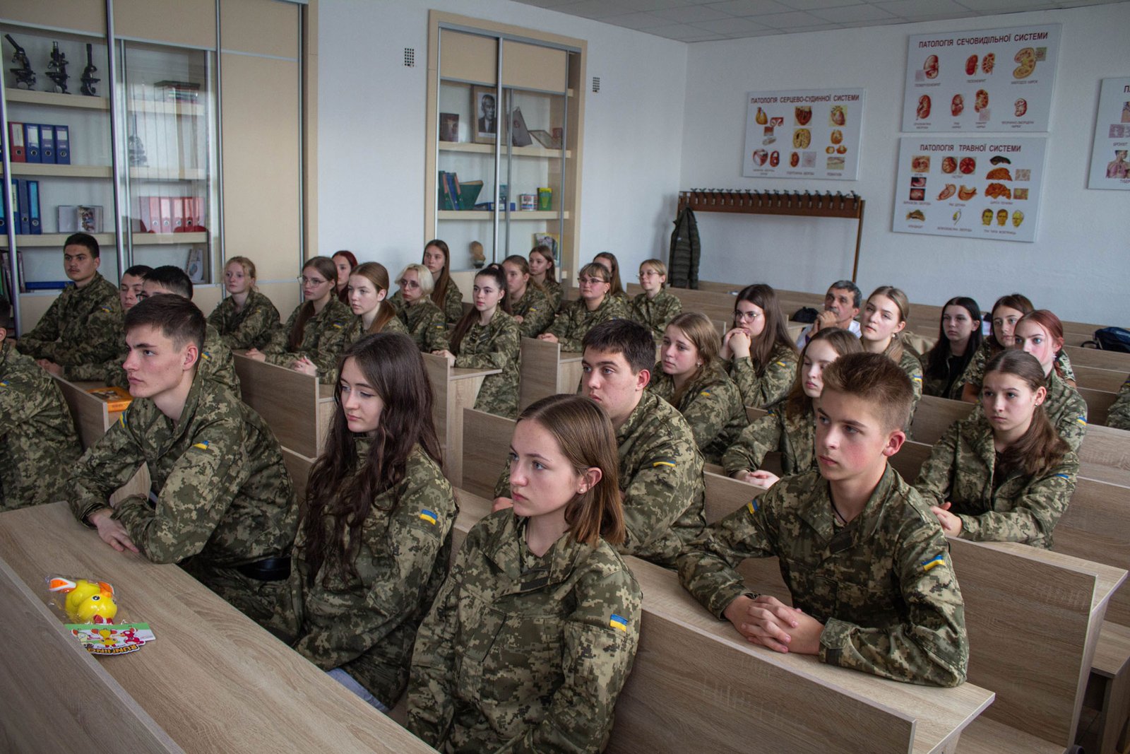Особливо щемкою була виховна година у групі І-3 спеціалізації Лікувальна справа (керівник Олександр Романович Кравець). До студентів прийшли з маленькою дитиною старший солдат В. з дружиною, які зараз обоє є військовослужбовцями. Він був учасником Майдану та АТО, вона після початку війни повернулася з-за кордону в Україну, щоб піти у ЗСУ. Родина захисників не лише розповіла про свій шлях і свою історію, а й принесли показати з чим прийшли орки на нашу землю: бронежилет, каску з маркуванням. Прозвучав вірш «Солдат сидить». А ще студенти передали на передову окопні свічки. В минулому році їх виливали здобувачі освіти теперішньої групи IV-5, де керівником тоді був Олександр Романович, а в цьому році продовжили першокурсники.