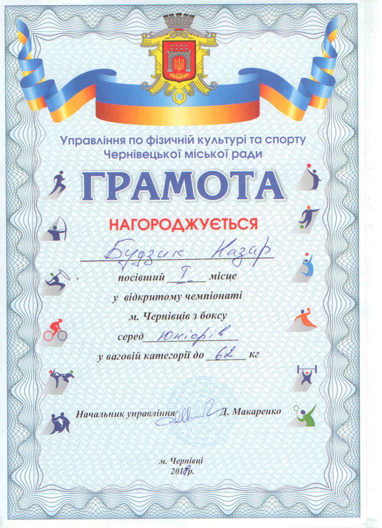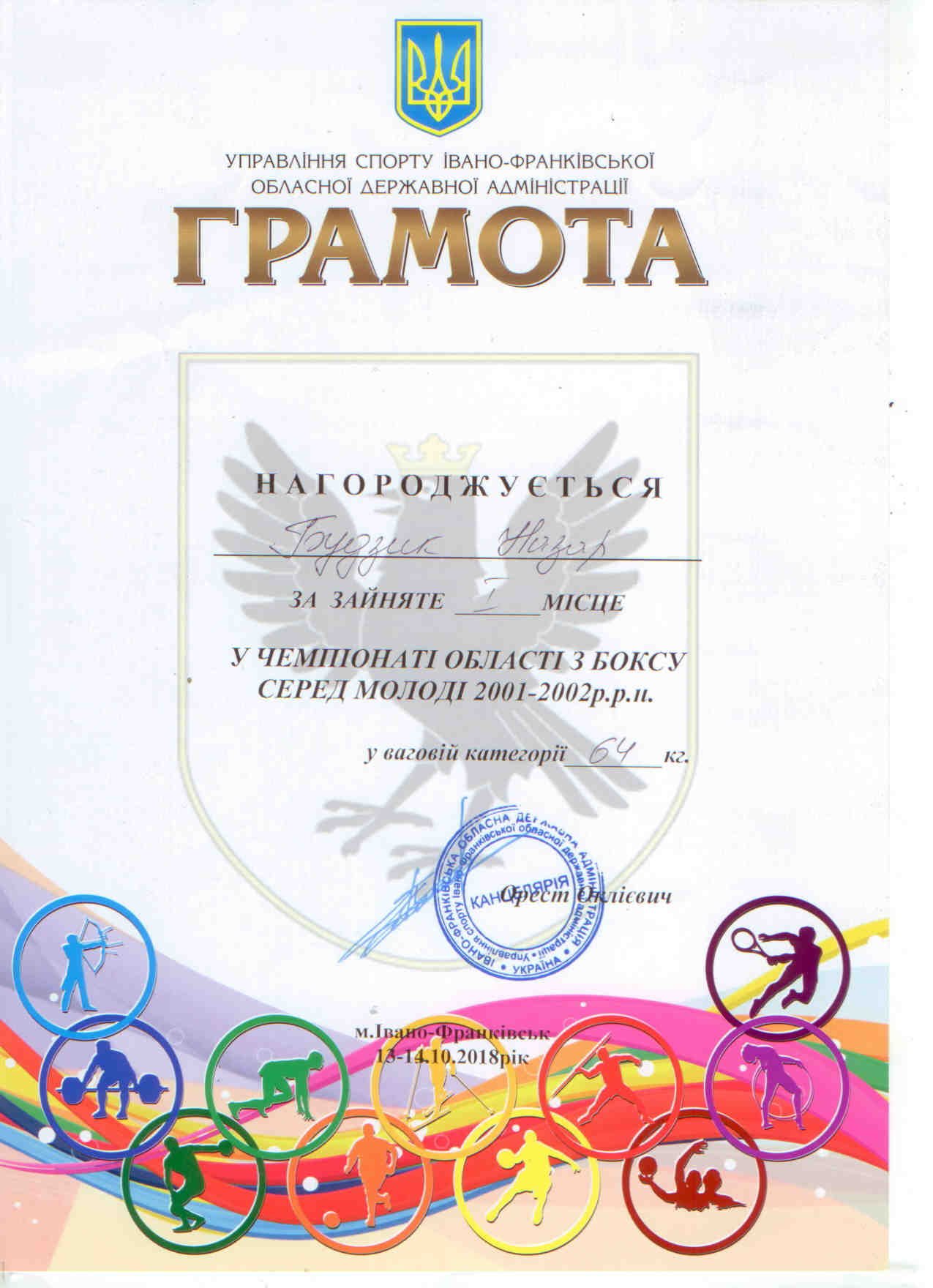 Адміністрація та педагогічний колектив коледжу вітає студента ІІ курсу 5 групи спеціалізації "Лікувальна справа" Будзика Назарія за зайняте І - місце у чемпіонаті Івано-Франківської області з боксу серед молоді 2001-2002р.р.н. У ваговій категорії 64 кг, та І-місце у відкритому чемпіонаті м. Чернівців з боксу серед юніорів у ваговій категорії 62 кг.