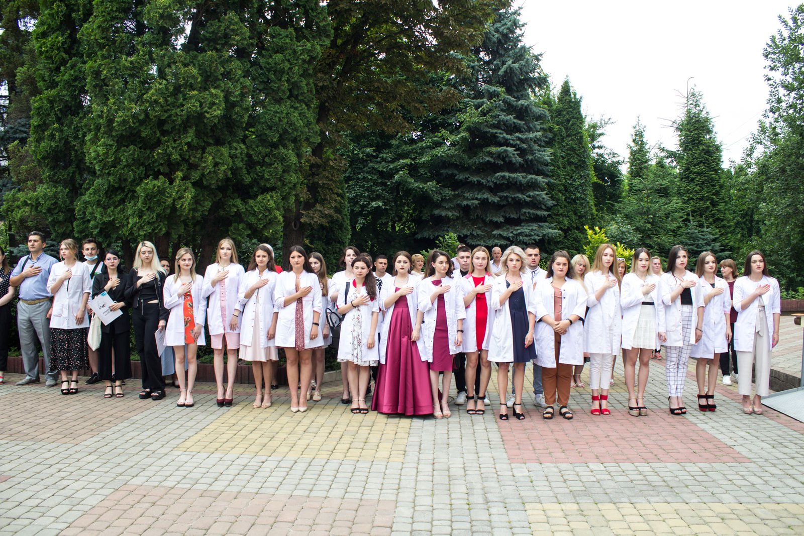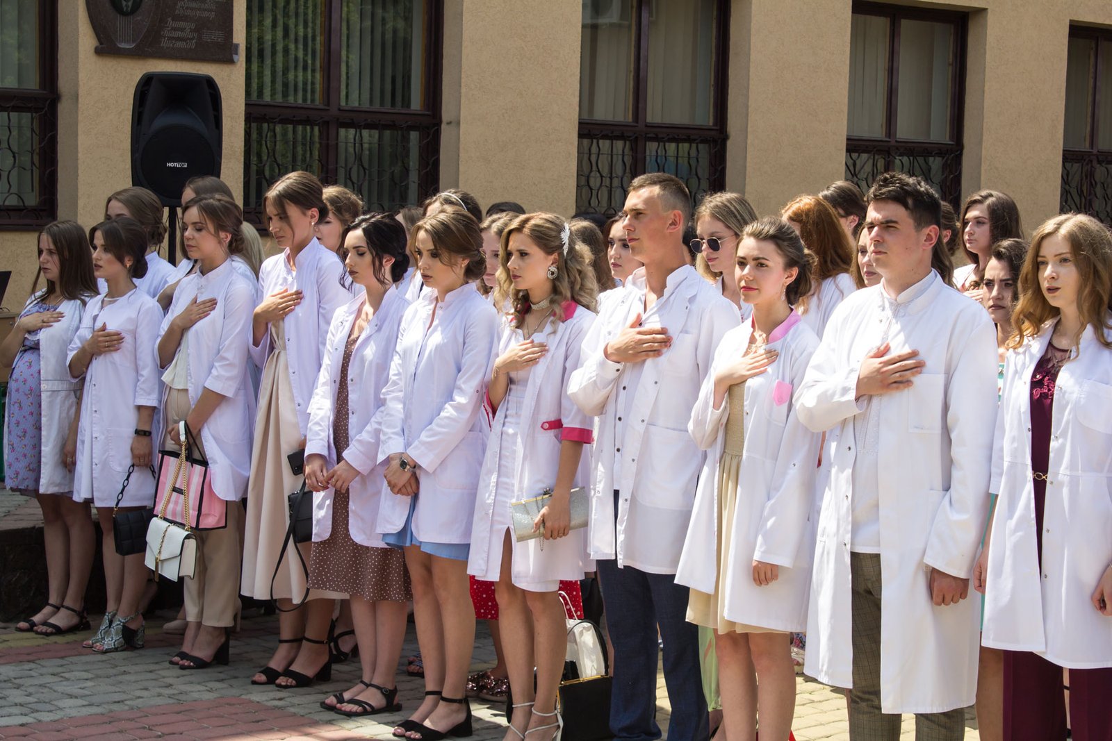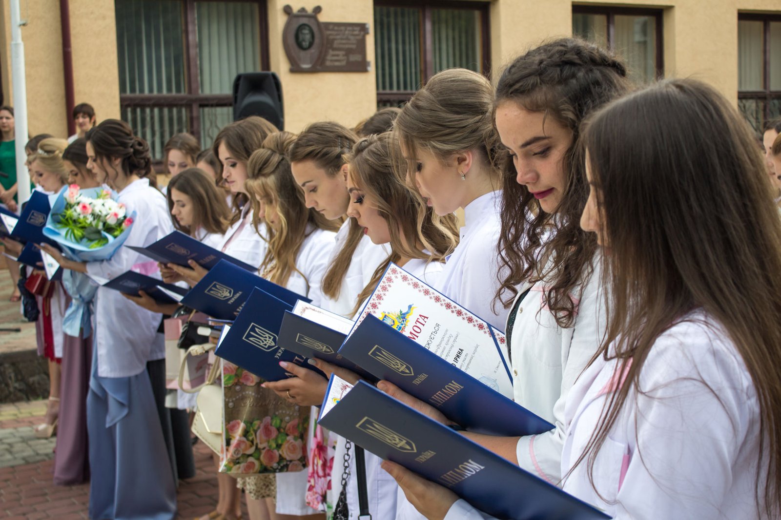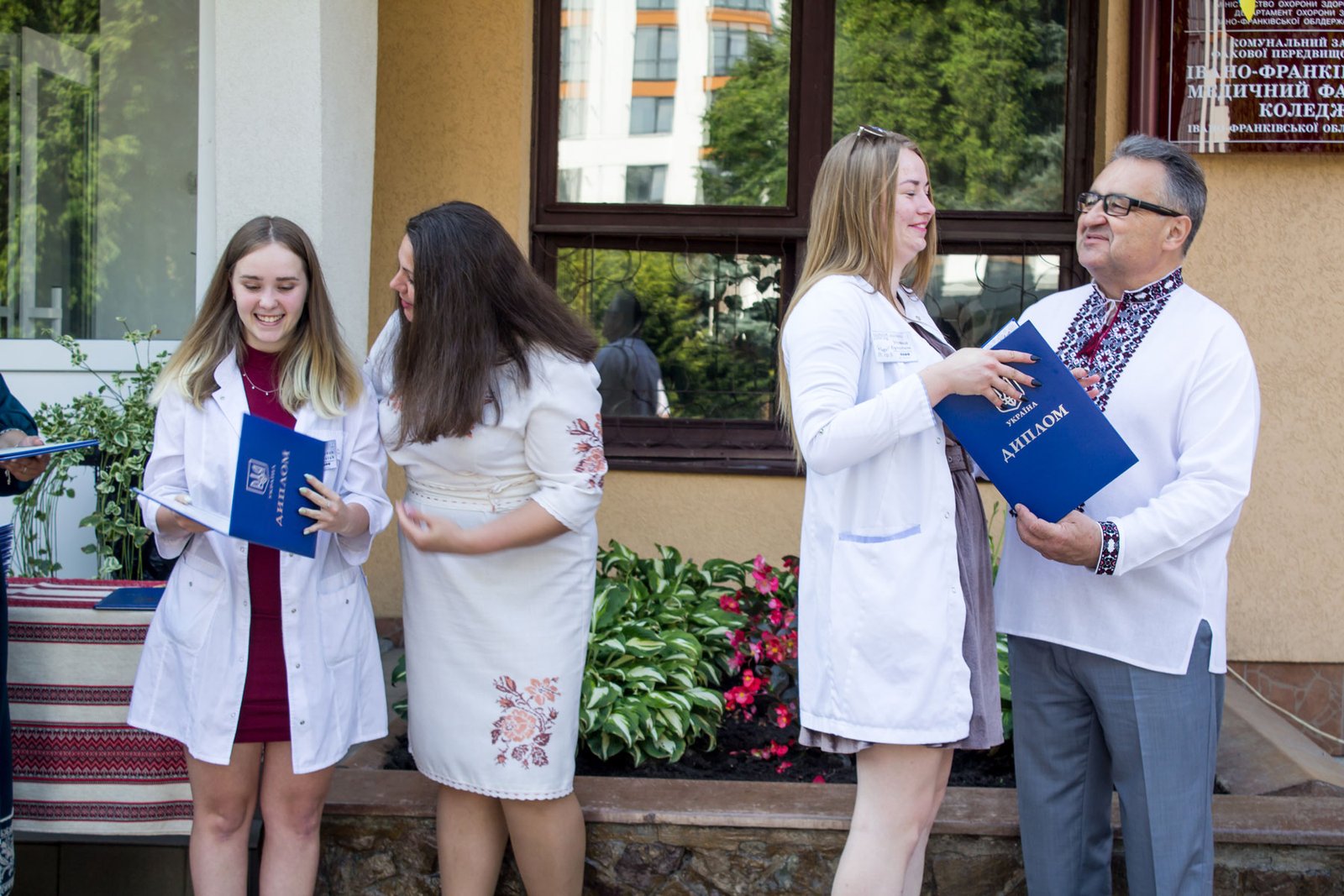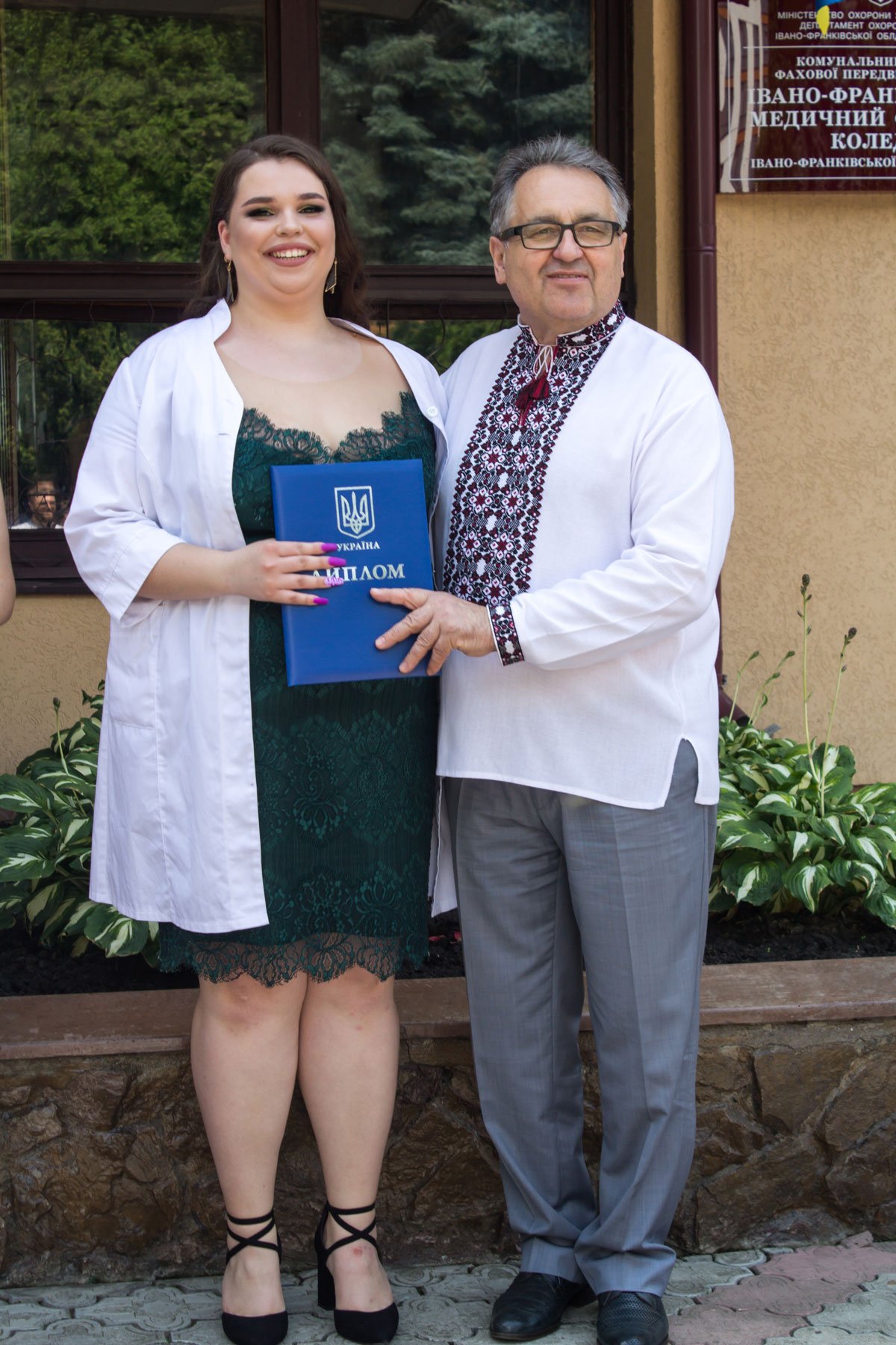 Згадували посвяту у першокурсники без двох місяців чотири роки тому – на подвір’ї перед навчальним корпусом і у білих халатах. Сьогодні на свято випускного теж зібралися не в залі і теж поверх ошатного вбрання одягли білі халати, як символ майбутньої професії. Це особливий день і для випускників, і для їхніх батьків, і для викладачів.