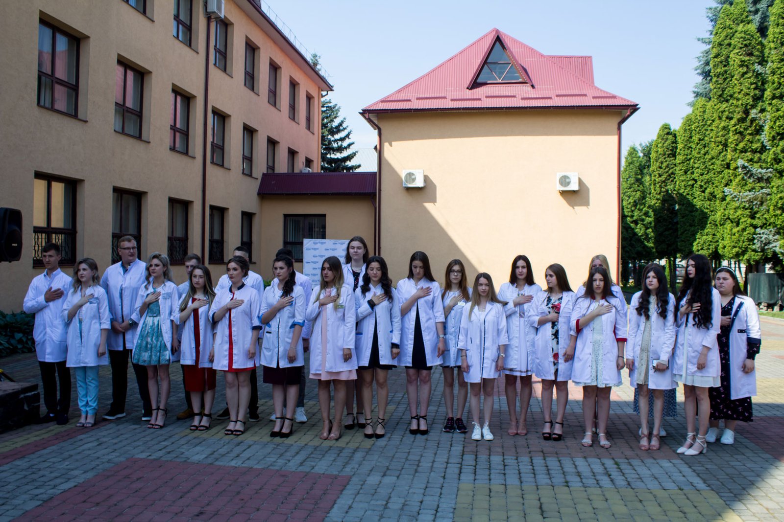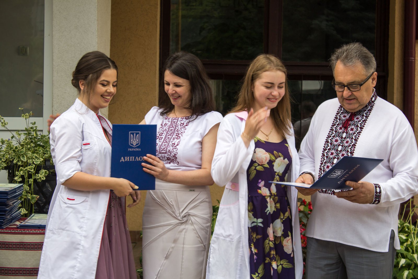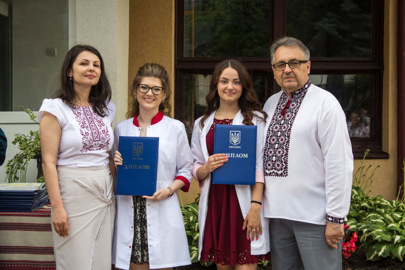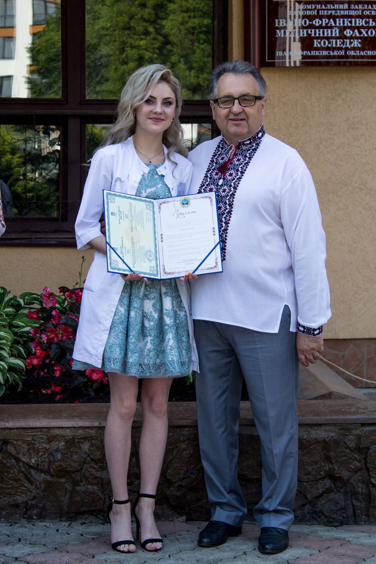 Згадували посвяту у першокурсники без двох місяців чотири роки тому – на подвір’ї перед навчальним корпусом і у білих халатах. Сьогодні на свято випускного теж зібралися не в залі і теж поверх ошатного вбрання одягли білі халати, як символ майбутньої професії. Це особливий день і для випускників, і для їхніх батьків, і для викладачів.