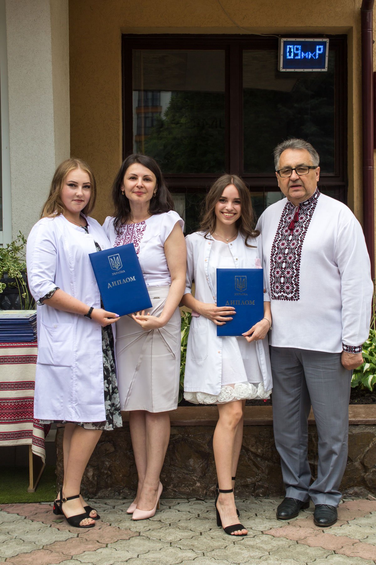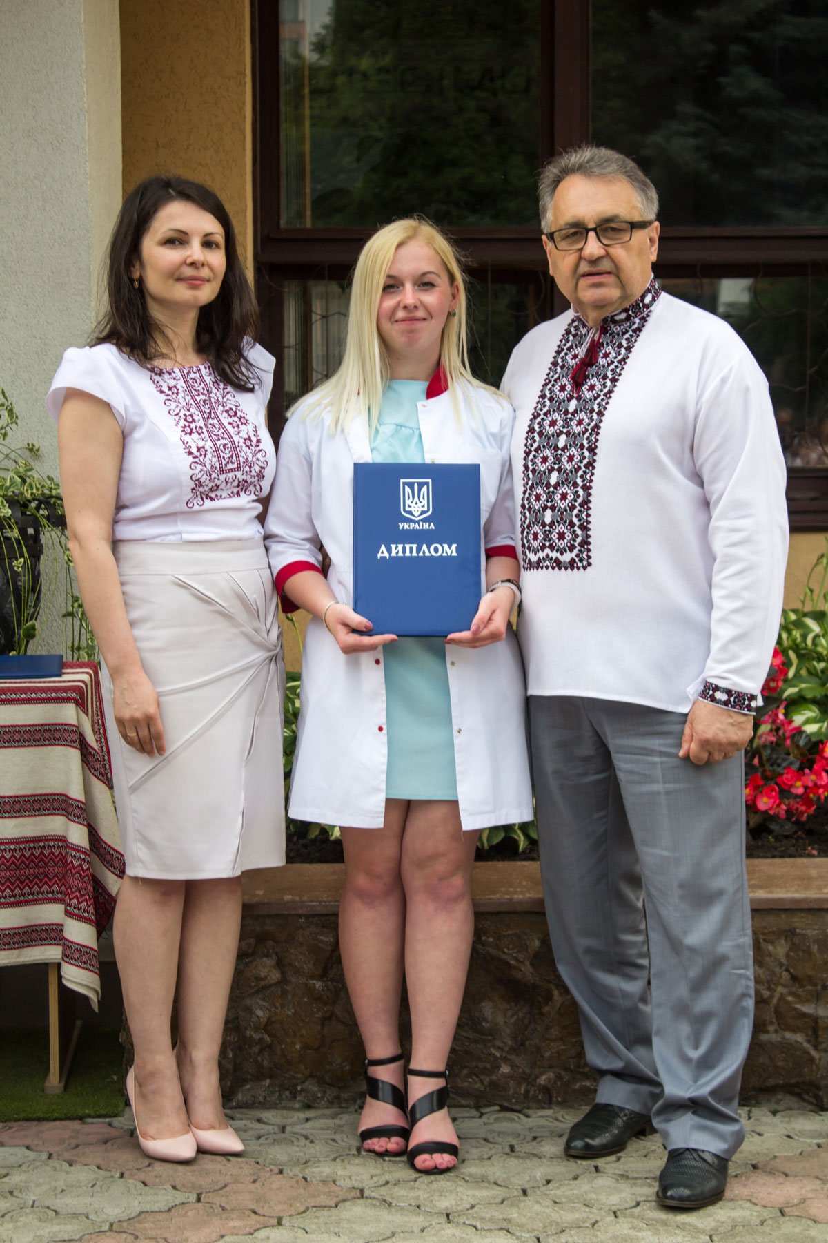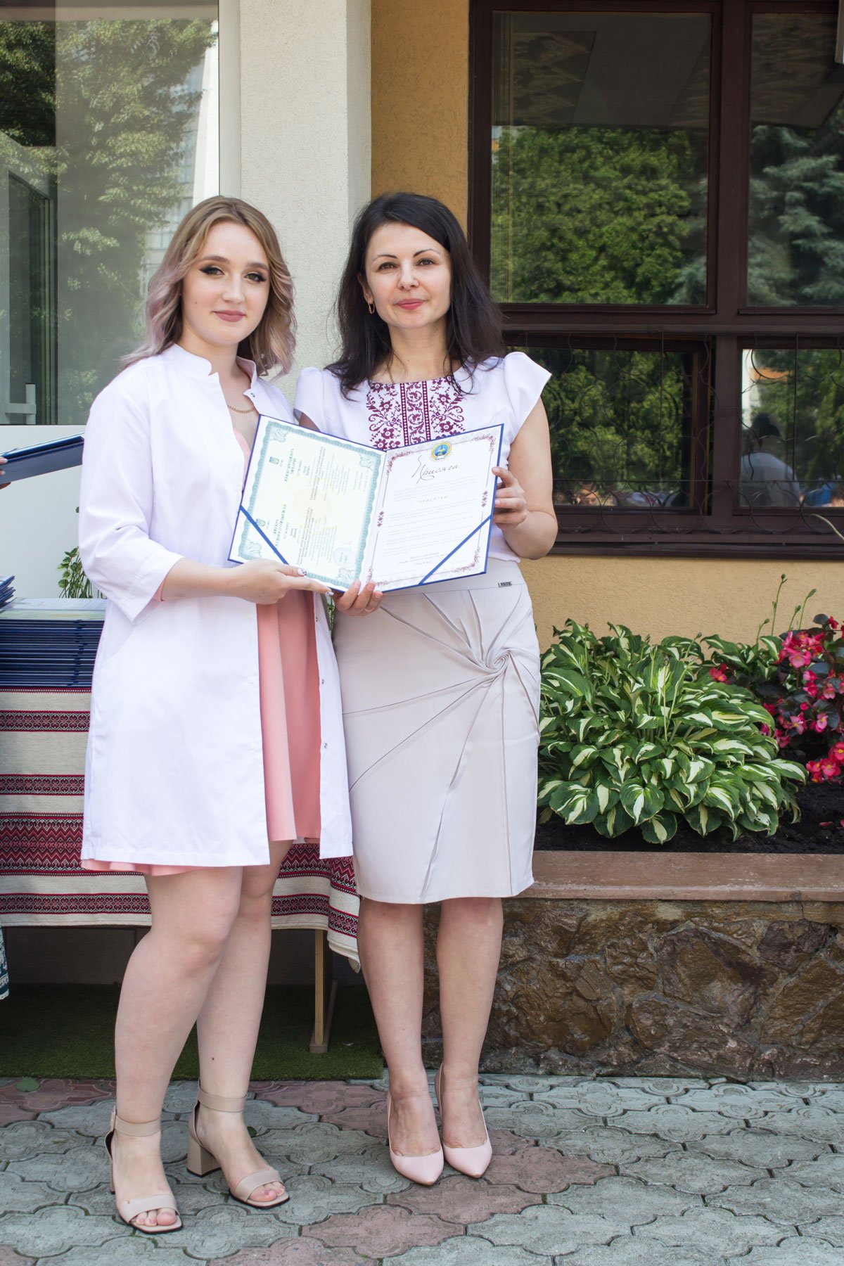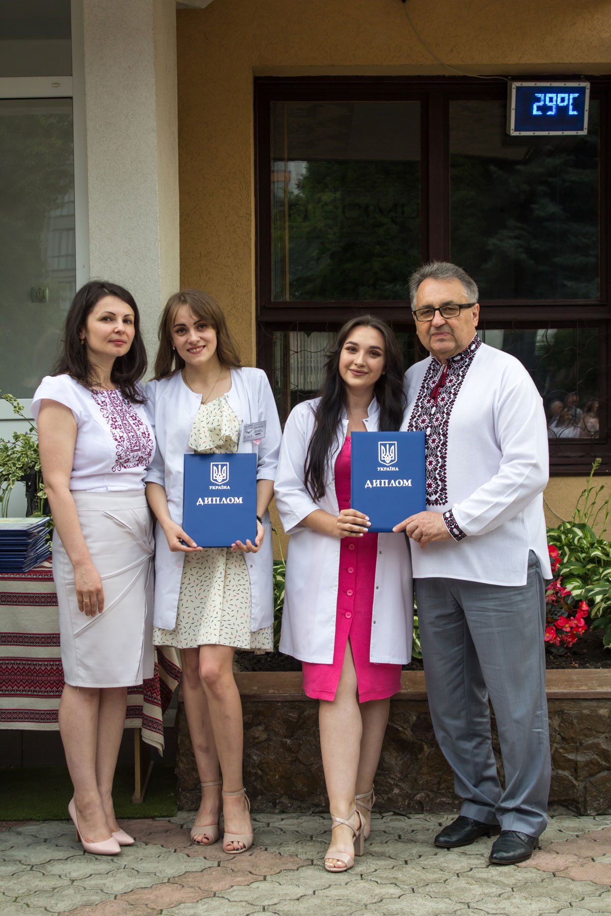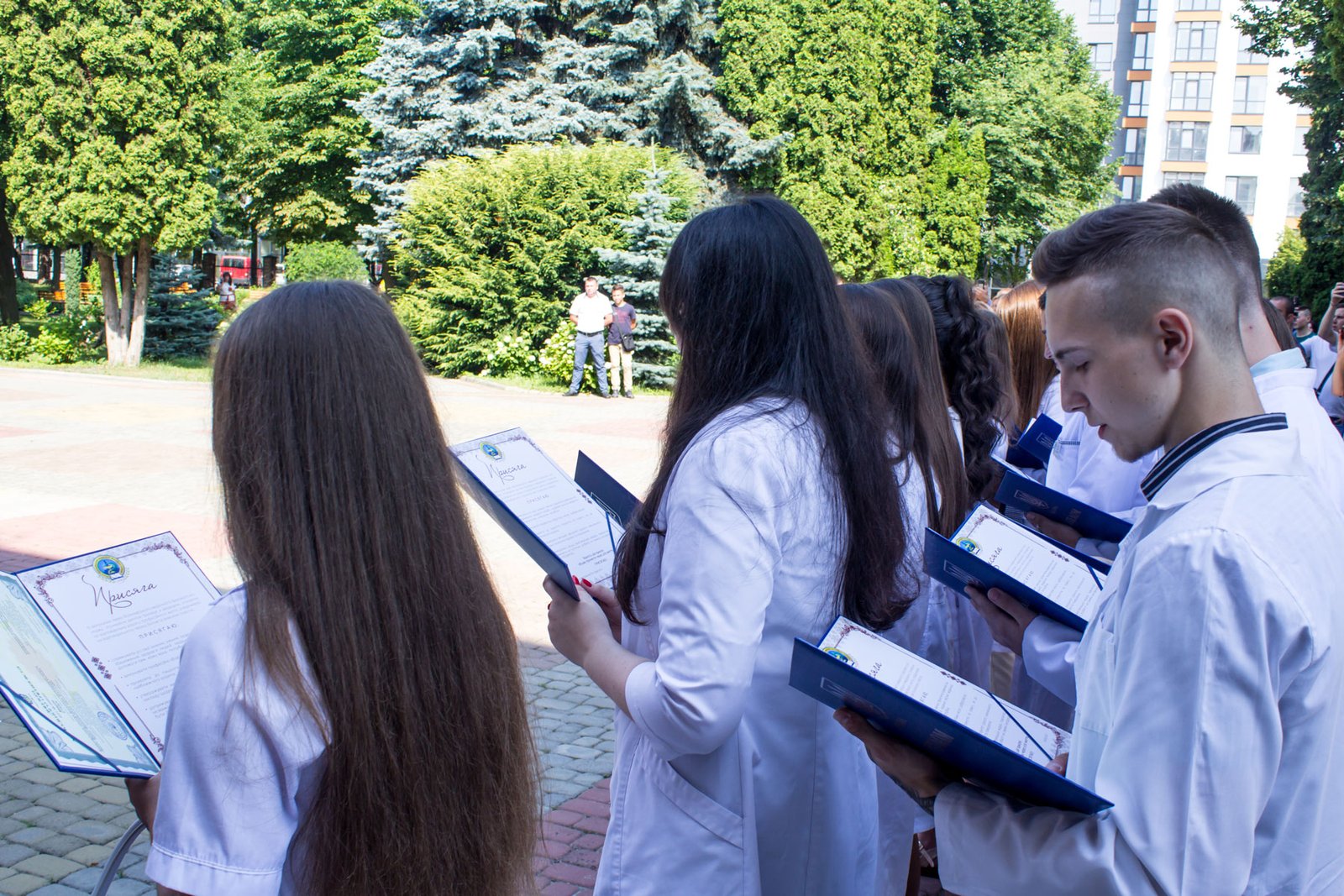 Згадували посвяту у першокурсники без двох місяців чотири роки тому – на подвір’ї перед навчальним корпусом і у білих халатах. Сьогодні на свято випускного теж зібралися не в залі і теж поверх ошатного вбрання одягли білі халати, як символ майбутньої професії. Це особливий день і для випускників, і для їхніх батьків, і для викладачів.