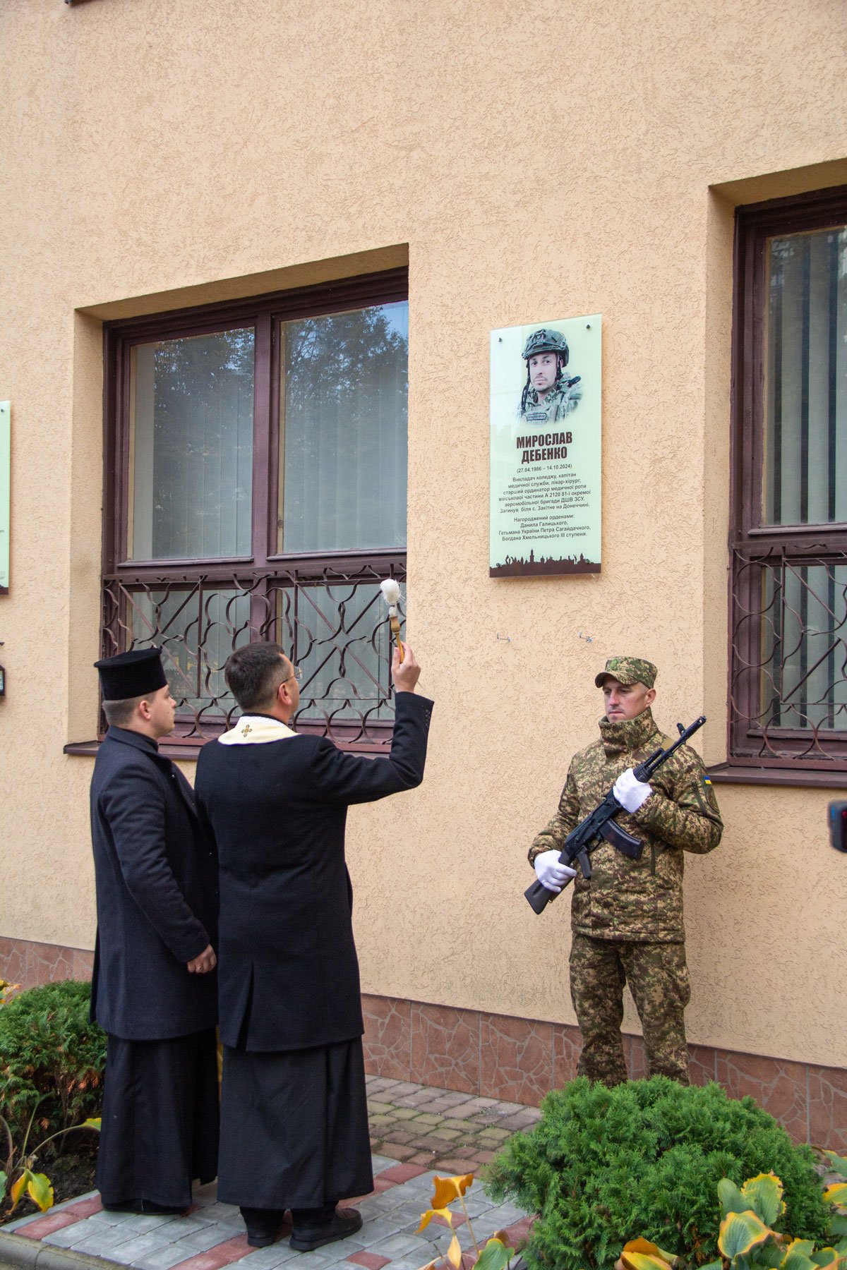 Пам’ятну дошку на фасаді коледжу відкрили мама Ольга ДЕБЕНКО, секретар Івано-Франківської міської ради Віктор СИНИШИН, директор ІФМФК Володимир СТАСЮК, а о. Йосафат БОЙКО і о. Андрій ЖУК освятили її.