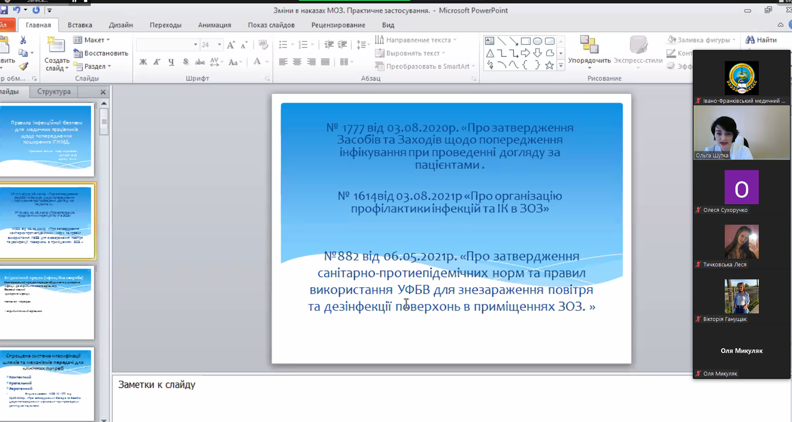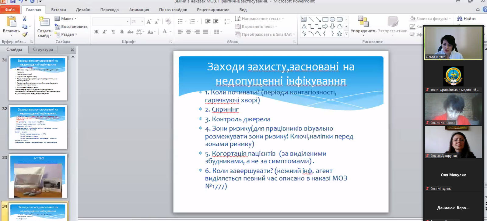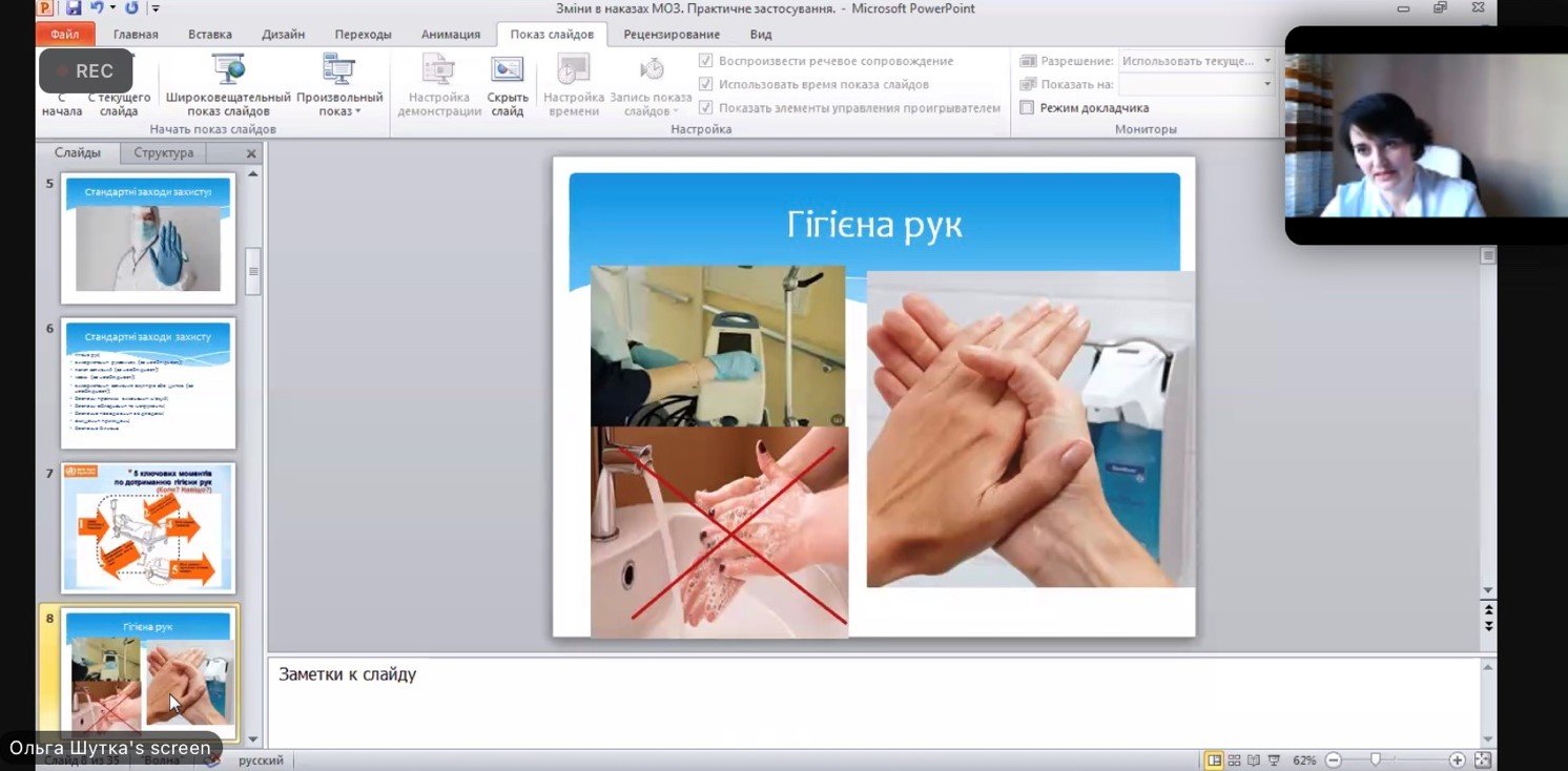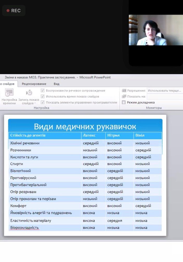 Як попередити поширення інфекцій під час виконання медичних маніпуляцій, як убезпечити себе і пацієнтів від інфікування, які основні заходи і засоби індивідуального захисту безпечні для медичного працівника, яких помилок варто уникати у своїй майбутній професійній діяльності – про це йшлося під час онлайн-навчання. За словами Ольги Курилець, «кожній медсестрі варто знати, як має бути правильно у повсякденному житті». При цьому лекторка акцентувала на змінах в діючих наказах МОЗ щодо інфекційної безпеки і їх практичному застосуванні.