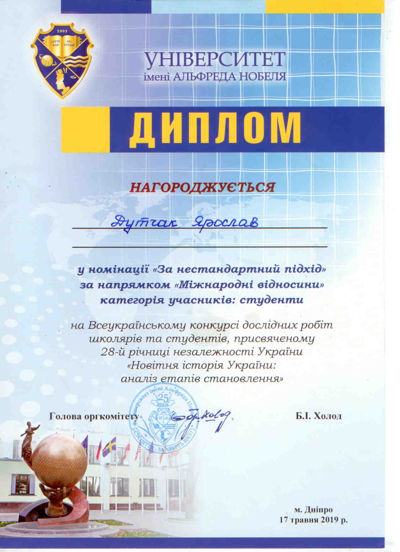 - Міжнародні відносини (Тема: «Східне партнерство» - інструмент політики ЄС) і був запрошений на захист конкурсних робіт, який проходив на базі Університету імені Альфреда Нобеля (м. Дніпро), де вже повторно гідно представляв власну дослідницьку роботу і став переможцем у номінації «За нестандартний підхід», а також зайняв четверте місце серед п’ятдесяти конкурсантів.