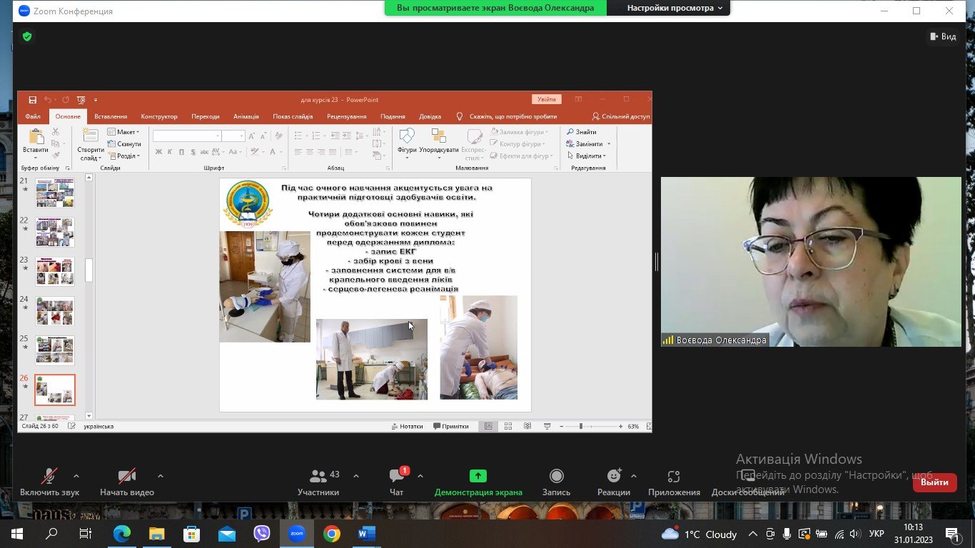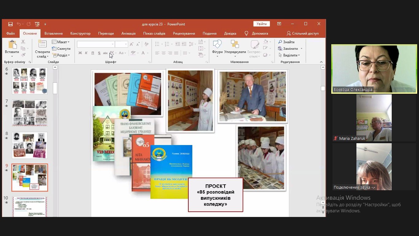 Заняття Олександра Денисівна розпочала невеличкою розповіддю про історію коледжу, створеного у 1939 році як фельдшерсько-акушерська школа, про видатних викладачів, які тут працювали, як от відомий прикарпатський композитор Дмитро Циганков, про випускників – переможців всеукраїнських конкурсів професійної майстерності. Саме зараз реалізується проєкт «85 розповідей випускників ІФМФК» до 85-річчя закладу освіту. До цього проєкту можуть долучитися і курсанти, які закінчували Івано-Франківське медичне училище чи медичний коледж. Адже для багатьох медсестер, фельдшерів, лаборантів, які зараз підвищують свою кваліфікації на базі відділення післядипломної освіти, це Alma mater.