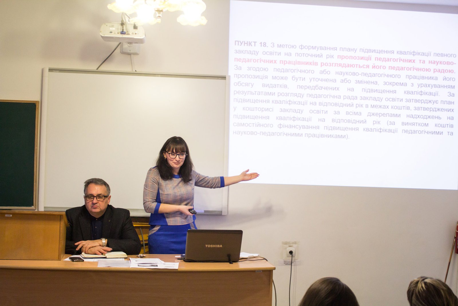 Інженер з охорони праці Гевюк В.В. у своєму виступі звернув увагу на проведення повторних інструктажів з охорони праці та безпеки життєдіяльності, а також ознайомив з правилами безпеки життєдіяльності та пожежної безпеки в осінньо-зимовий період та період канікул.