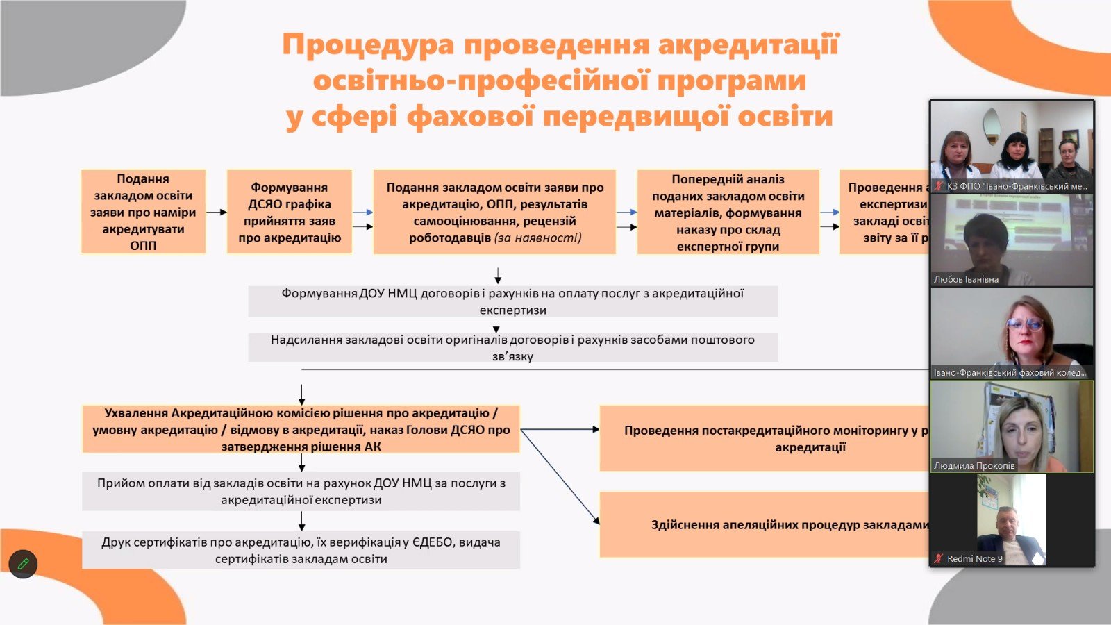 - Основні кроки до успішної акредитації освітньо-професійної програми з підготовки фахового молодшого бакалавра (доповідачі: експерти Державної служби якості освіти України з акредитації ОПП: Прокопів Людмила Ярославівна, завідувач практики Коломийського педагогічного фахового коледжу Івано-Франківської обласної ради та Оришко Світлана Петрівна, завідувач відділення Івано-Франківського коледжу фізичного виховання Національного університету фізичного виховання і спорту України).