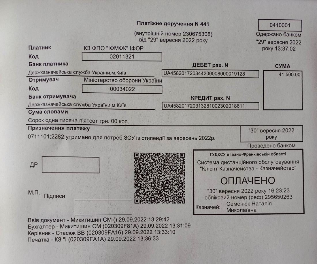 А студенти першого курсу перерахували з академічної стипендії 41 тисячу 500 гривень на рахунок Міністерства оборони України для потреб ЗСУ.