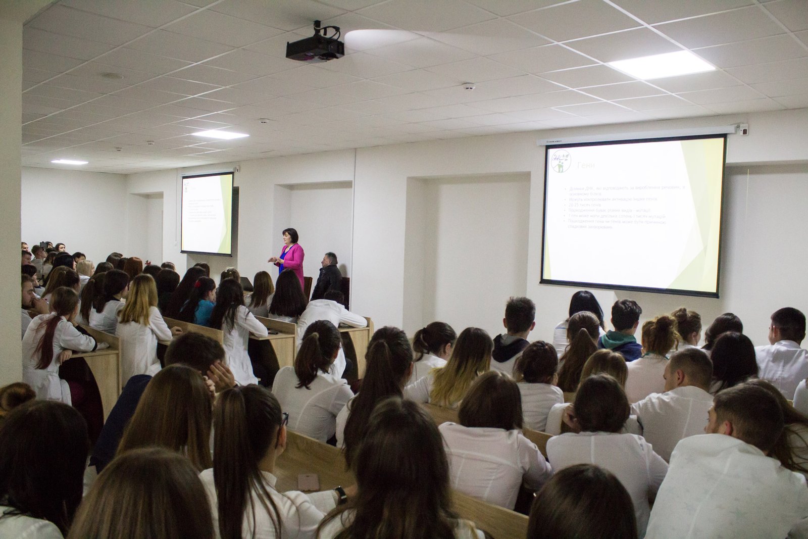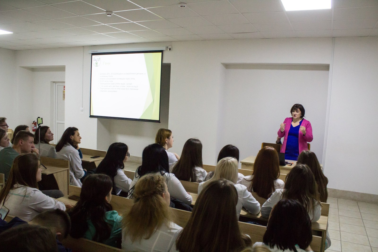 Пані Олена розповіла студентам про напрямки в генетиці: епігенетика, гени і злоякісні захворювання, фармакогенетика, генна інженерія (вакцини, ліки, репродуктивна медицина).