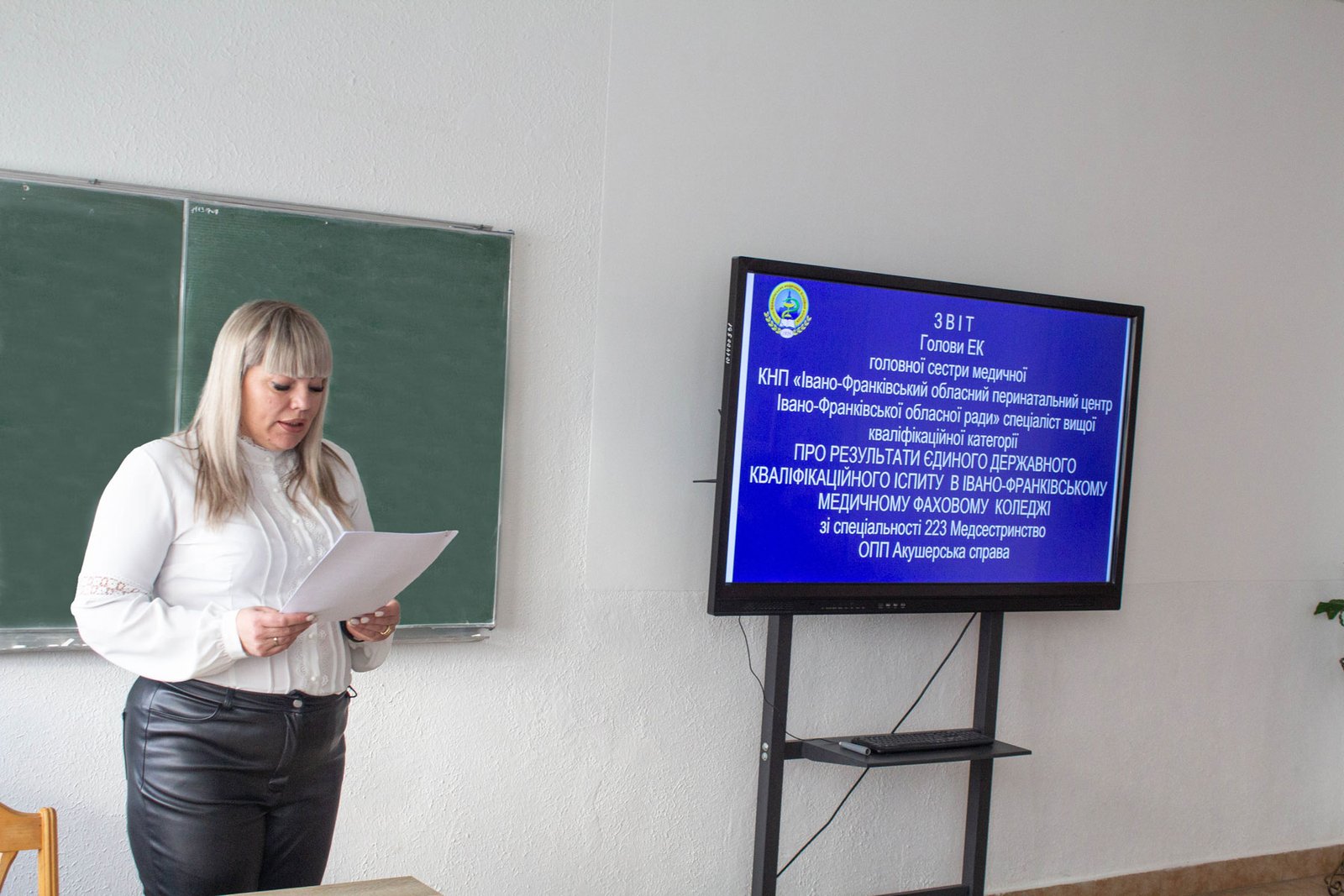 На засіданні малої педагогічної ради КЗФПО «Івано-Франківський медичний фаховий коледж» ІФОР (вул. Гетьмана Мазепи, 165) заслухано звіт голови екзаменаційної комісії про результати складання Єдиного державного кваліфікаційного іспиту зі спеціальності 223 Медсестринство ОПП Акушерська справа.
