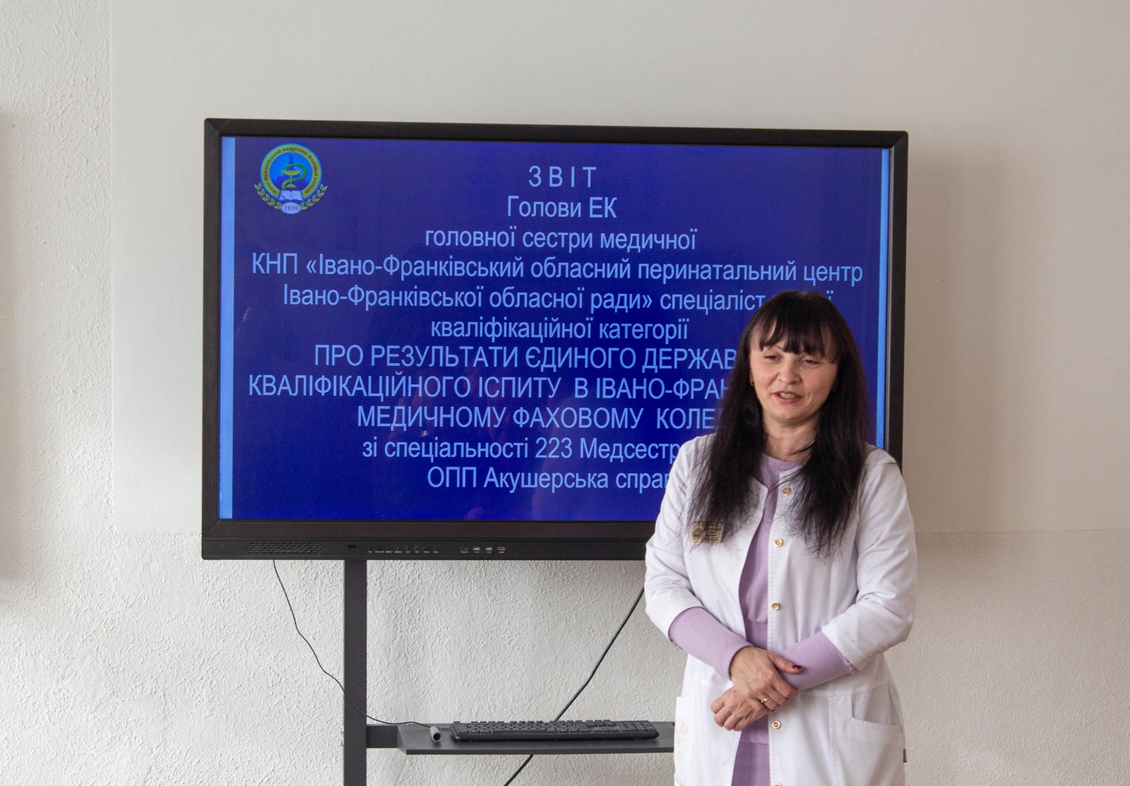 Атестація майбутніх акушерок проводилась у формі ЄДКІ, який складався з тестового та практично орієнтованого іспитів. Голова екзаменаційної комісії, головна медична сестра КНП «Івано-Франківський обласний перинатальний центр Івано-Франківської обласної ради» Галина Ярославівна СЕМЕНЧУК доповіла про результати складання ЄДКІ, а також обговорили недоліки та розробили пропозиції щодо їх усунення.